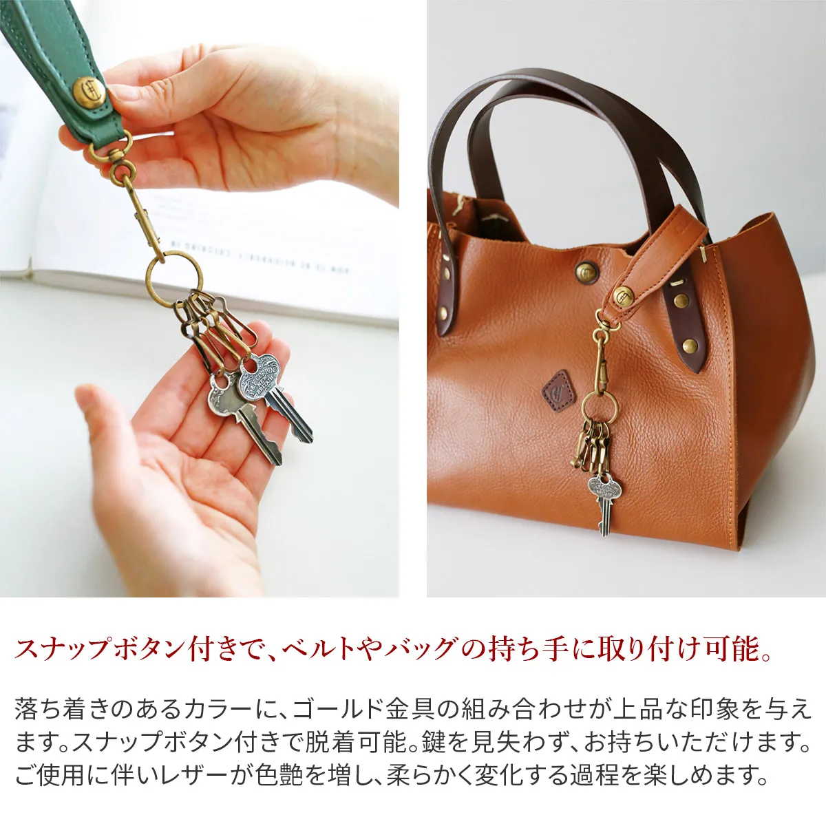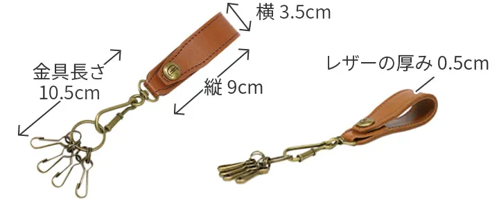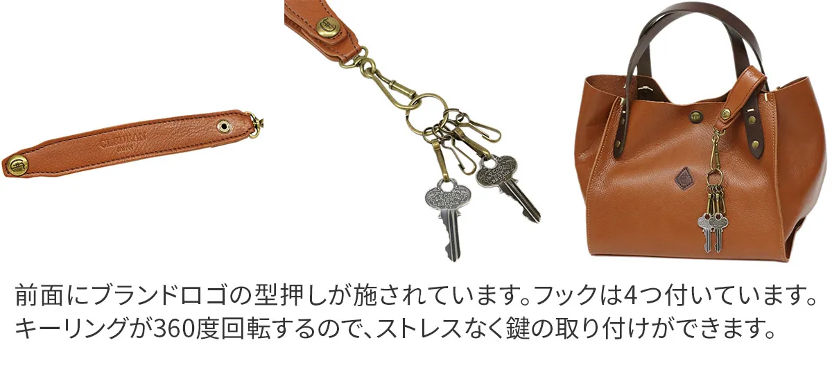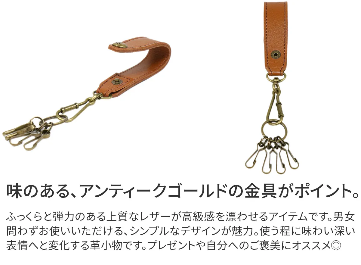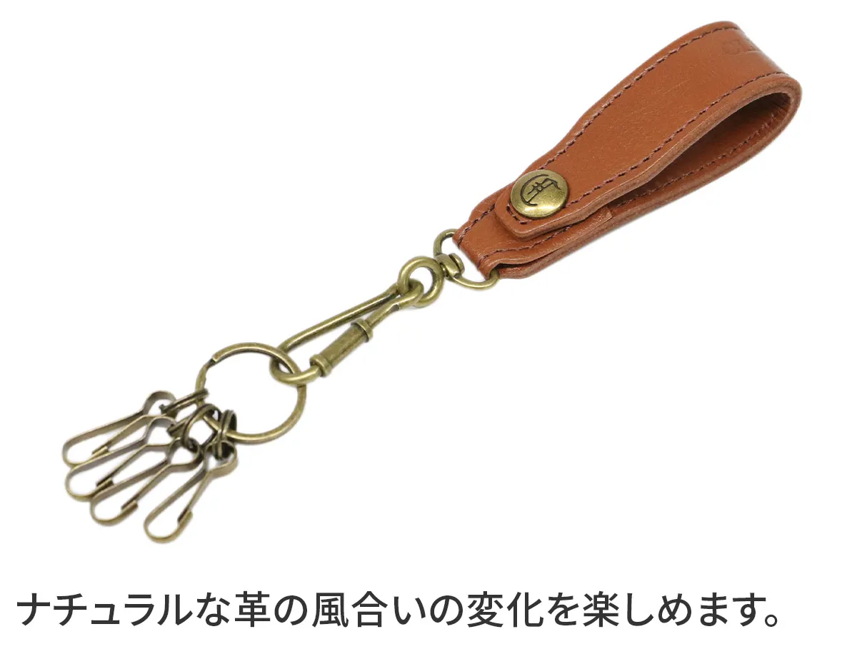 シンプルなデザインで、ユニセックスでお使いいただけるアイテムです。360度回転するキーリングに4つのフックが付いています。ベルトやバッグに取り付けができるホックボタン付きで、鍵が迷子にならず安心です。豊かなエイジングを楽しめる革小物です。