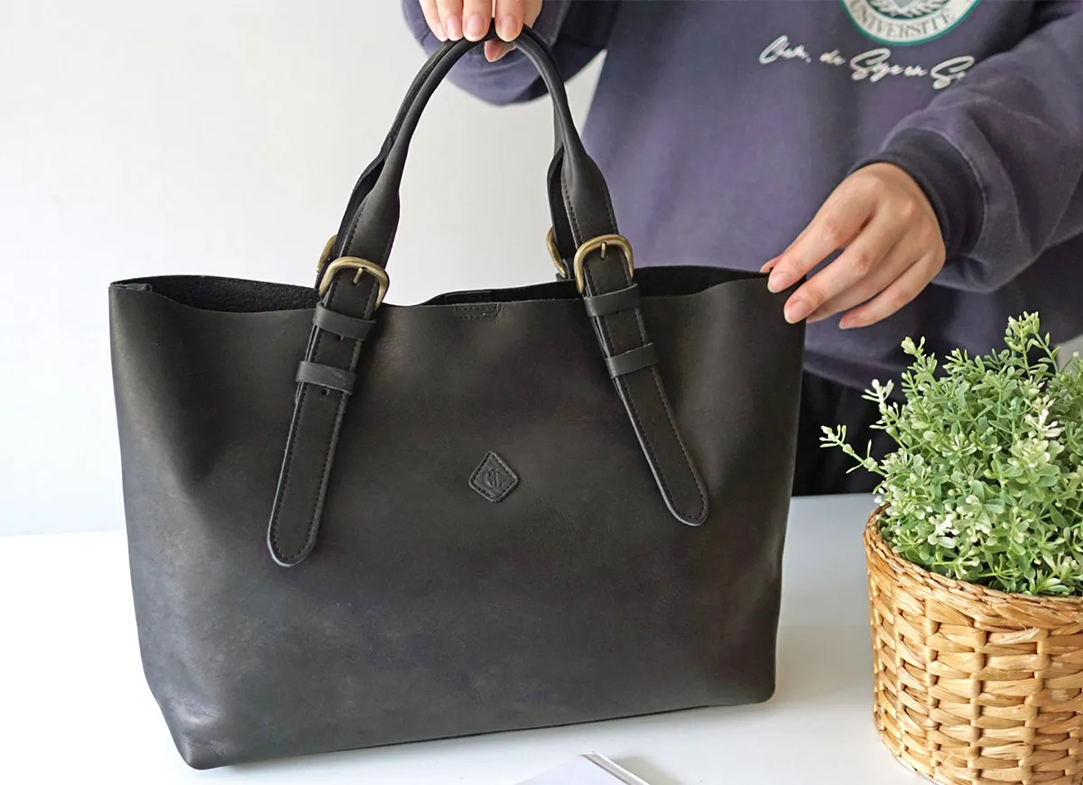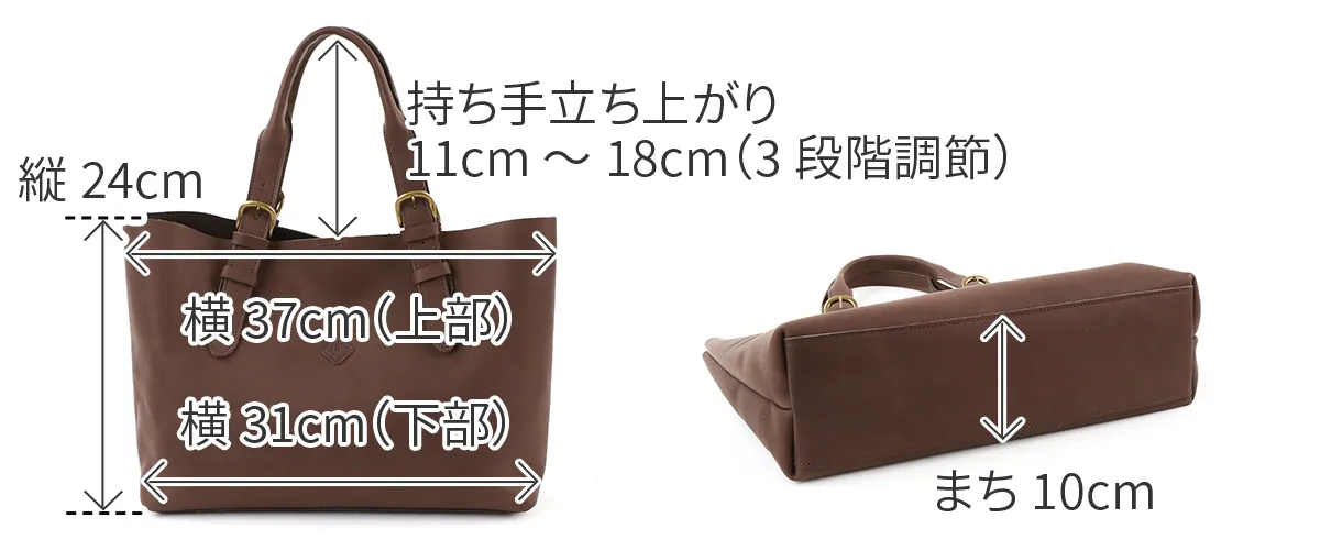 ソフトな牛革を使用した、デイリー使いに最適なA4サイズが収まるトートバッグです。 シックな佇まいにアンティーク調のゴールド金具がレトロな雰囲気を演出。 持ち手の長さを3段階で調節できる便利の良さで、 肩掛けから手持ちとお好きな長さに対応できます。 落ち着きのあるカラーバリエーションで、様々なコーデと好相性のアイテムです。 ※一枚革の性質上、側面・裏面は繊維が立ち上がる毛羽立ちが発生し、摩擦にて衣類が傷んでしまう場合がございますので、お取り扱いにはご注意ください。