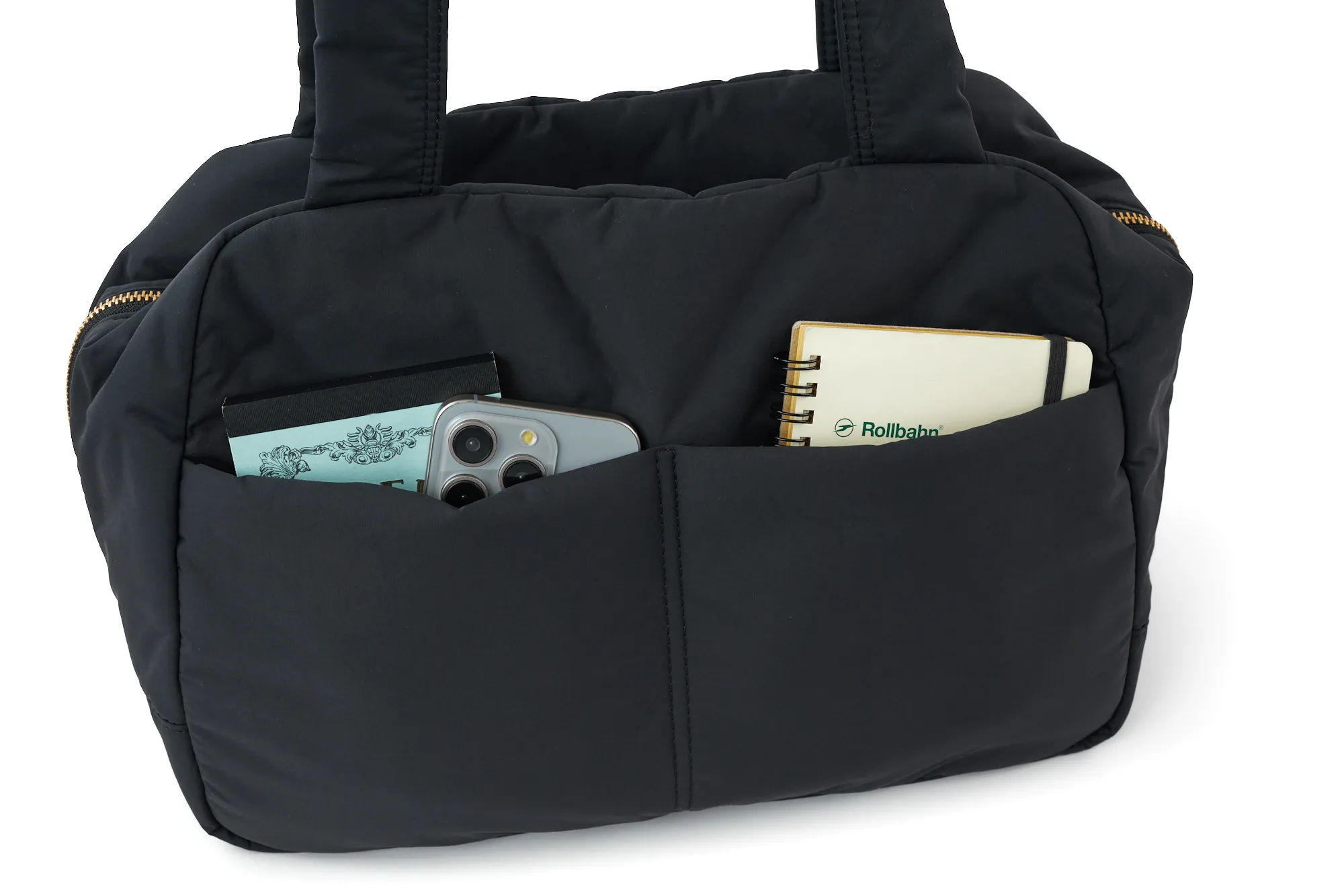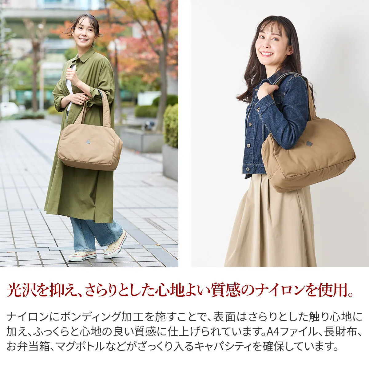 ふかふかした心地よいタッチ感が特徴の軽量のナイロンを使用したトートバッグです。 光沢を抑えた上品な質感なのでシーン問わず気楽に持ち出せます。 A4書類がスッキリ収まるサイジングで、通勤通学などデイリーにお使いいただけます。 シンプルながらポケットを豊富に備えた機能的なアイテムです。