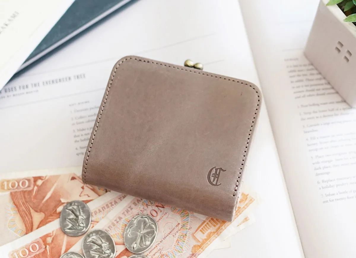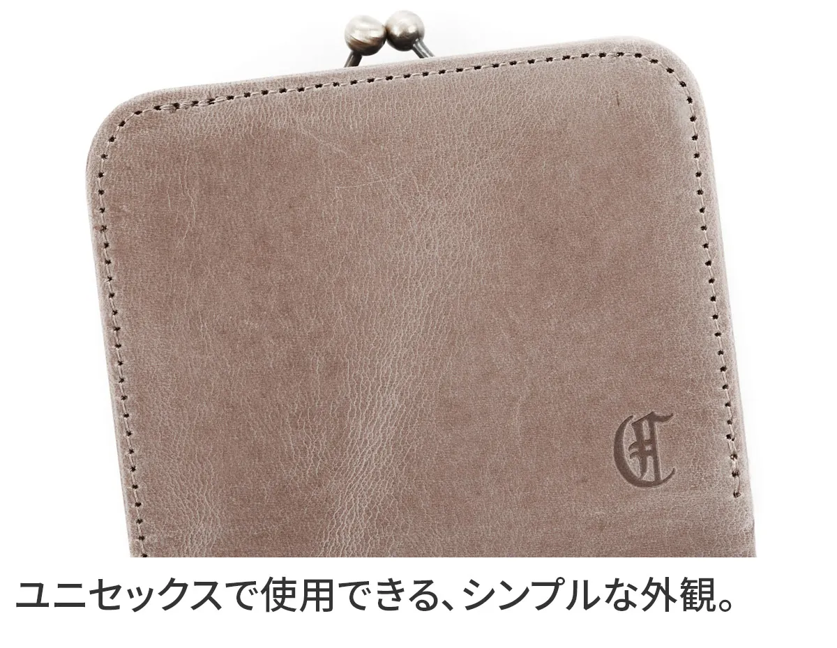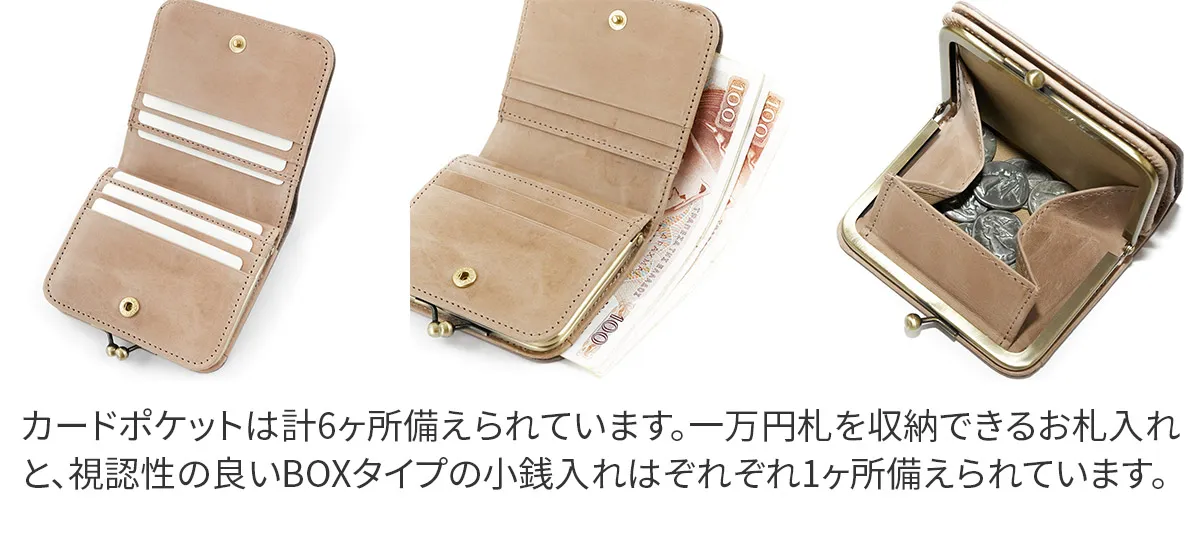 スムースレザーがそっと手に馴染む、優しいカラーバリエーションで揃えたがま口ウォレット。アンティーク調ゴールド金具は大人っぽく、レザーとの相性が抜群です。スナップボタンを開けると、カードポケットが6ヶ所現れます。一目で見渡せ、出し入れが楽にできます。お札入れとBOXタイプの小銭入れは各1ヶ所ずつ備えられており、シンプルな仕様で使い勝手の良いアイテムとなっています。