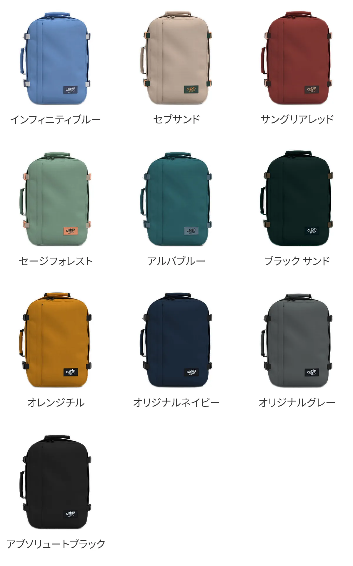 カラー インフィニティブルー、セブサンド、サングリアレッド、セージフォレスト、アルバブルー、ブラックサンド、オレンジチル、オリジナルネイビー、オリジナルグレー、アブソリュートブラック