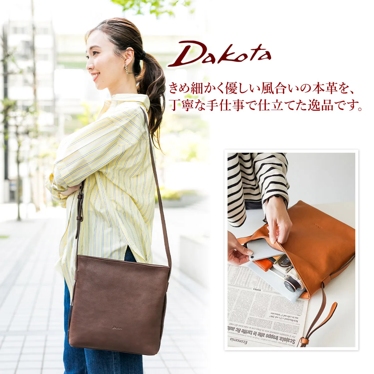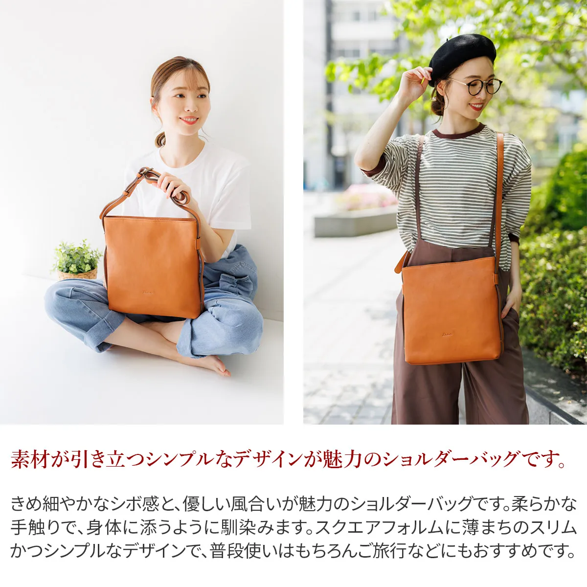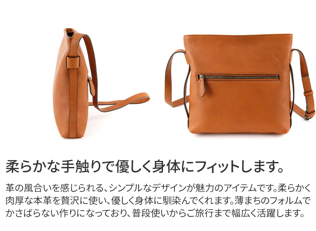 ソフトで上質感のある風合いが特徴のシリーズです。素材感を生かしてシンプルで飽きのこないデザインにしました。大人カジュアルとしてデイリーにご使用いただけます。 きめ細やかなシボ感と、優しい風合いが魅力のショルダーバッグです。柔らかな手触りで、身体に添うように馴染みます。スクエアフォルムに薄まちのスリムかつシンプルなデザインで、普段使いはもちろんご旅行などにもおすすめです。