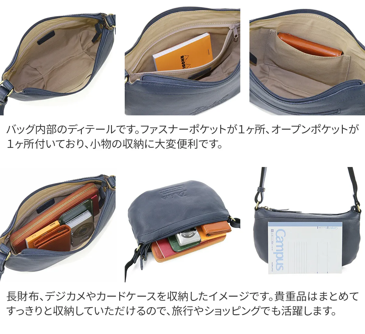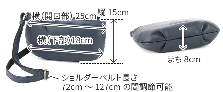 軽量でソフトな牛革を使用したデイリーユースなシリーズ。サイズ感やフォルムにこだわりつつ、素材の軽さを活かした作りで、毎日のコーディネートに合わせやすいようにデザインはシンプルに仕上げられています。 ちょっとしたお出掛けやお買い物、旅行にもおすすめの薄マチで体にフィットし、アクティブに動きやすいショルダーバッグです。 横長なので、長財布も収納可能。財布やスマホなどお出掛けの必需品を入れていただける小さめサイズです。ショルダーベルトは72cm~127cmの間で自由に調節していただけ、肩がけや斜めがけでお持ちいただけます。