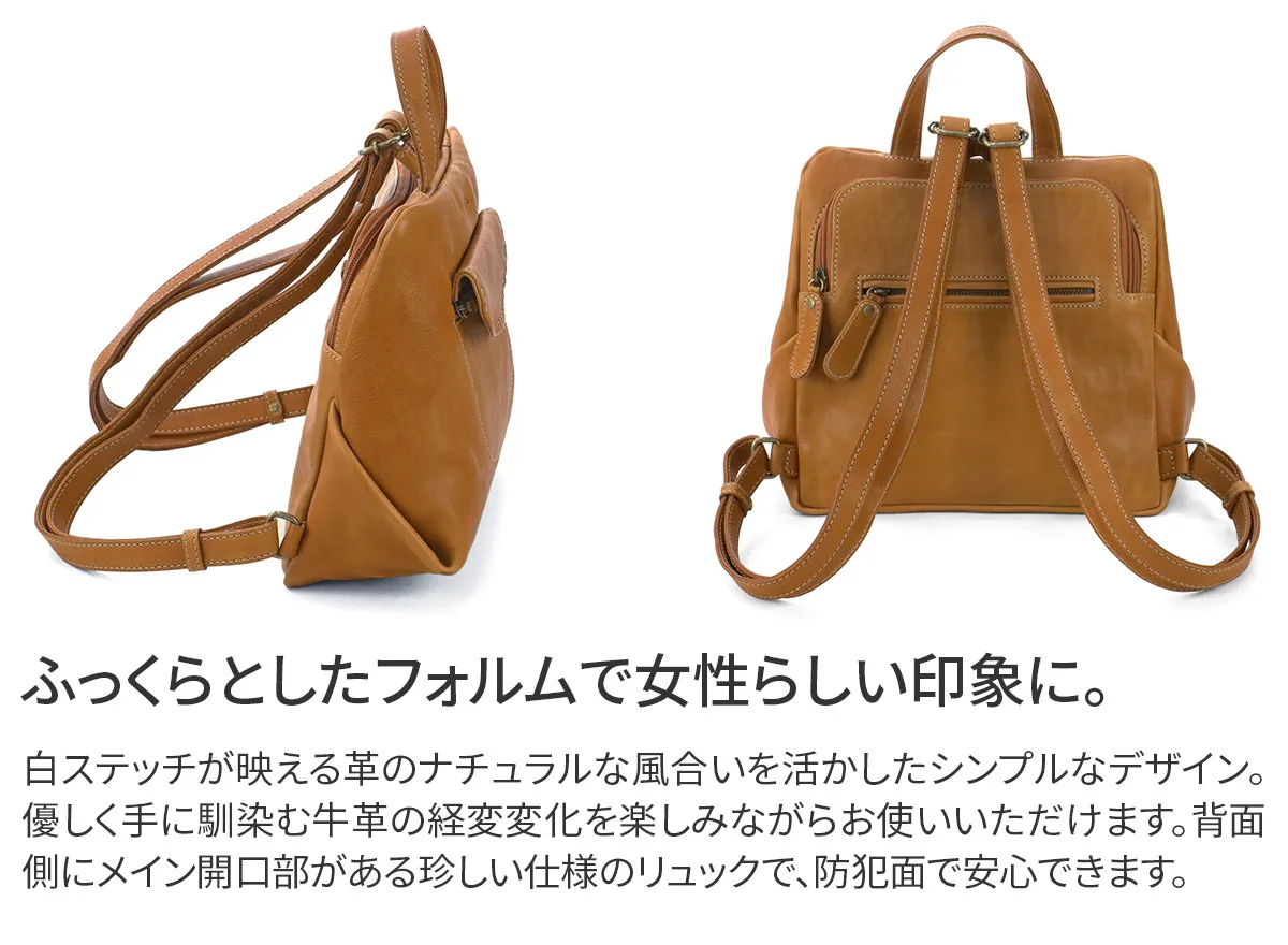 熱を加えながら加工するヒートドラムを使用し、ふっくらさせた革でカジュアル感を表現したデイリーシリーズです。製品にしてからひとつひとつ手作業でバフ加工を施すので同じものがふたつとないクラフト感が魅力です。 ステッチが入った大きめのポケットがポイントのリュックです。背中に映える愛らしいサイズ感と上品な革の風合いが、カジュアルなスタイルも上品に魅せます。500mlのペットボトルが縦に収納でき、長財布もしっかりと収納できるのでタウンユースからレジャーまで幅広く活躍します。優しく手に馴染む牛革の経変変化を楽しみながらお使いいただけます。