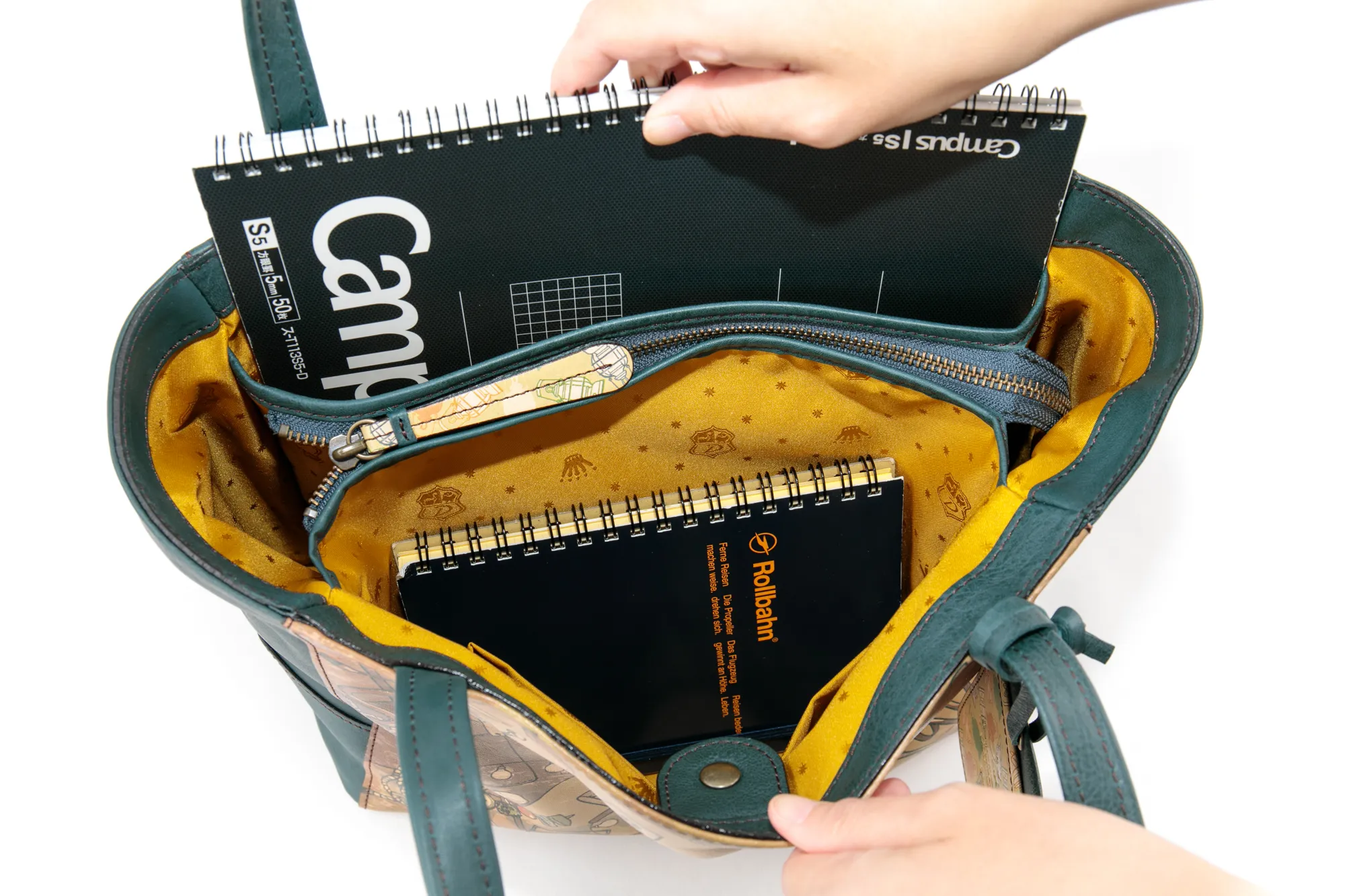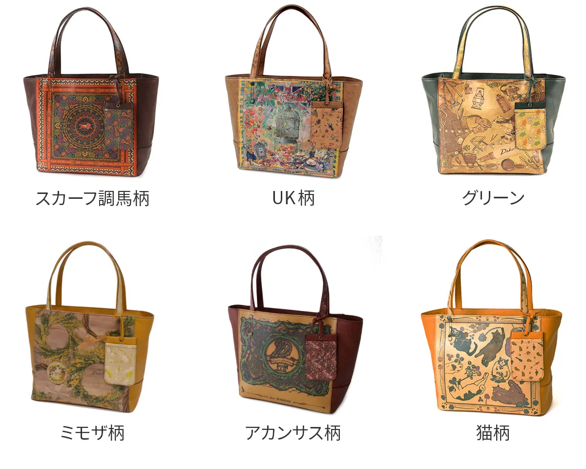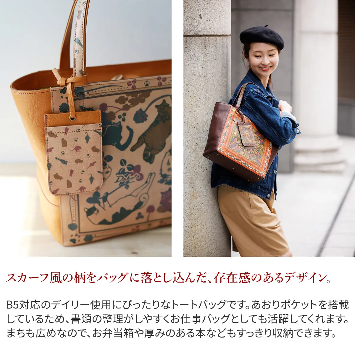「大人のおしゃれキャンプ」がテーマ。 革小物でDakota風にアレンジしたキャンプグッズを散りばめてスカーフ風の柄に仕上げました。 自然と共に過ごす穏やかなひとときを思い出させてくれるリラクシングなシリーズです。 ソフトな手触りの牛革に、プリントデザインが映える逸品です。 ファスナー式のメイン開口部両サイドにオープンポケットが備えられており、 書類や普段使いに必要な荷物の整理に大変便利です。 収納力に優れており、普段使いにちょうどいいサイズ感が魅力のトートバッグです。