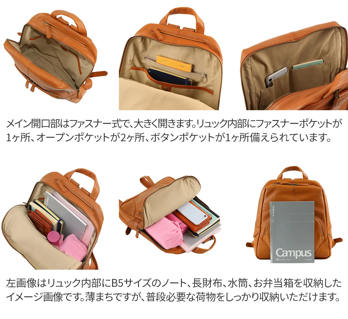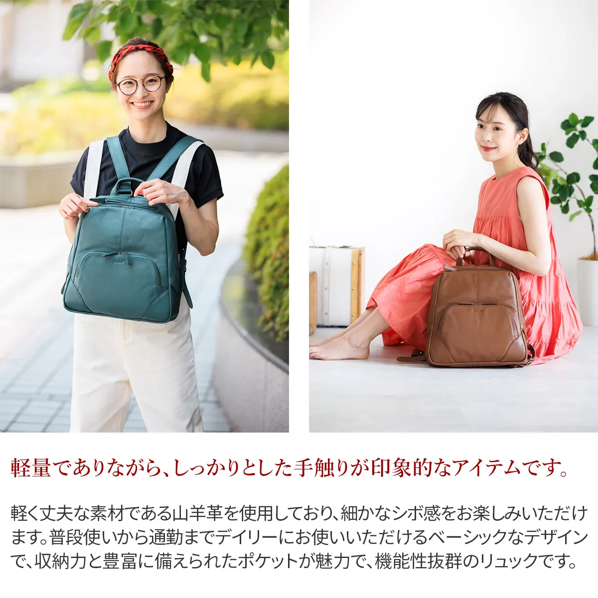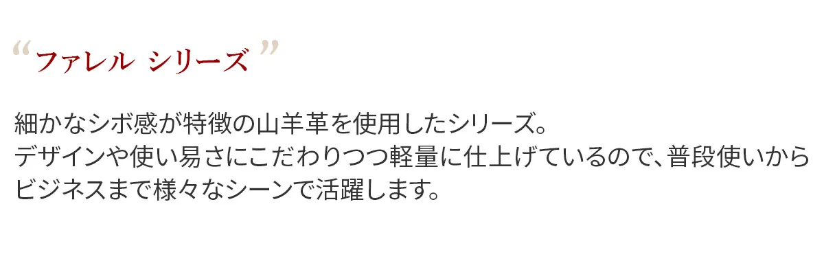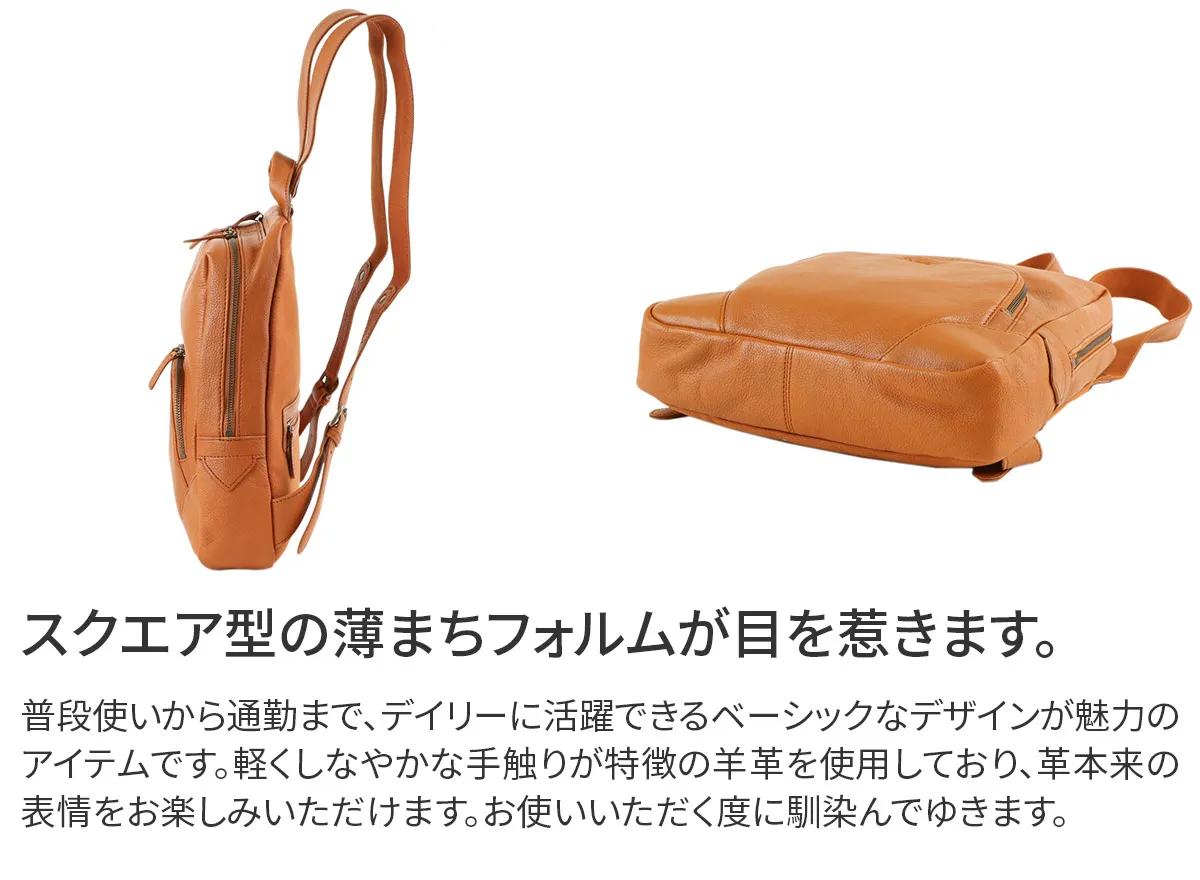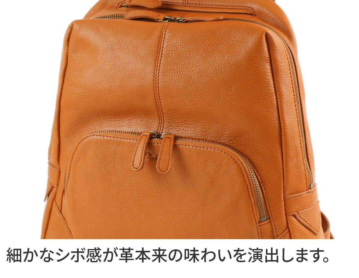 細かなシボ感が特徴の山羊革を使用したシリーズ。 デザインや使い易さにこだわりつつ軽量に仕上げているので、普段使いからビジネスまで様々なシーンで活躍します。 軽く丈夫な素材である山羊革を使用しており、細かなシボ感をお楽しみいただけます。普段使いから通勤までデイリーにお使いいただけるベーシックなデザインで、収納力と豊富に備えられたポケットが魅力で、機能性抜群のリュックです。