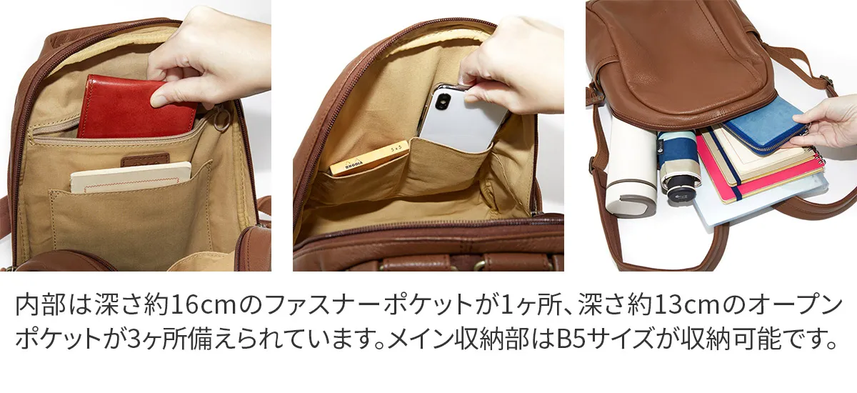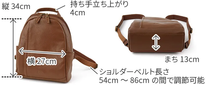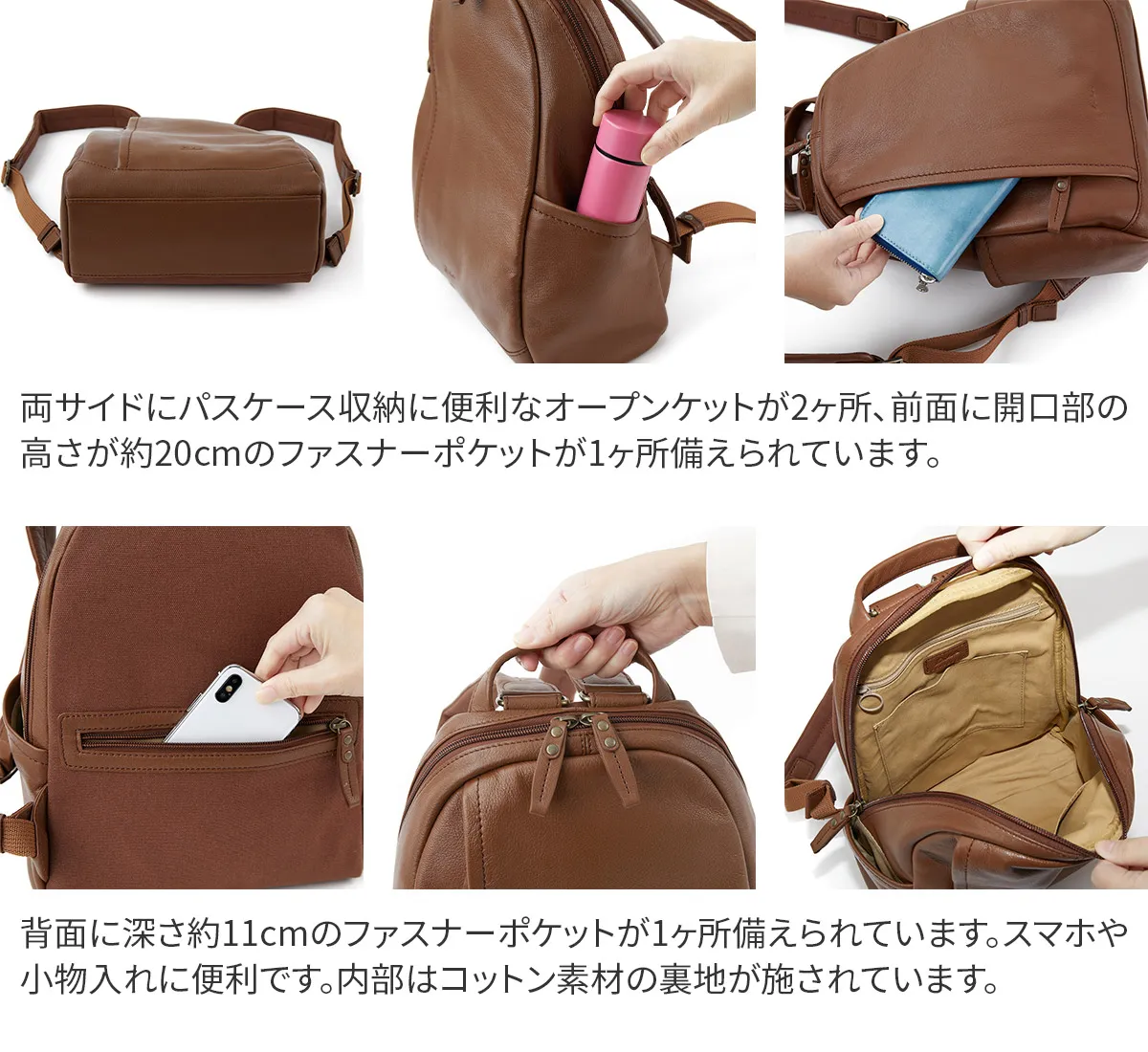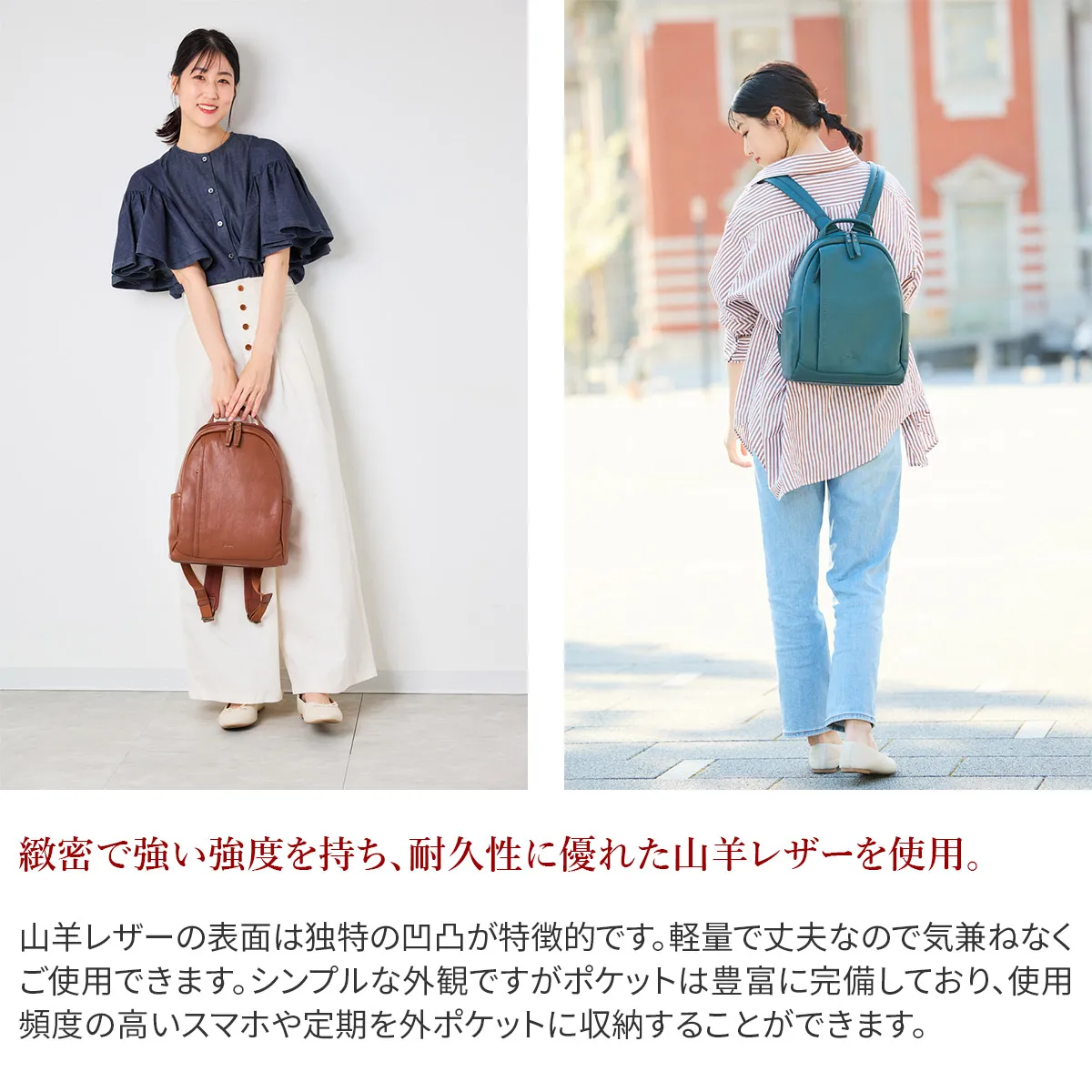 細かなシボ感が特徴の山羊革を使用したシリーズ。 デザインや使い易さにこだわりつつ軽量に仕上げているので普段使いからビジネスまで様々なシーンで活躍します。 オールレザーでシンプルなデザインが、洗練された印象を与る、ユニセックスでご使用できる大人リュック。ファスナー式のメイン開口部は大きく開き出し入れがスムーズに行えます。また、外側内側とも豊富なポケットが完備しており利便性の良い造りとなっています。