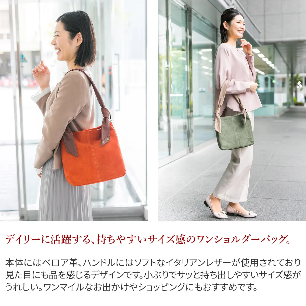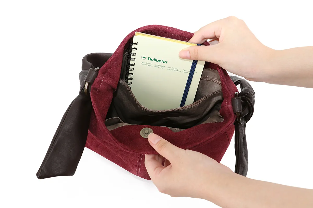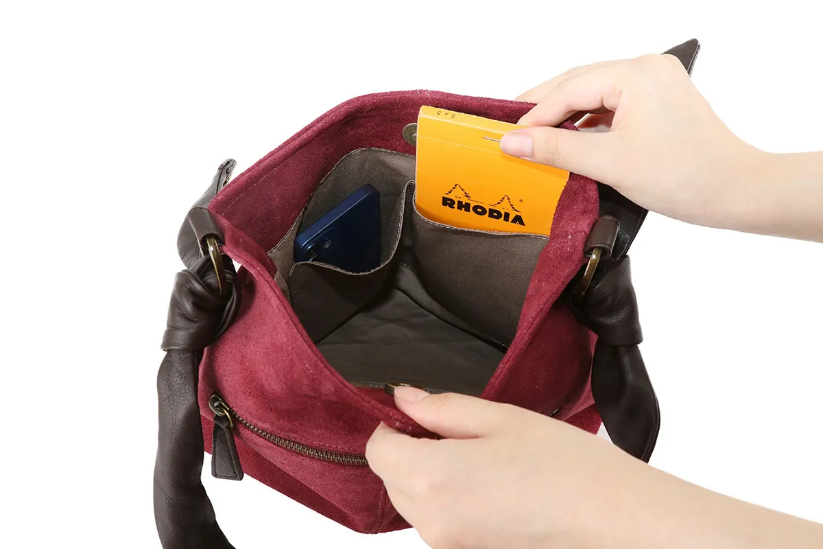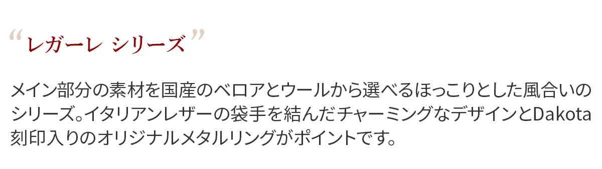 メイン部分の素材を国産のベロアとウールから選べるほっこりとした風合いのシリーズ。 イタリアンレザーの袋手を結んだチャーミングなデザインとDakota 刻印入りのオリジナルメタルリングがポイントです。 表素材に牛起毛革(ベロア)を使用したワンショルダーバッグです。 付属のハンドル部分にはソフトな質感の牛革を採用し、異素材をお愉しみいただけるアイテムになっています。 開口部はマグネット開閉になっており、中身の出し入れもスムーズです。 ややコンパクトな仕上がりで、休日のお出かけやショッピングなどデイリー使いに最適。