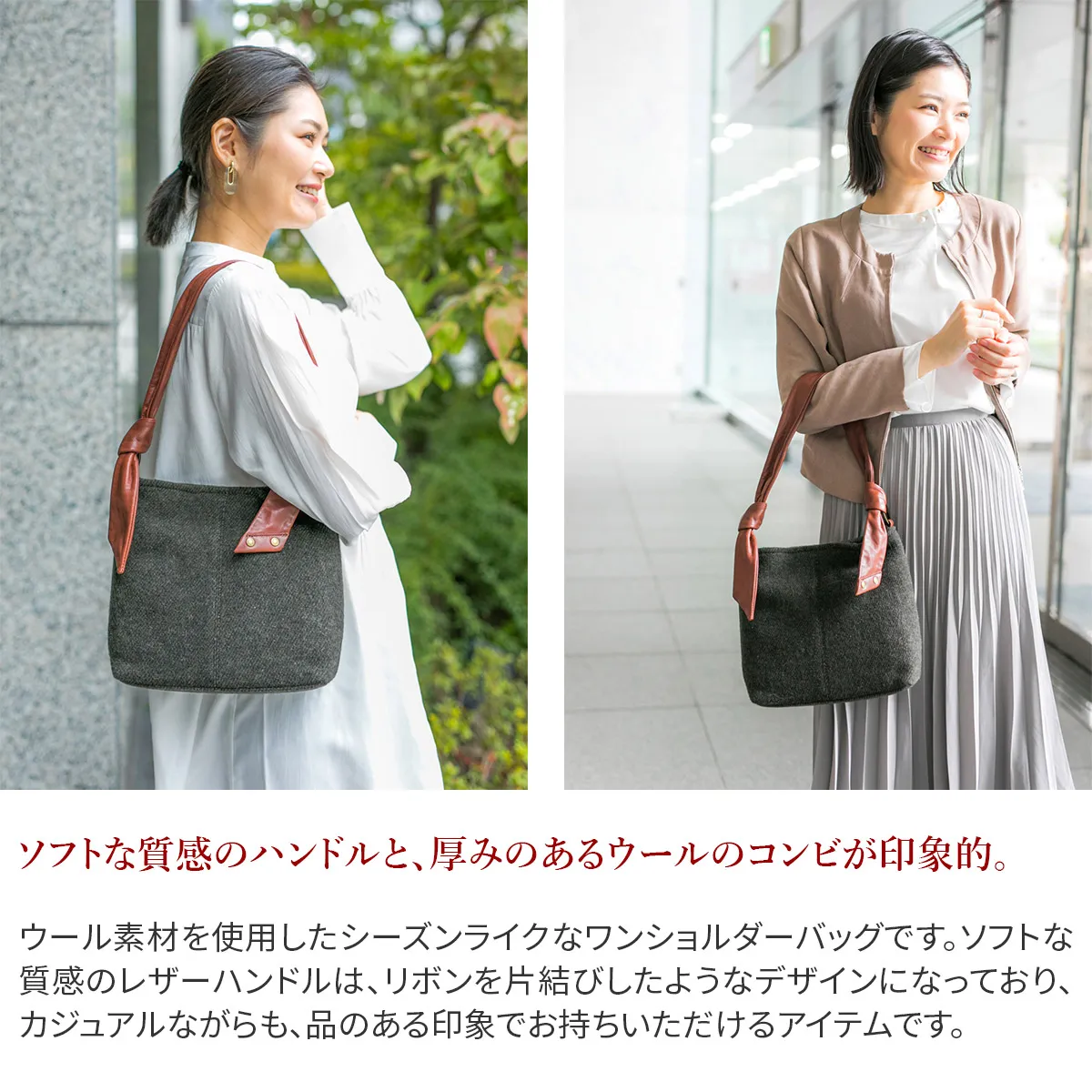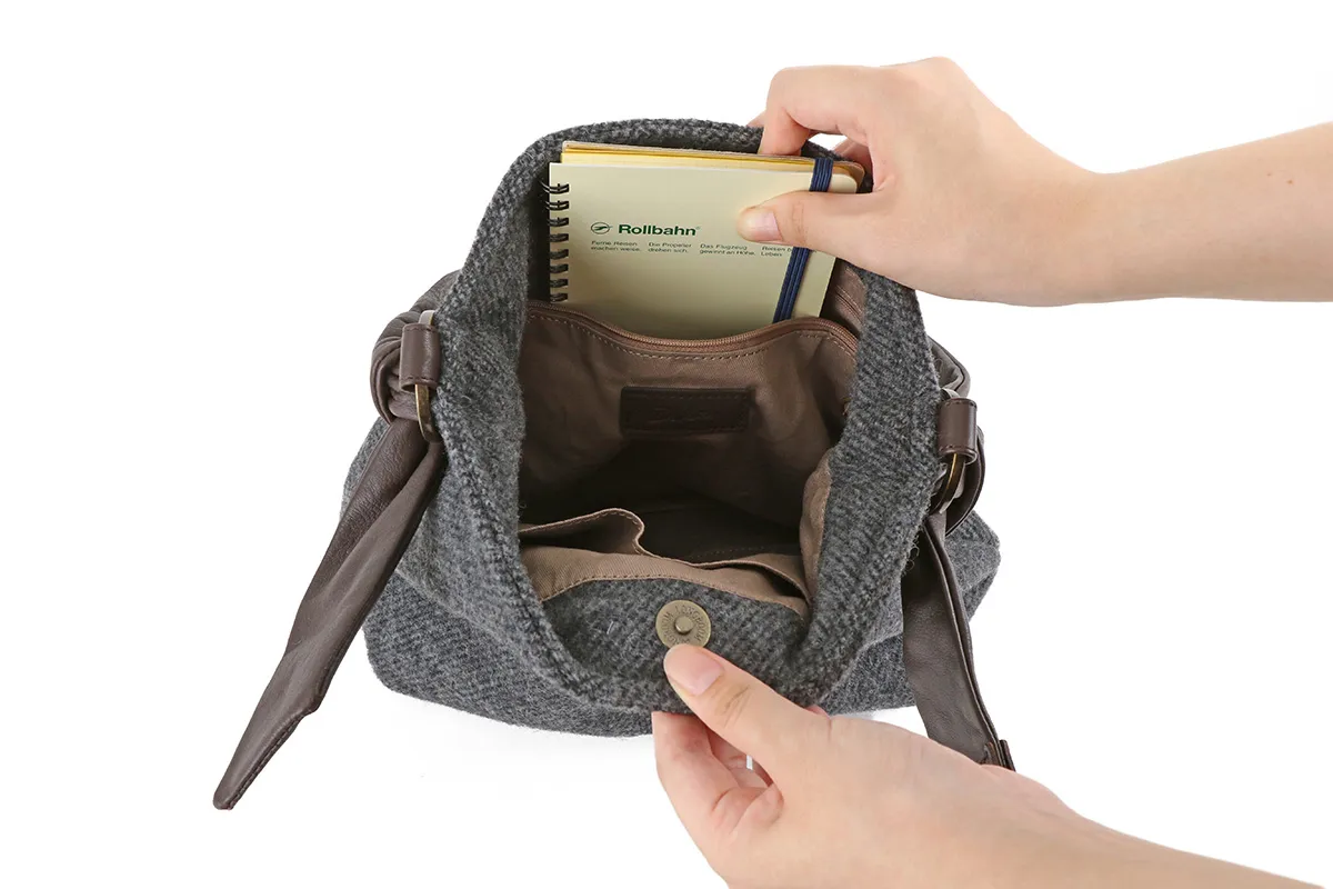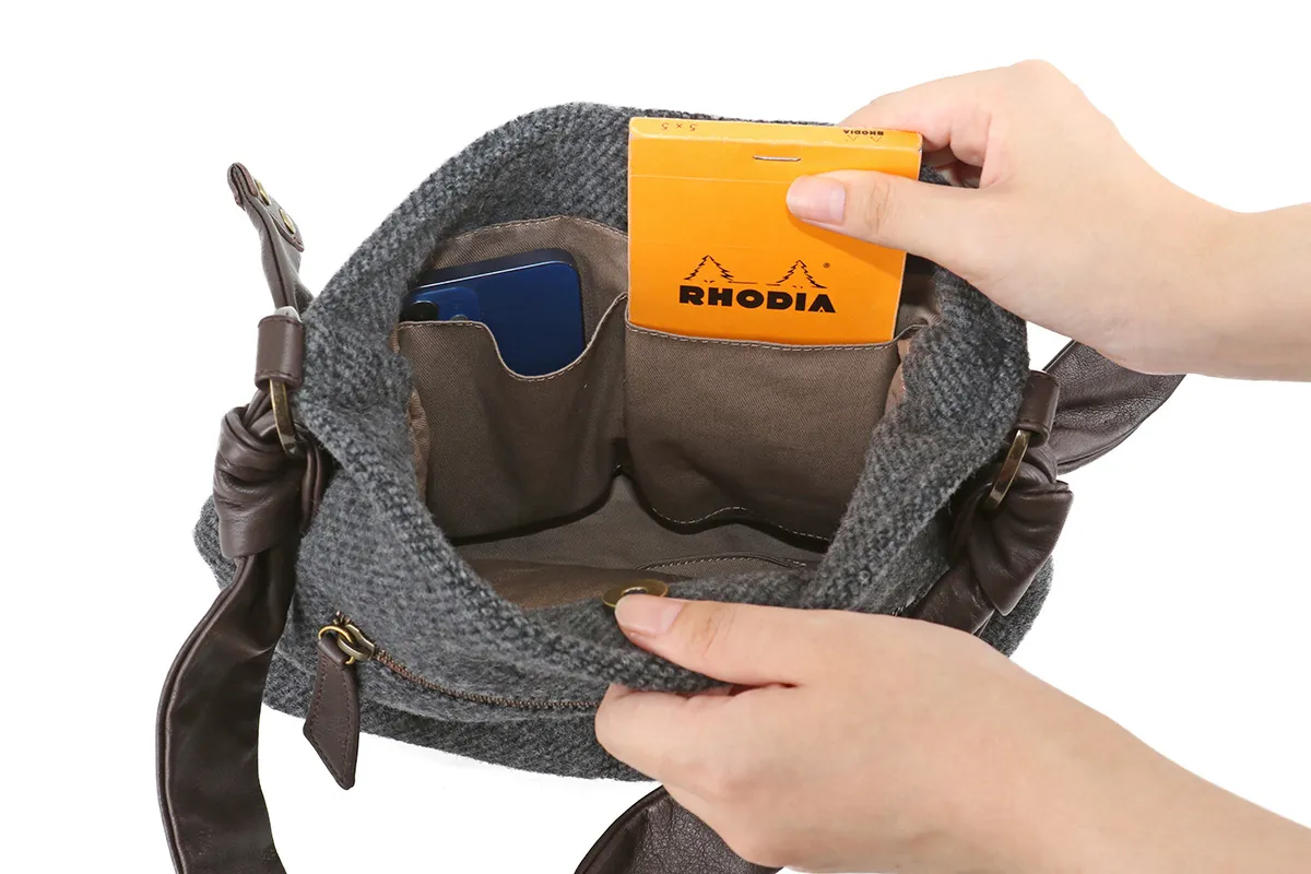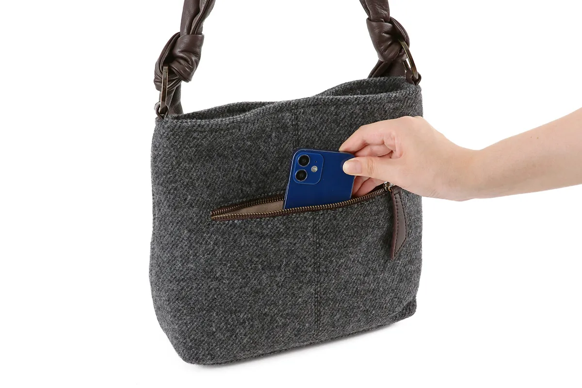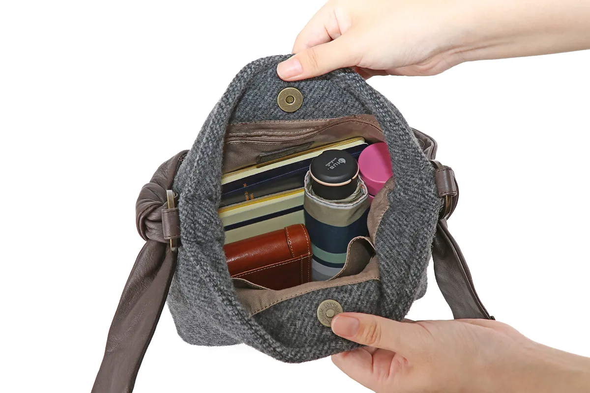 メイン部分の素材を国産のベロアとウールから選べるほっこりとした風合いのシリーズ。 イタリアンレザーの袋手を結んだチャーミングなデザインとDakota 刻印入りのオリジナルメタルリングがポイントです。 表素材にふっくら厚みのあるウールを使用したワンショルダーバッグです。 付属のハンドル部分にはソフトな質感の牛革を採用し、異素材をお愉しみいただけるアイテムになっています。 開口部はマグネットタイプになっているので、片手で開閉できるのが嬉しいポイント。 ややコンパクトで使い勝手がよく、休日のお出かけやショッピングでも活躍してくれるサイズ感です。