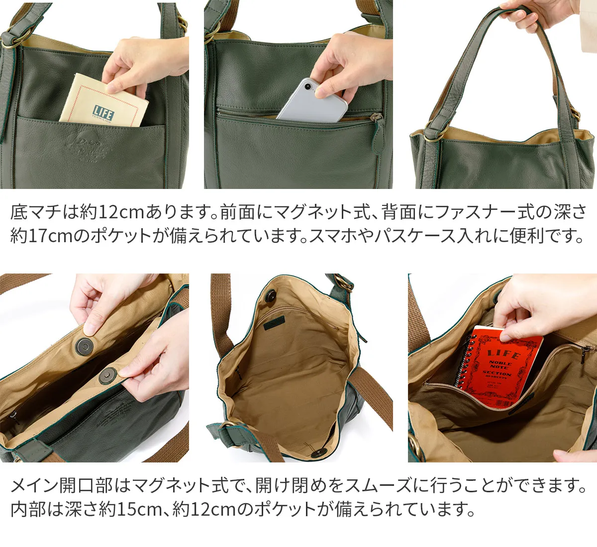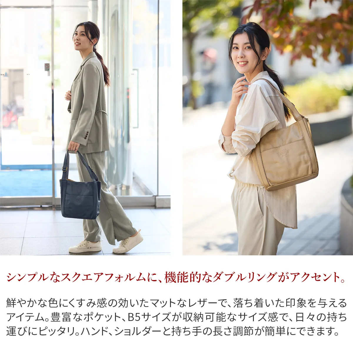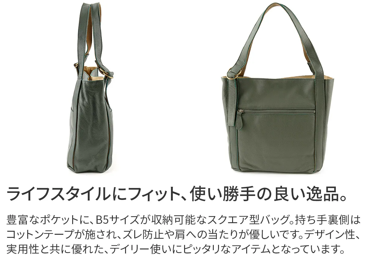 タッチ感の良い素上げの牛革を使用したデイリーユースな商品。ソフトな素材を活かし、ざっくりなフォルムに仕上げました。ダブルリングの調節部分が機能性に加え、デザインのアクセントになっています。 シンプルな作りで飽きがこず長く愛用していただける、大人カジュアルデザインのアイテムです。マグネット式の開口部は大きく開き、荷物の出し入れがしやすく、使い勝手の良い仕様になっています。