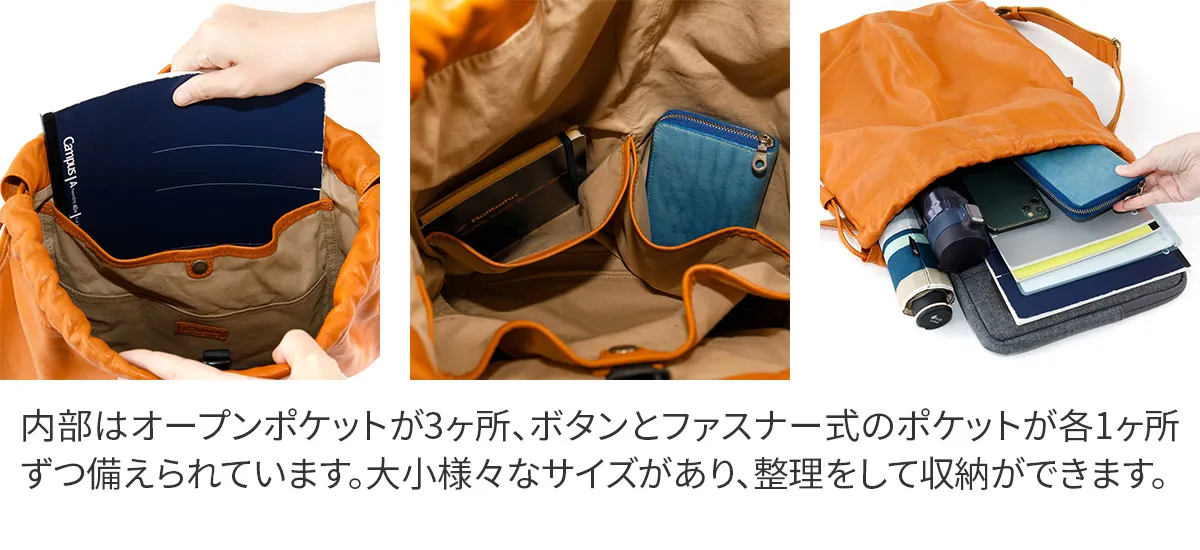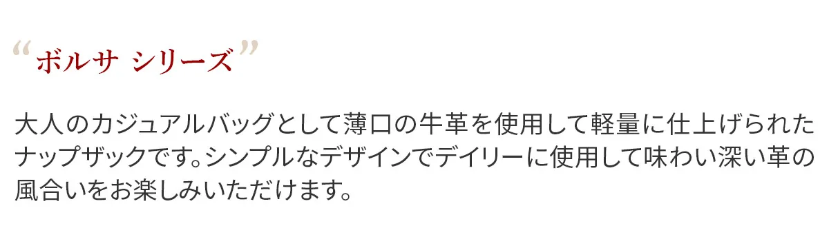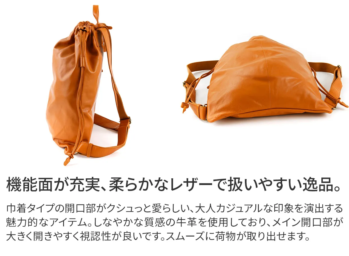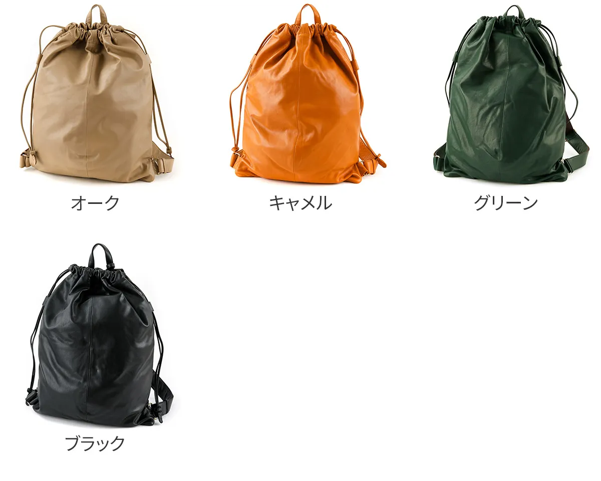 大人のカジュアルバッグとして薄口の牛革を使用して軽量に仕上げられたナップザックです。シンプルなデザインでデイリーに使用して味わい深い革の風合いをお楽しみいただけます。 B4書類が収まる大容量でお仕事やプライベートでも頼れるナップザックです。 口元はバックルがついた巾着で開閉しやすく、防犯面も安心なつくりになっています。 背面にも中身へアクセスできるファスナーが付いているので、背負ったまま荷物を取り出す事もできます。ポケットが豊富で、乱雑になりがちな小物類も細かく分類できるのが嬉しいポイント。カジュアルライクながらシックな装いにも馴染んでくれるアイテムです。