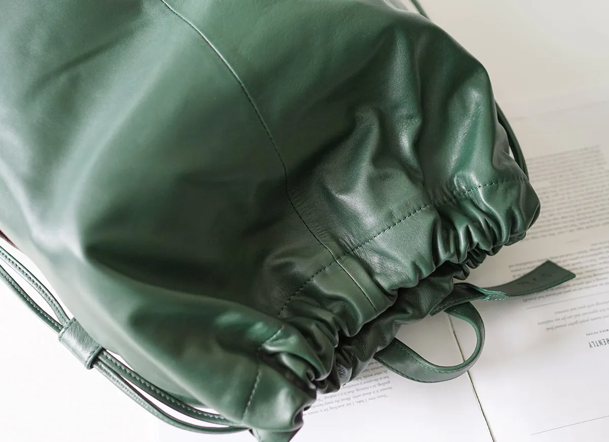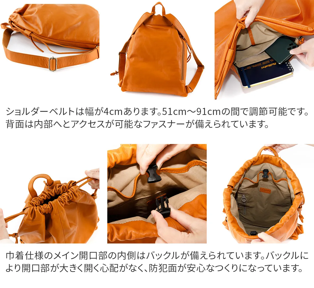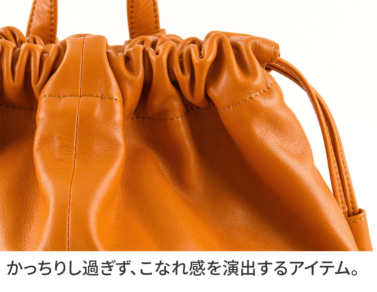 大人のカジュアルバッグとして薄口の牛革を使用して軽量に仕上げられたナップザックです。シンプルなデザインでデイリーに使用して味わい深い革の風合いをお楽しみいただけます。 B4書類が収まる大容量でお仕事やプライベートでも頼れるナップザックです。 口元はバックルがついた巾着で開閉しやすく、防犯面も安心なつくりになっています。 背面にも中身へアクセスできるファスナーが付いているので、背負ったまま荷物を取り出す事もできます。ポケットが豊富で、乱雑になりがちな小物類も細かく分類できるのが嬉しいポイント。カジュアルライクながらシックな装いにも馴染んでくれるアイテムです。