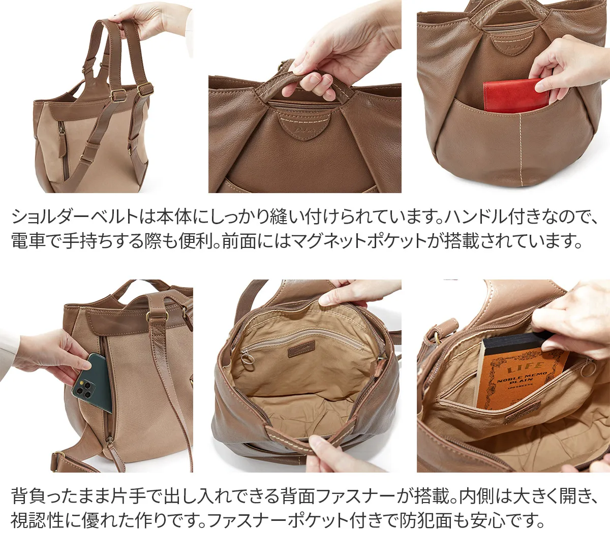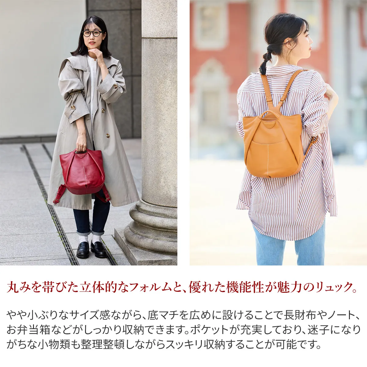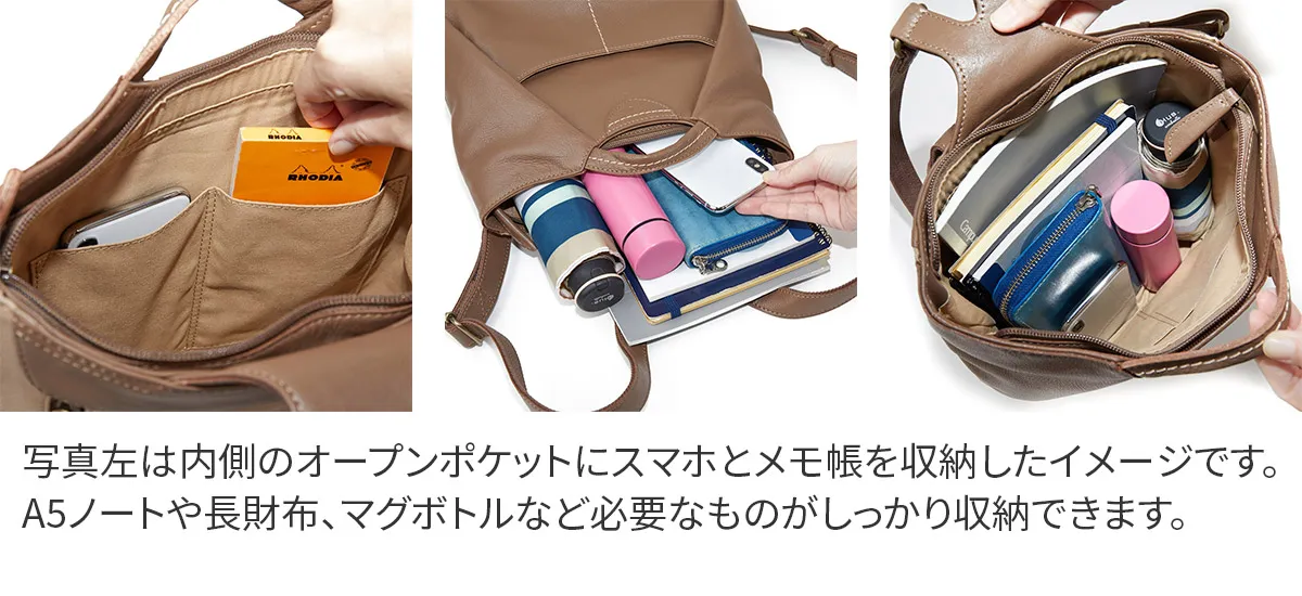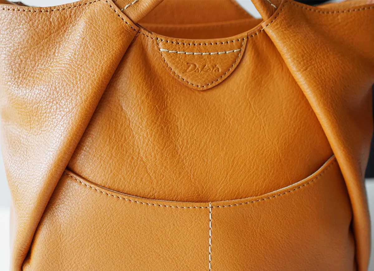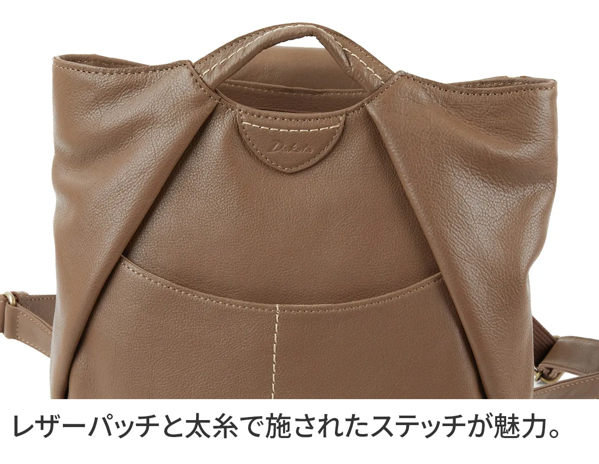 コロンとした形でキャッチーなデザイン。 ほんの少し作り込んた太糸ステッチはナチュラルな革と相性抜群です。 ふんわりタックの入ったフォルムが愛らしいアイテム。 底マチが広いので見た目以上の収納力を誇ります。 豊富なポケットやあおりポケットも備えられており、小物を整理して収納していただけます。 コーデや容量に合わせ持ち方を変えられるので、デイリー使いにピッタリな逸品です。