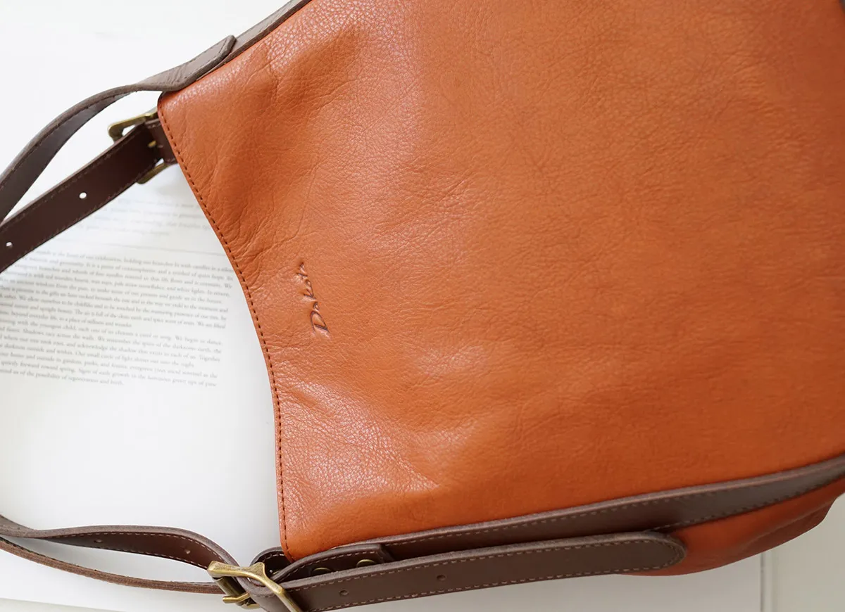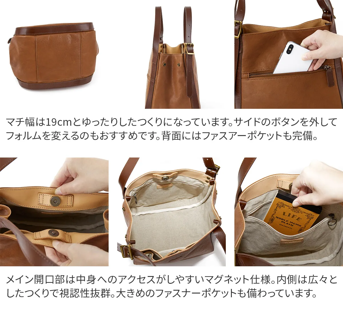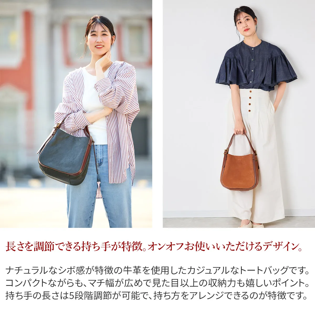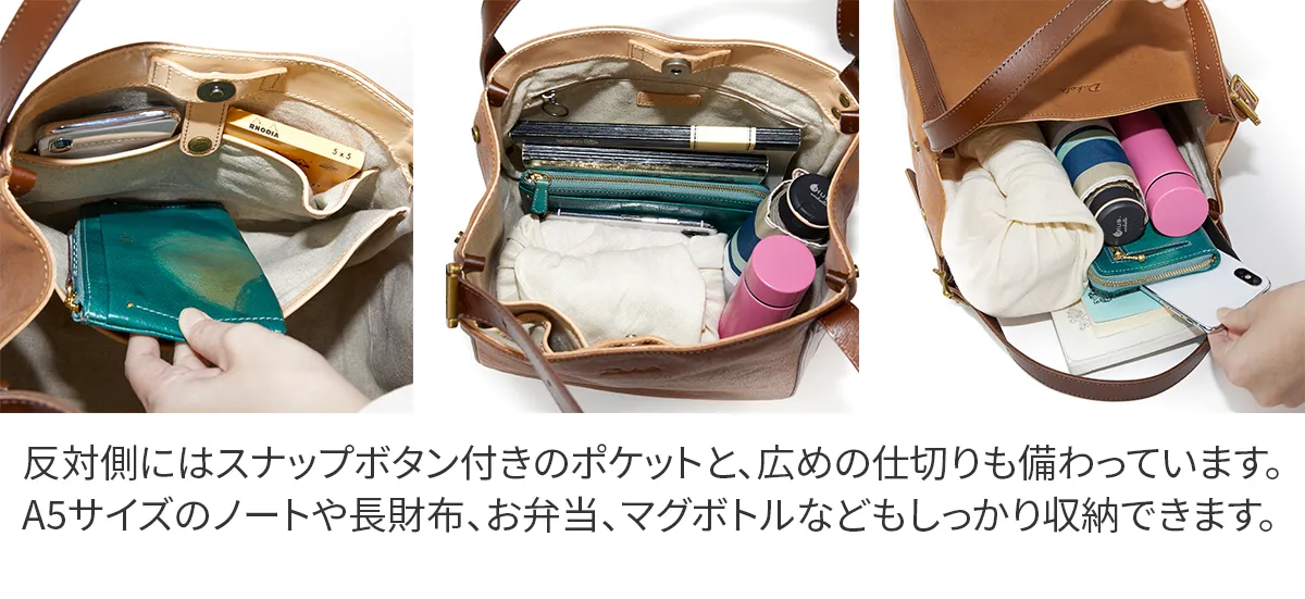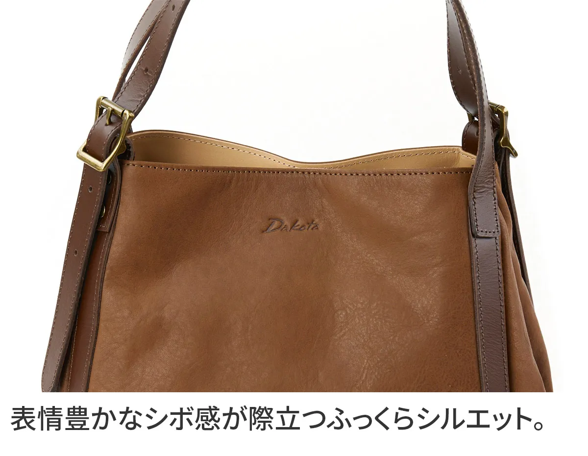 革らしいシボ感が特徴のヌメ革を使用したシリーズ。 軽量に出来ていますのでデイリーに使用していただけます。 経年変化も楽しみなバッグです。 《素材の特徴》 材料は国内屈指の皮革製造産地である姫路市のタンニン鞣しレザーを使用しています。 厚さ 2mm以上ある革下地をあえて 1.2mmに漉き(すき)、染色・可脂・乾燥して柔らかいレザーのベースを作ります。 通常はこの工程で仕上がりますが、そこから再度水を含ませヒートドラムで急激乾燥することで、オイルを飛ばし軽さを出しているのが特徴です。 ヌメ革特有の細かいシボが立って表面感も固く締まるので傷にも強く仕上がっています。 革独自の味わいを持ちながら、ドライで軽いレザーを使用したトートバッグ(小)。 ハンドル部分の長さを調節できるベルトが全体のアクセントになっています。 ふっくらとした柔らかなフォルムから、両サイドに備えられたボタンを開けると 端正なスクエアフォルムに変化でき沢山収納も可能に。 利便性が良く、コーデのアクセントになるアイテムです。