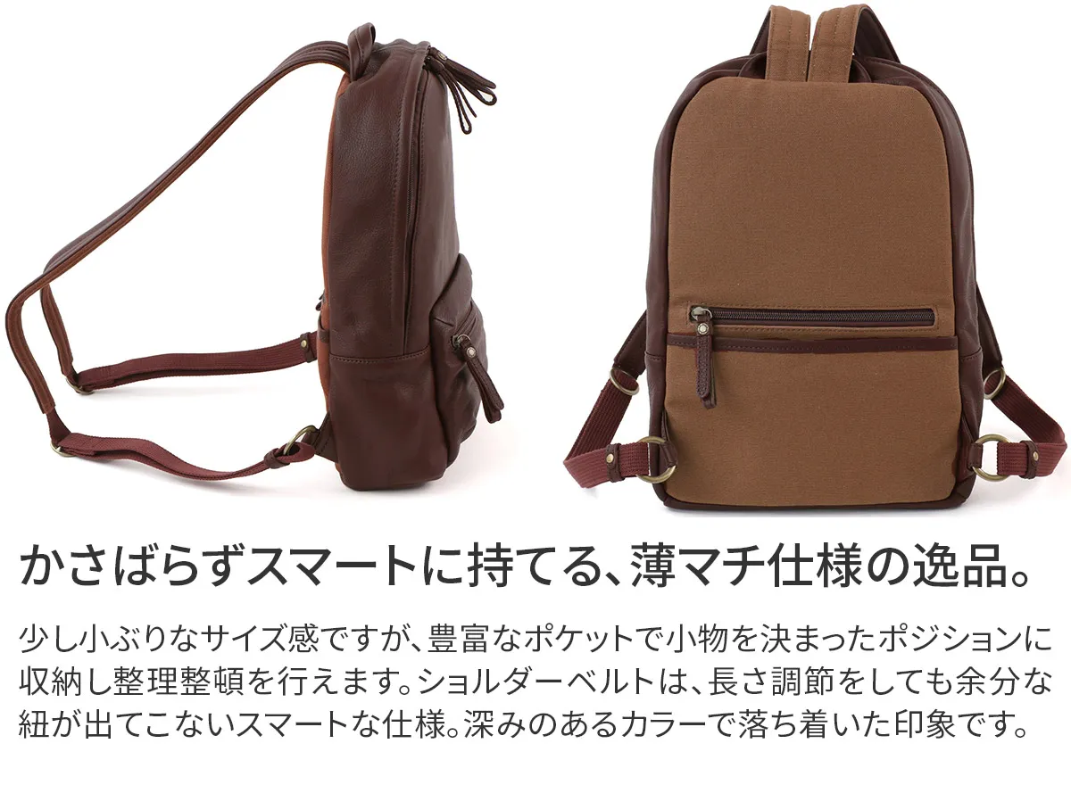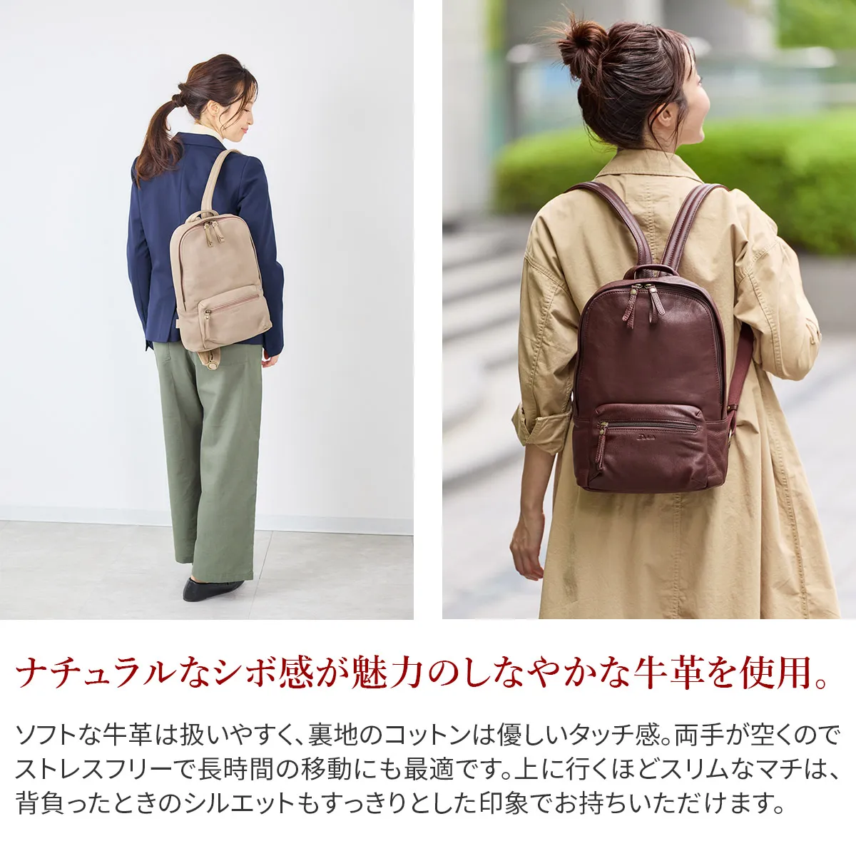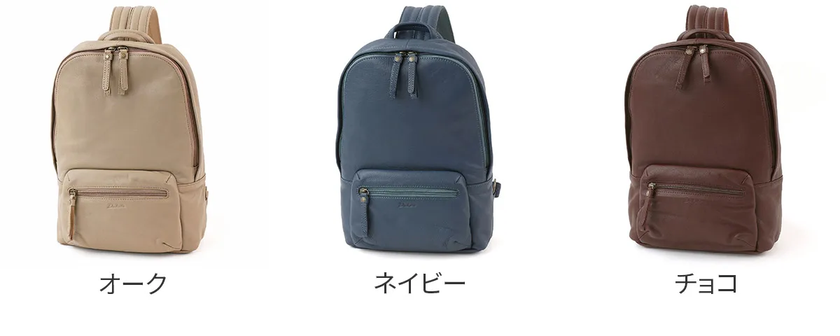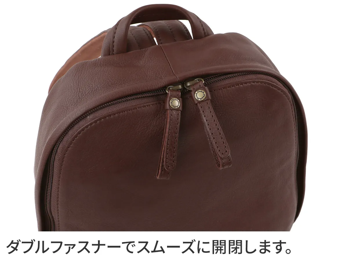 可愛らしさのある丸型の金具がポイントの気軽に日常使いしやすい革シリーズ。シンプル&スリム設計でも長財布が入るサイズとなっています。荷物が少なめでアクティブな方にもおすすめです。 少し小ぶりなリュックは女性が持ちやすいサイズ感。落ち着いた色合いも相まって、様々なコーデと相性が良く持つことができます。豊富なポケットは小物を賢く収納できます。大きく開く開口部で中身の出し入れもしやすい、便利なアイテムとなっています。