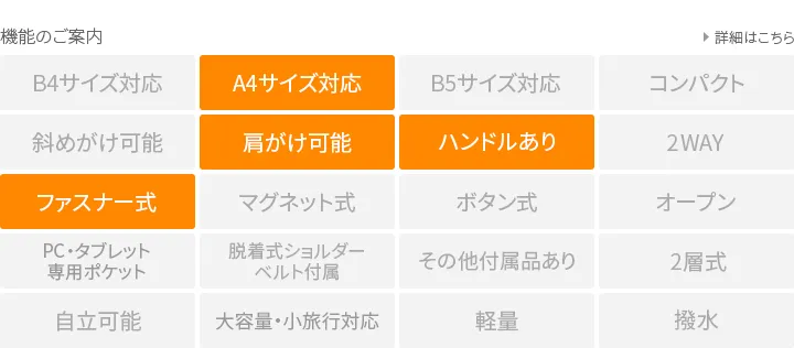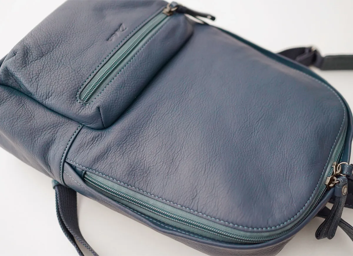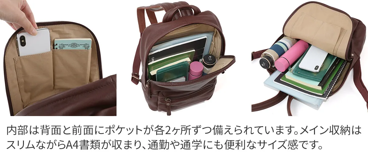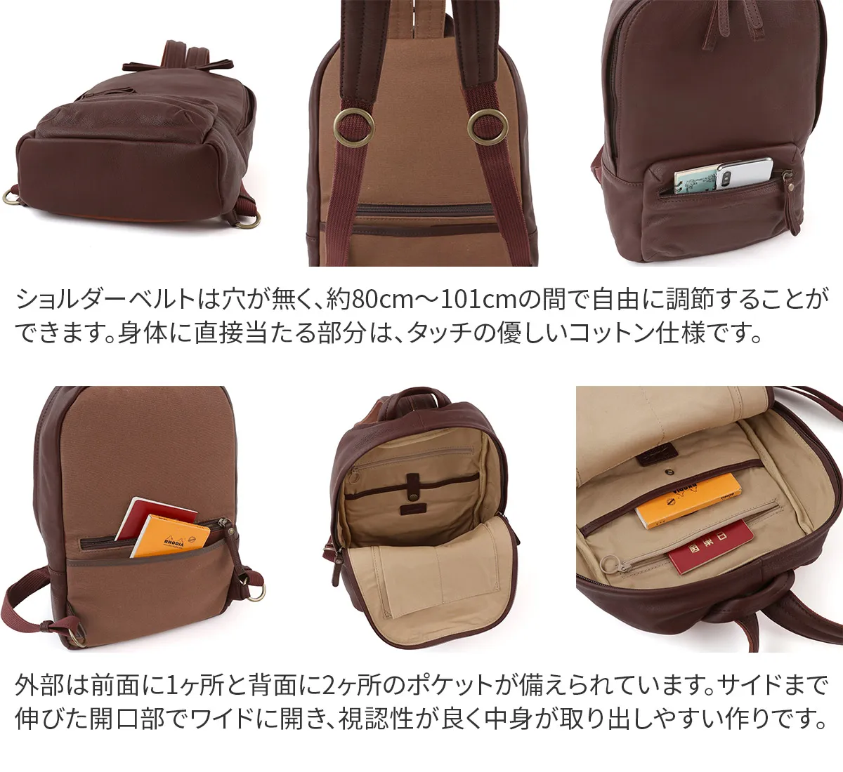可愛らしさのある丸型の金具がポイントの気軽に日常使いしやすい革シリーズ。シンプル&スリム設計でも長財布が入るサイズとなっています。荷物が少なめでアクティブな方にもおすすめです。 少し小ぶりなリュックは女性が持ちやすいサイズ感。落ち着いた色合いも相まって、様々なコーデと相性が良く持つことができます。豊富なポケットは小物を賢く収納できます。大きく開く開口部で中身の出し入れもしやすい、便利なアイテムとなっています。