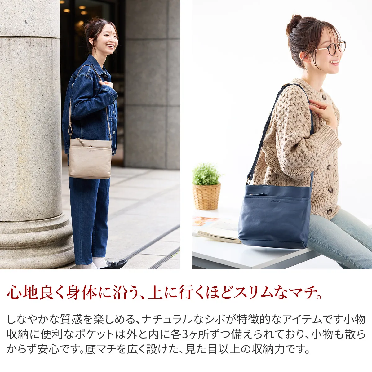 可愛らしさのある丸型の金具がポイントの気軽に日常使いしやすい革シリーズ。シンプル&スリム設計でも長財布が入るサイズとなっています。荷物が少なめでアクティブな方にもおすすめです。 スクエアフォルムの端正な佇まいは、キレイめコーデにも合わせやすいです。小ぶりながらポケットが豊富で、充実した収納機能を備えています。長財布やハンカチ、文庫本など普段持ち歩くアイテムを携帯しやすく、デイリーユースにもぴったりなアイテムとなっています。