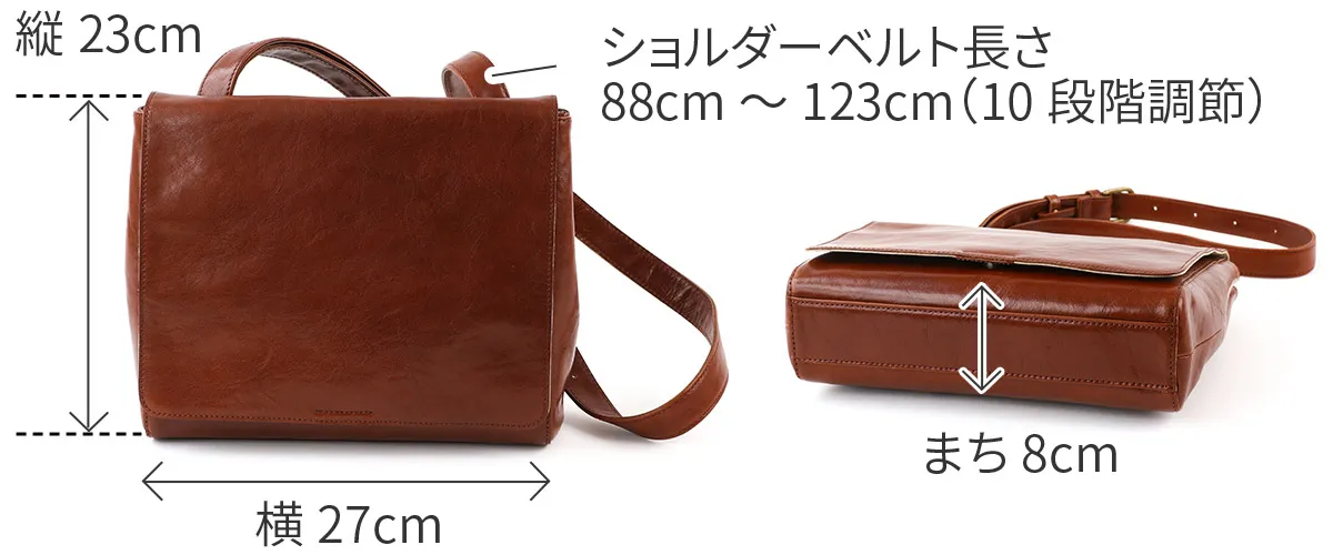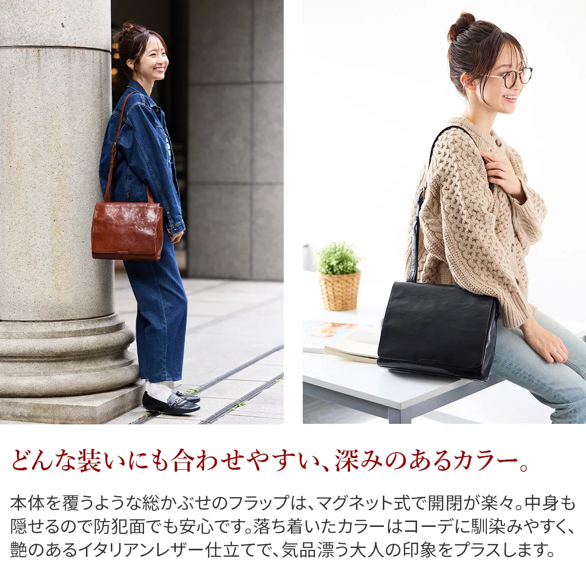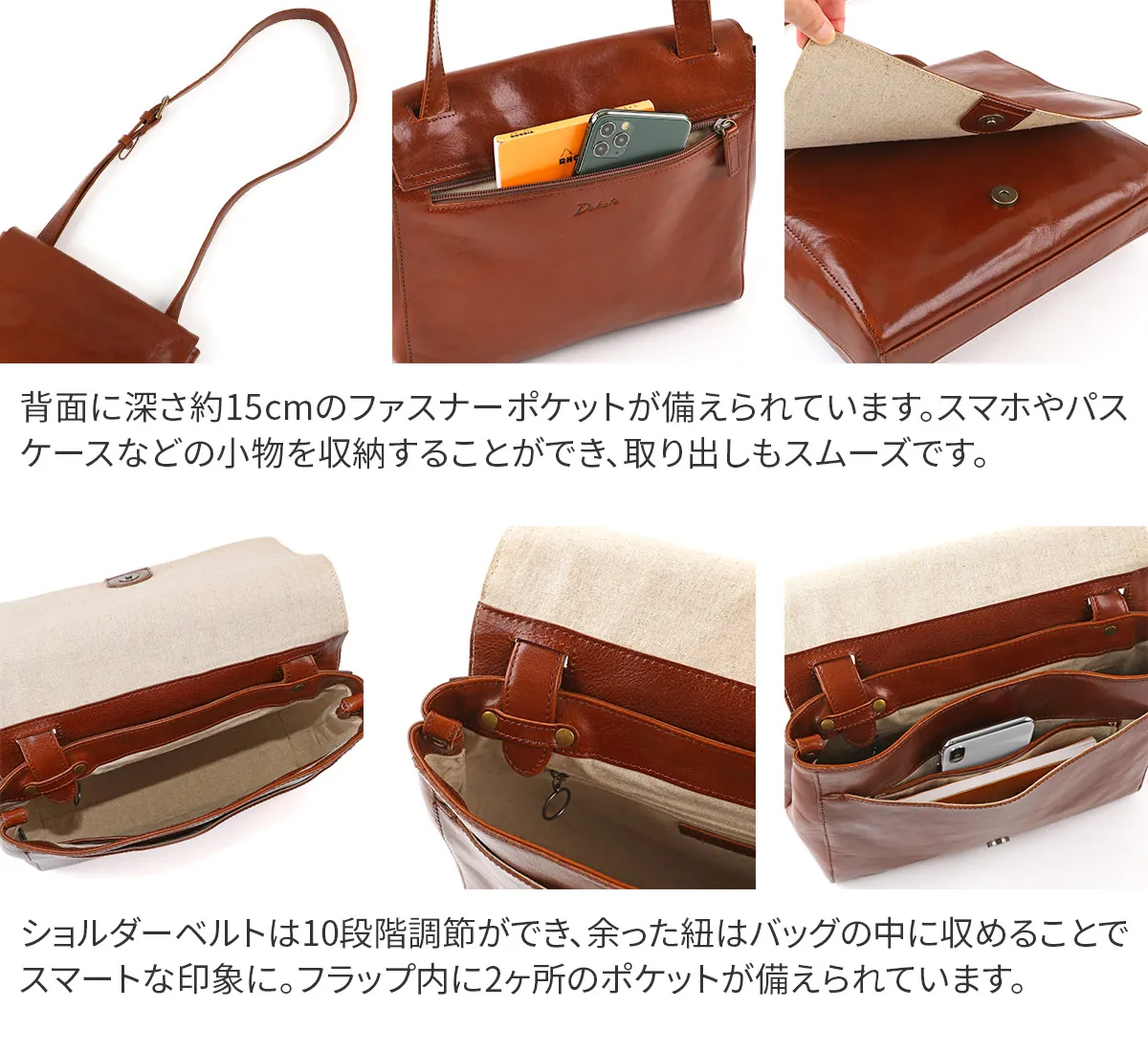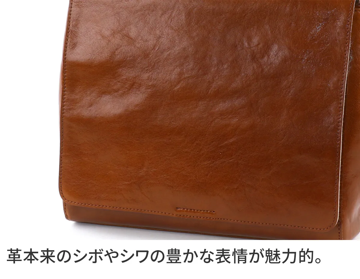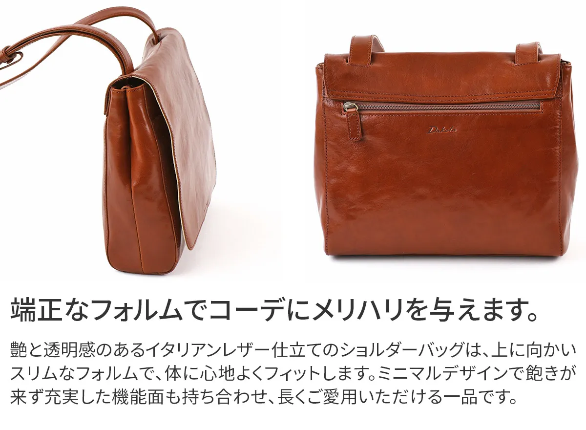 上品な艶感と透明感が特徴のイタリアンレザーを使用したシリーズです。ミニマルなデザインなのでデイリーに使用して革の風合いをお楽しみ下さい。 豊富なポケットを設けており、小物の定位置を決めて収納することができます。ショルダーベルトは10段階で自分好みの長さに調節ができ、肩掛けや斜め掛けスタイルを楽しめます。落ち着いた色味でコーデに取り入れやすいデザインです。
