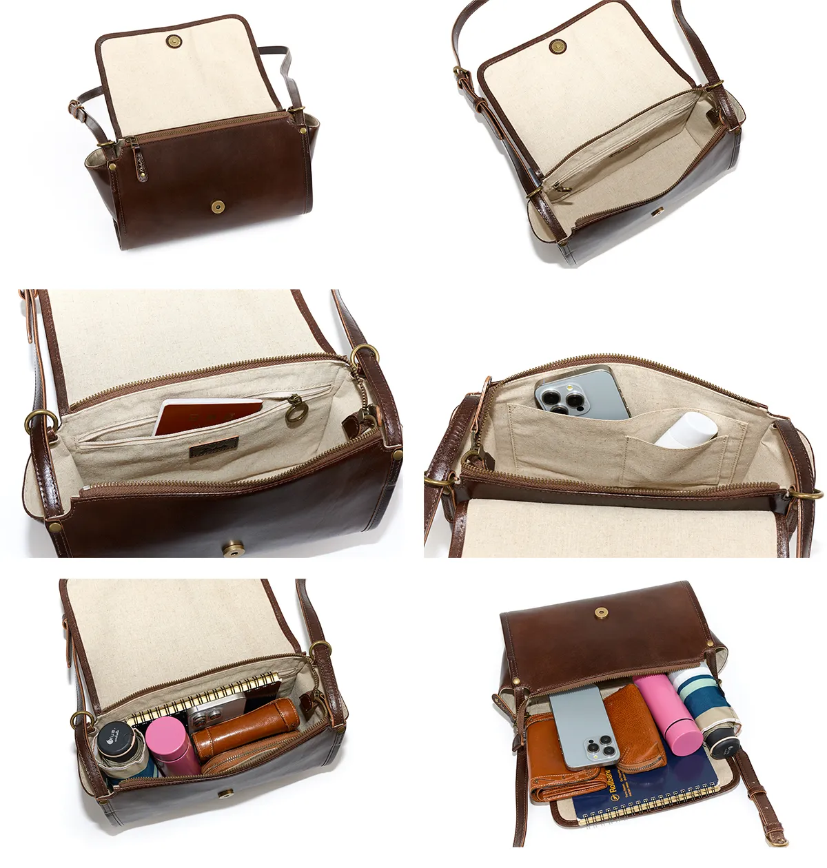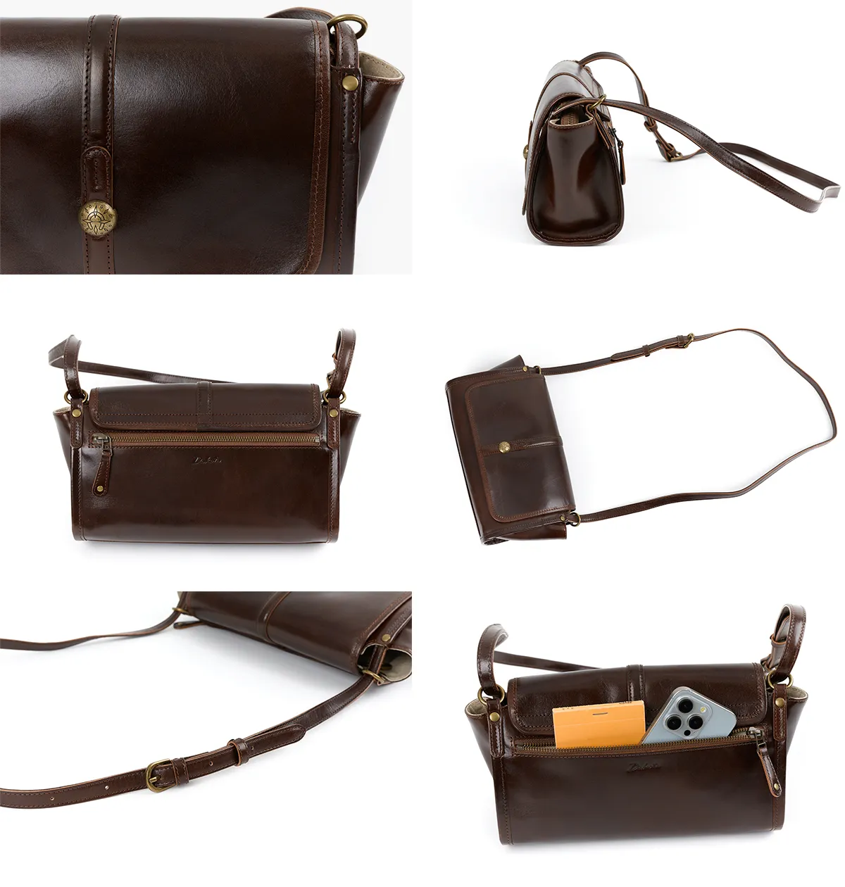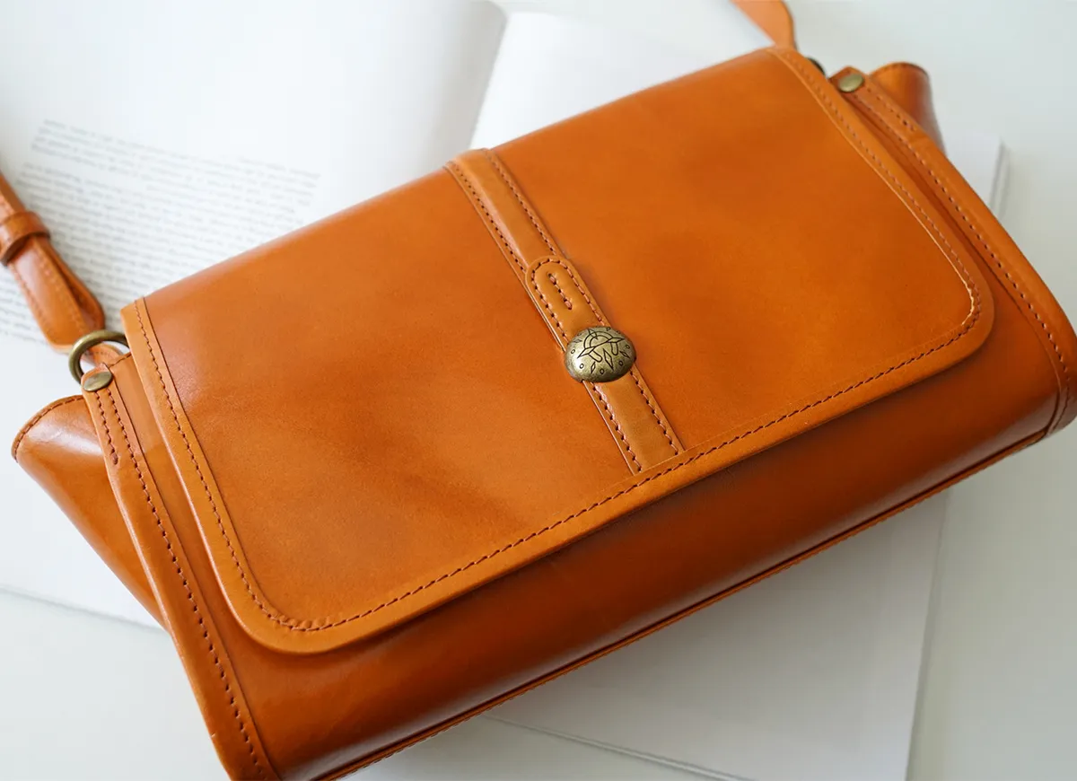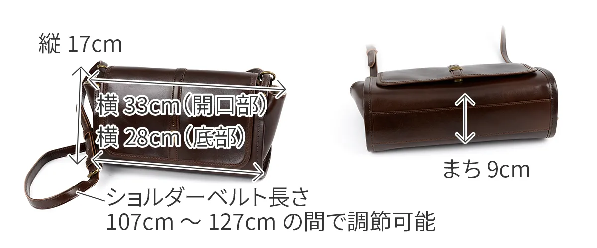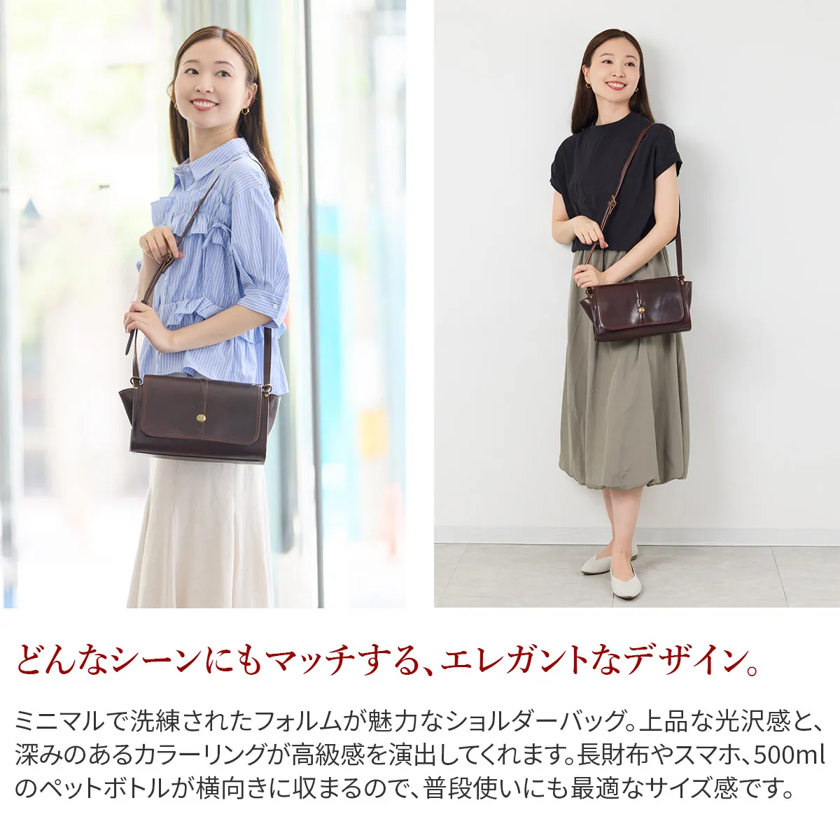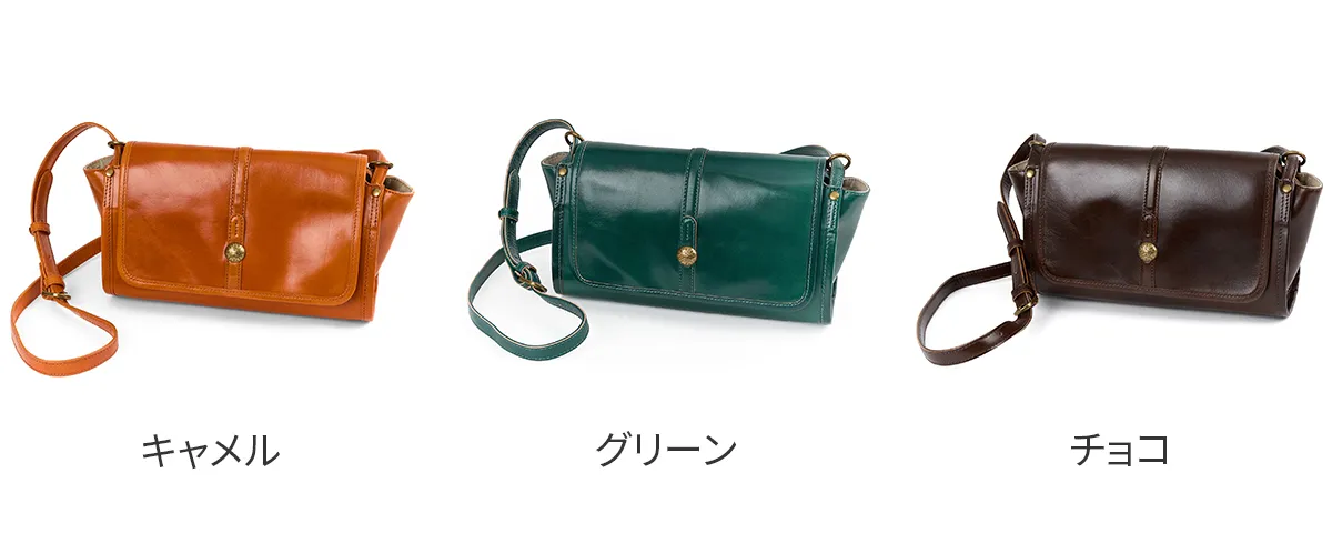 ベーシックなベルトデザインに丸いカシメがアクセントになったシリーズ。 ころんとしたドーム型のカシメはイタリアにある大聖堂の丸天井”クーポラ”をイメージしています。クラシックな上品さと現代っぽいムードが組み合わさったタイムレスな魅力を放ちます。 《attention》 イタリアンレザーを使用しており、色落ちする事がございます。 特に白物、淡色物の衣類等を汚す事がありますので十分注意してください。 また、おか染めの革を使用しており、擦れ等に弱く、色が剥がれてしまう事があります。 <おか染めとは> 未染色の素材革(クラスト革)にスプレーやハケなどで色を染めたもので、革の中にはほとんど色が染み込まず、断面は未染色状態に見えます。鮮やかなカラーが出る事が良い特徴です。 艶のあるレトロな風合いが魅力のショルダーバッグ。正面のベルトとブローチが目を惹きます。 マチがしっかり設けられており、小物類や500mlのペットボトルを横向きに収納することができるので、 見た目以上の収納力を発揮します。 普段のコーデのアクセントになるアイテムです。