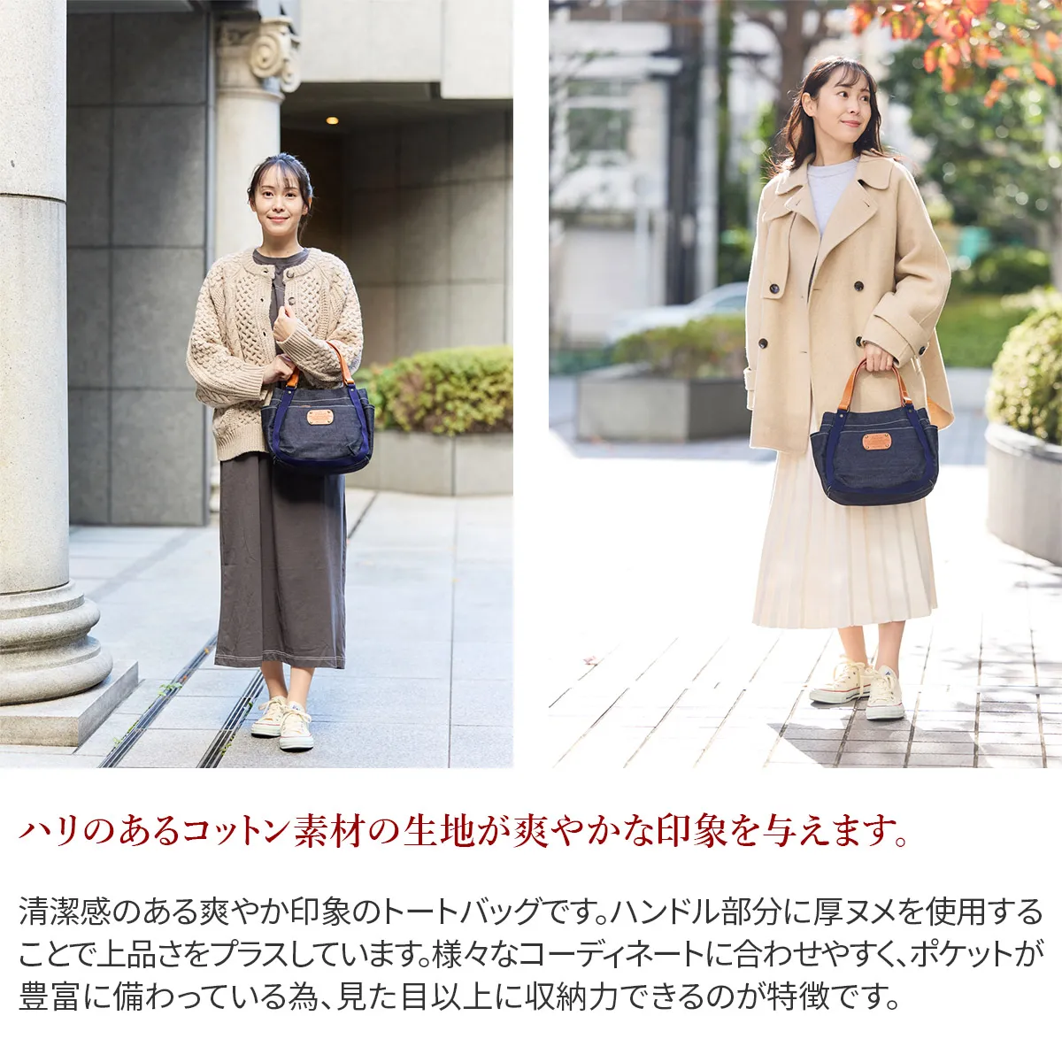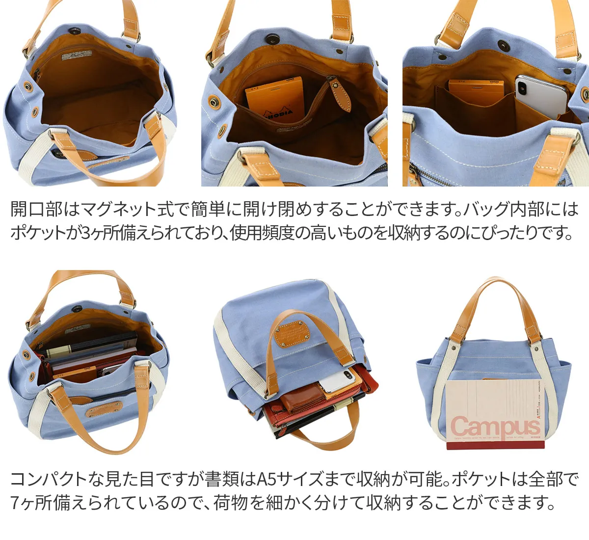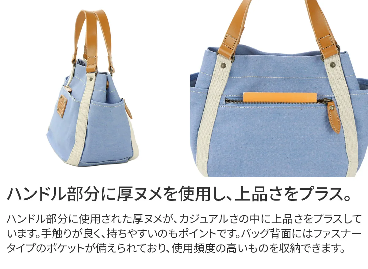 ハリのあるコットン素材を使用したざっくりトートシリーズです。 デザインのワンポイントに厚ヌメを使用することで、カジュアル感を表現しました。 軽やかな印象でお持ちいただけるトートバッグです。 小さめですが、マチがあるので見た目以上の収納力です。ポケットが豊富に備わっており、小物を分けて収納可能。 スナップボタンによってフォルムチェンジできるのもポイントです。