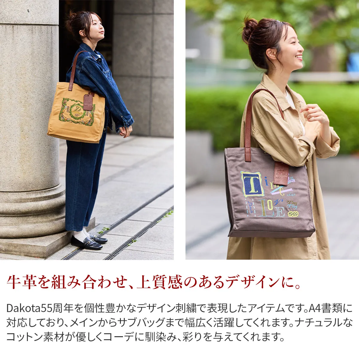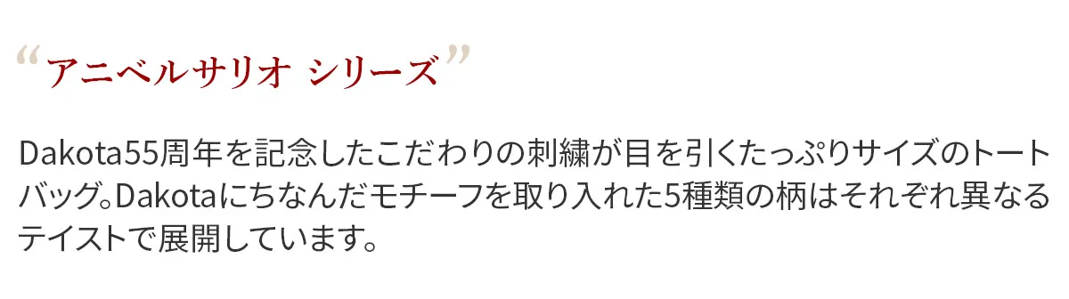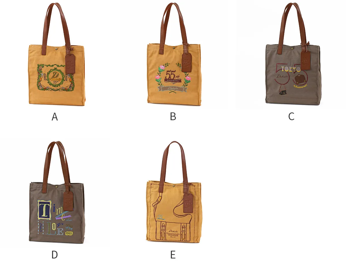 Dakota55周年を記念したこだわりの刺繍が目を引くたっぷりサイズのトートバッグ。Dakotaにちなんだモチーフを取り入れた5種類の柄はそれぞれ異なるテイストで展開しています。 ハンドルは肩掛けのしやすい長めの設定です。裏にはコットンテープが施されており、滑りにくく肩への負担も軽減します。ナチュラルな綿に、存在感のあるデザインが目を惹く、コーデのアクセントになるアイテムです。