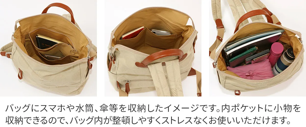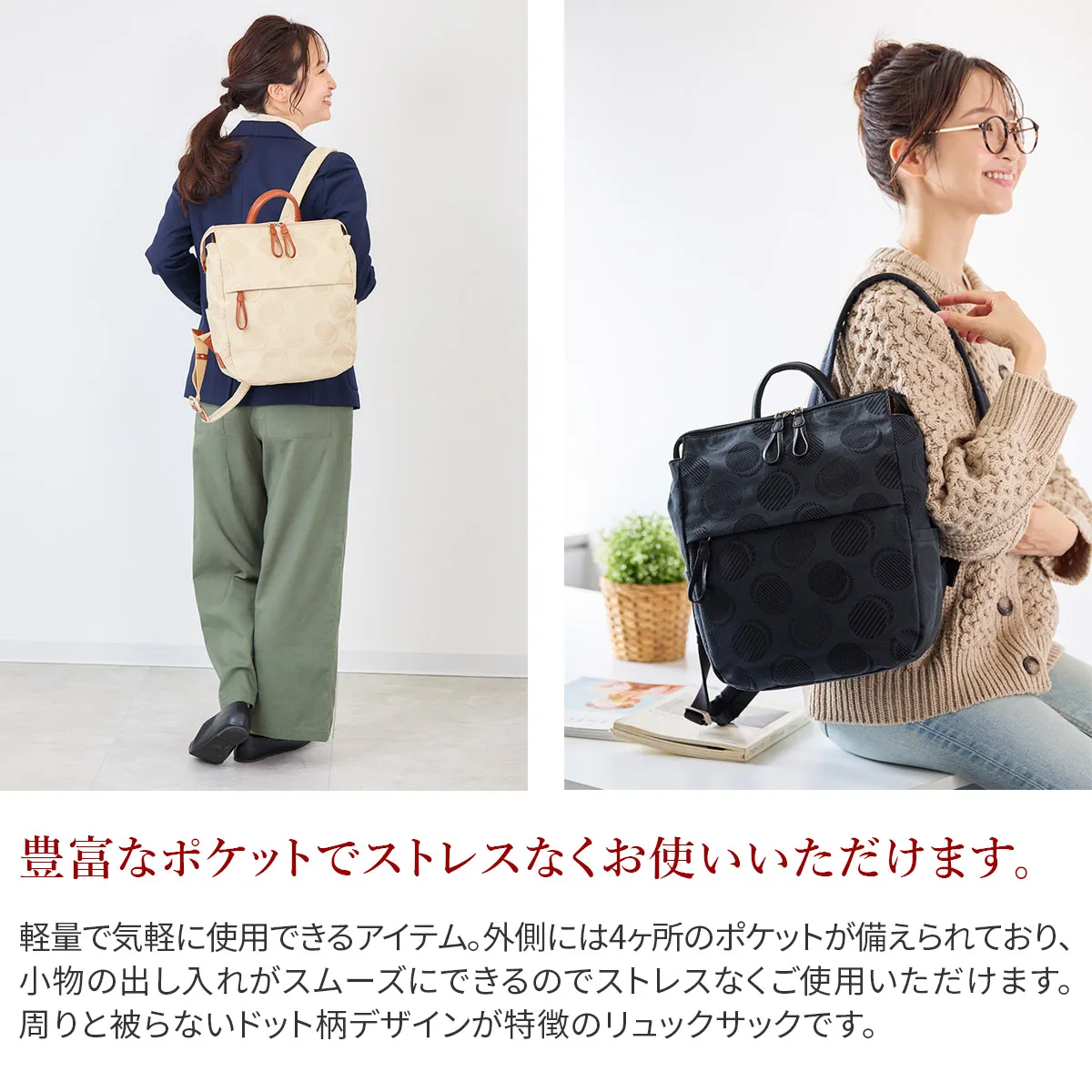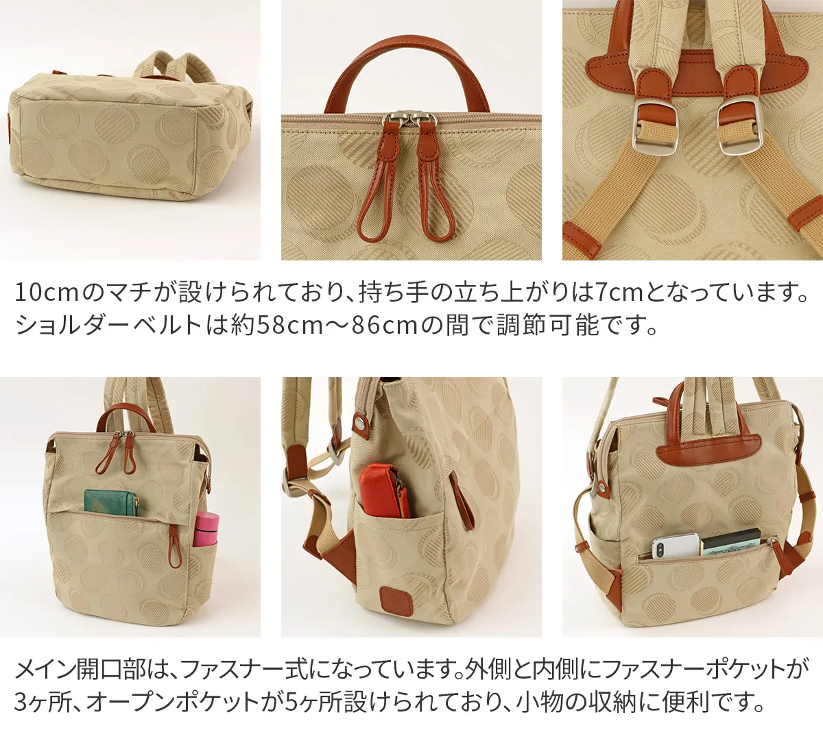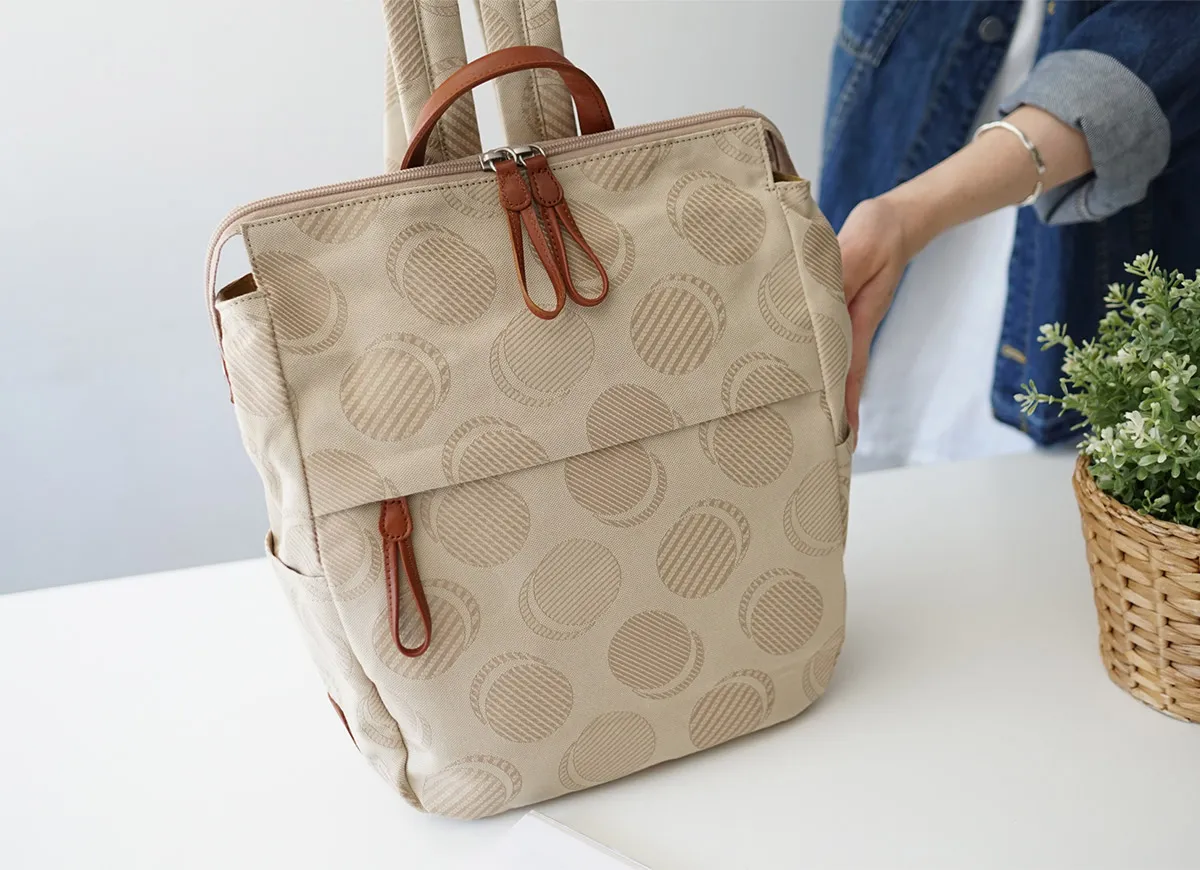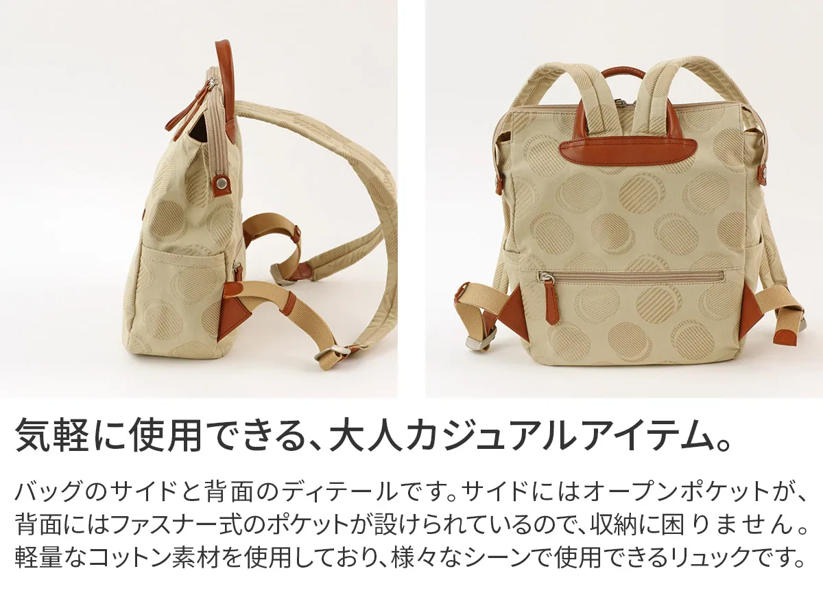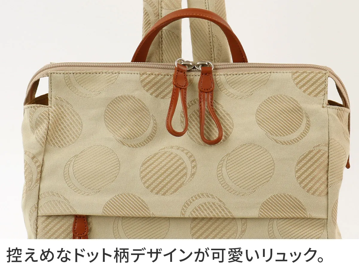 織りで表現したドット柄が可愛らしい日本製のオリジナルジャガードシリーズ。 ポケットを多く配色し、軽さや使い易さにこだわっているので普段使いや旅行など様々なシーンにおすすめです。 軽量で気軽に使用できるコットン素材とレザーの組み合わせが魅力のアイテムです。 落ち着きのあるカラーに、光加減によりキラリと光る控えめなドットデザインが大人カジュアルを演出。 メイン開口部はダブルファスナー式です。引手は約8cmのループ状になっており、掴みやすくリュックのアクセントにもなります。 スッキリとしたフォルムに豊富なポケットが備えられているので、 小物を特定の位置に収納でき把握がしやすい構造です。 主張しすぎないデザイン性で、幅広いスタイルと好相性です。