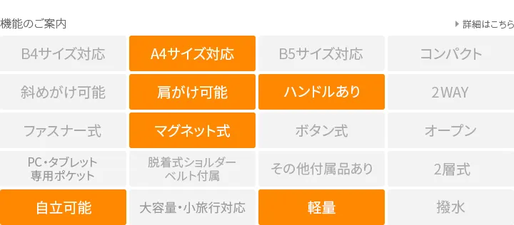 ハリ感のある素材を使用したシリーズ。デザインのワンポイントに厚ヌメを使用する事でカジュアル感を表現しました。 A4サイズの書類が収納できるため、通勤や通学にも便利。荷物が増えてもフォルムが変化し、柔軟に対応します。ポケットも充実しており、小物の定位置を決めて整理しながら快適にご使用いただけます。