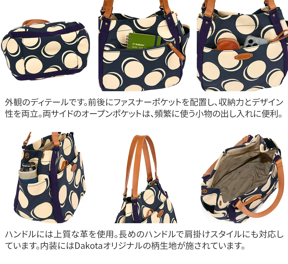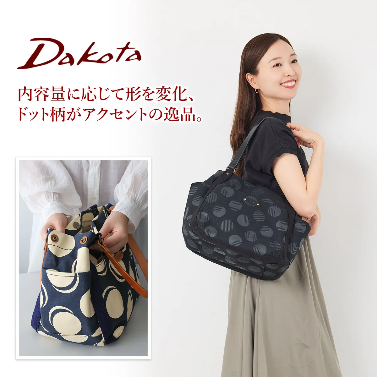 ハリ感のある素材を使用したシリーズ。デザインのワンポイントに厚ヌメを使用する事でカジュアル感を表現しました。 丸みを帯びた優しいフォルムのトートバッグは、両サイドのボタンを外すと開口部が開き、形を変えてお持ちいただくことができます。