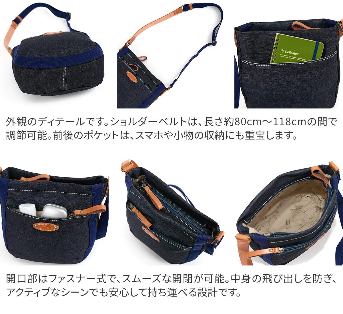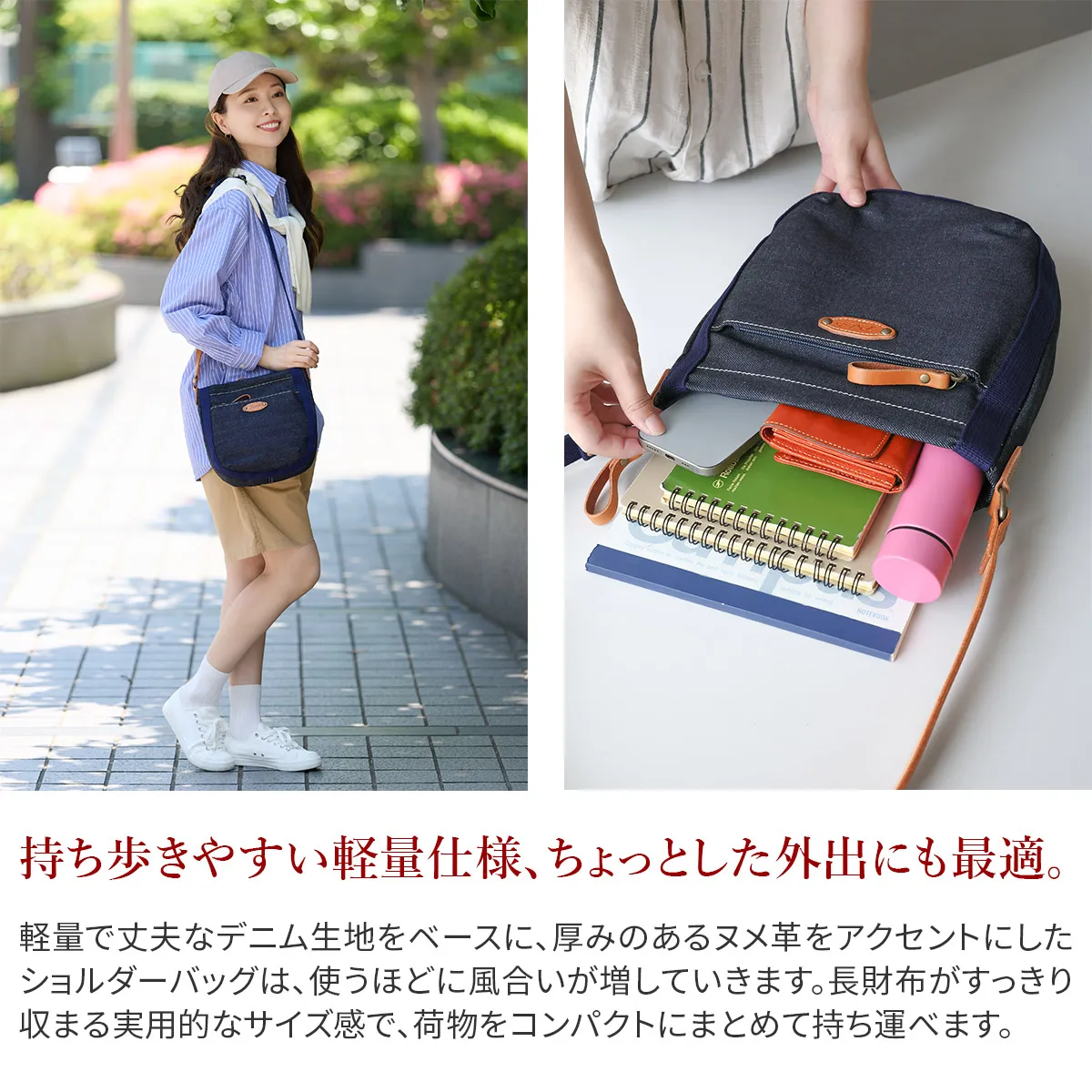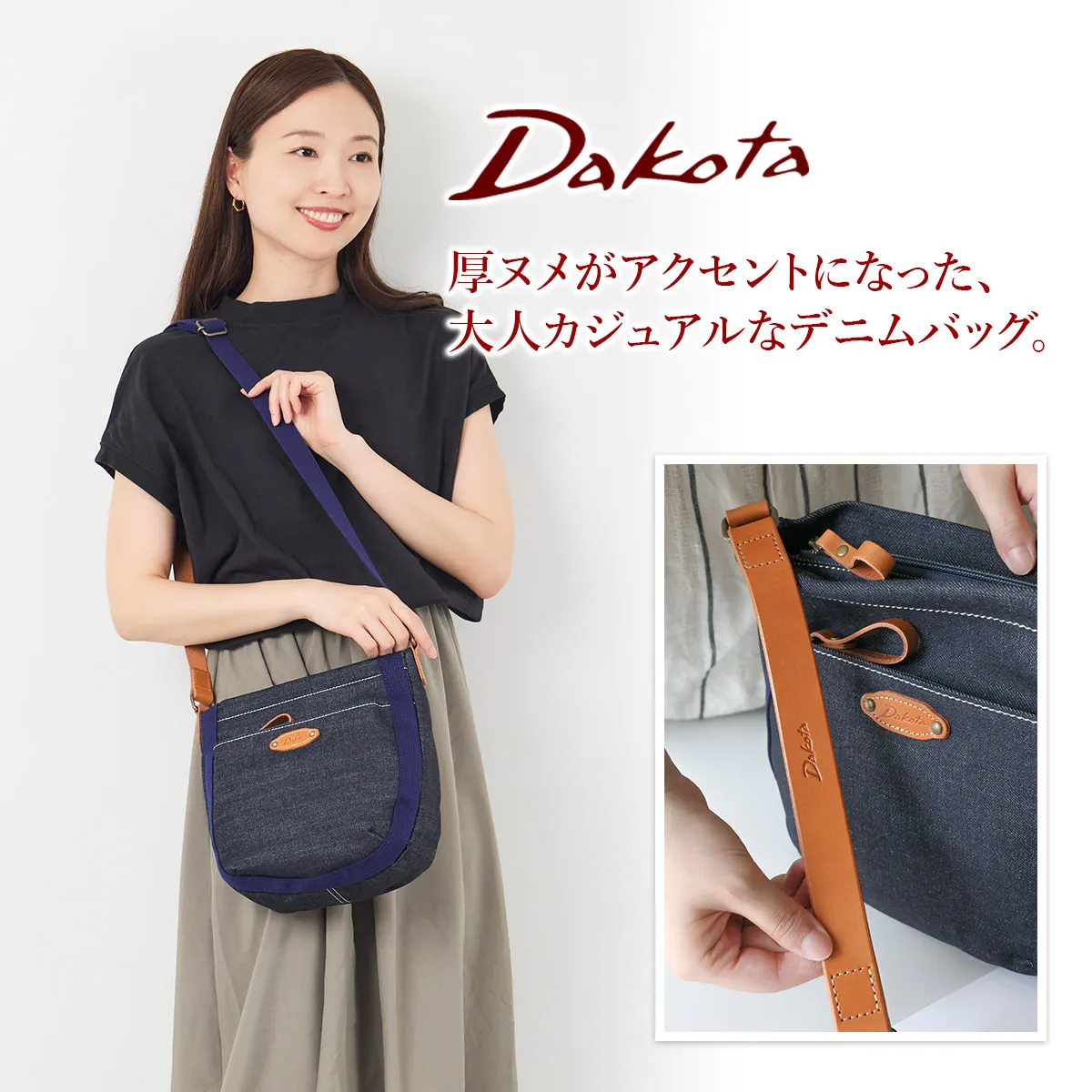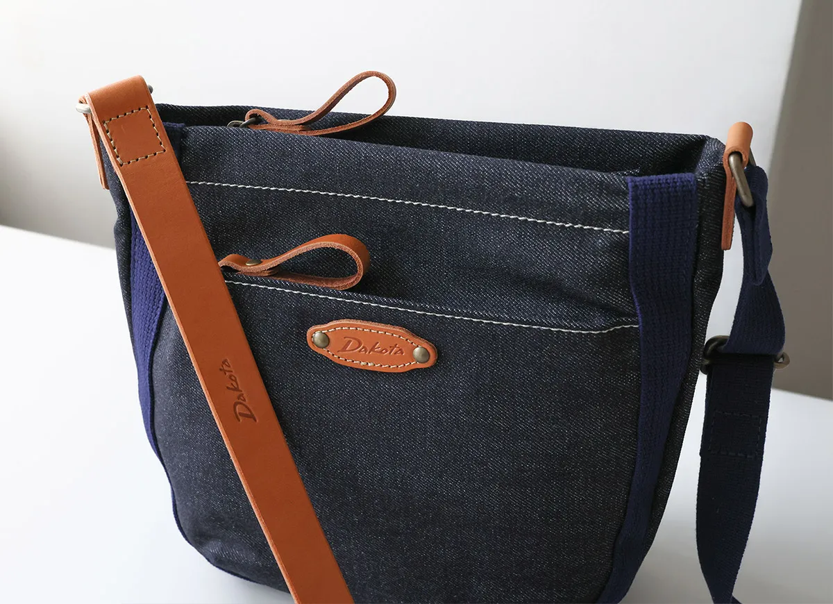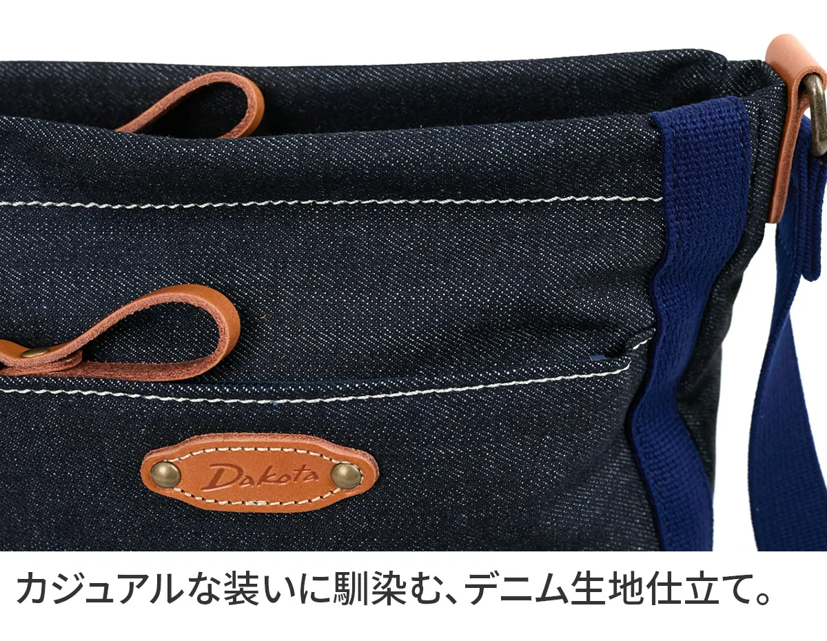 ハリ感のある素材を使用したシリーズ。デザインのワンポイントに厚ヌメを使用する事でカジュアル感を表現しました。 コットン素材をメインに仕立てた、ナチュラルな風合いが魅力のショルダーバッグ。デニム生地の味わいと、異素材であるヌメ革の組み合わせが、大人のカジュアルスタイルにさりげなく寄り添います。長財布が縦・横どちらでも収まる、実用的なサイズ感です。内装にはDakotaオリジナルの柄入り生地を使用し、遊び心を添えた仕上がりに。使い込むほどに風合いが深まり、愛着が増していくアイテムです。