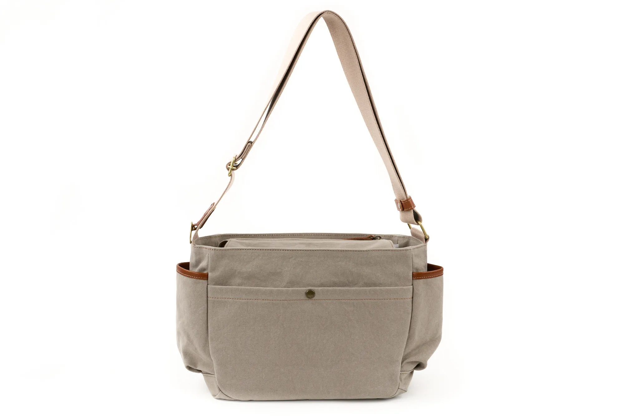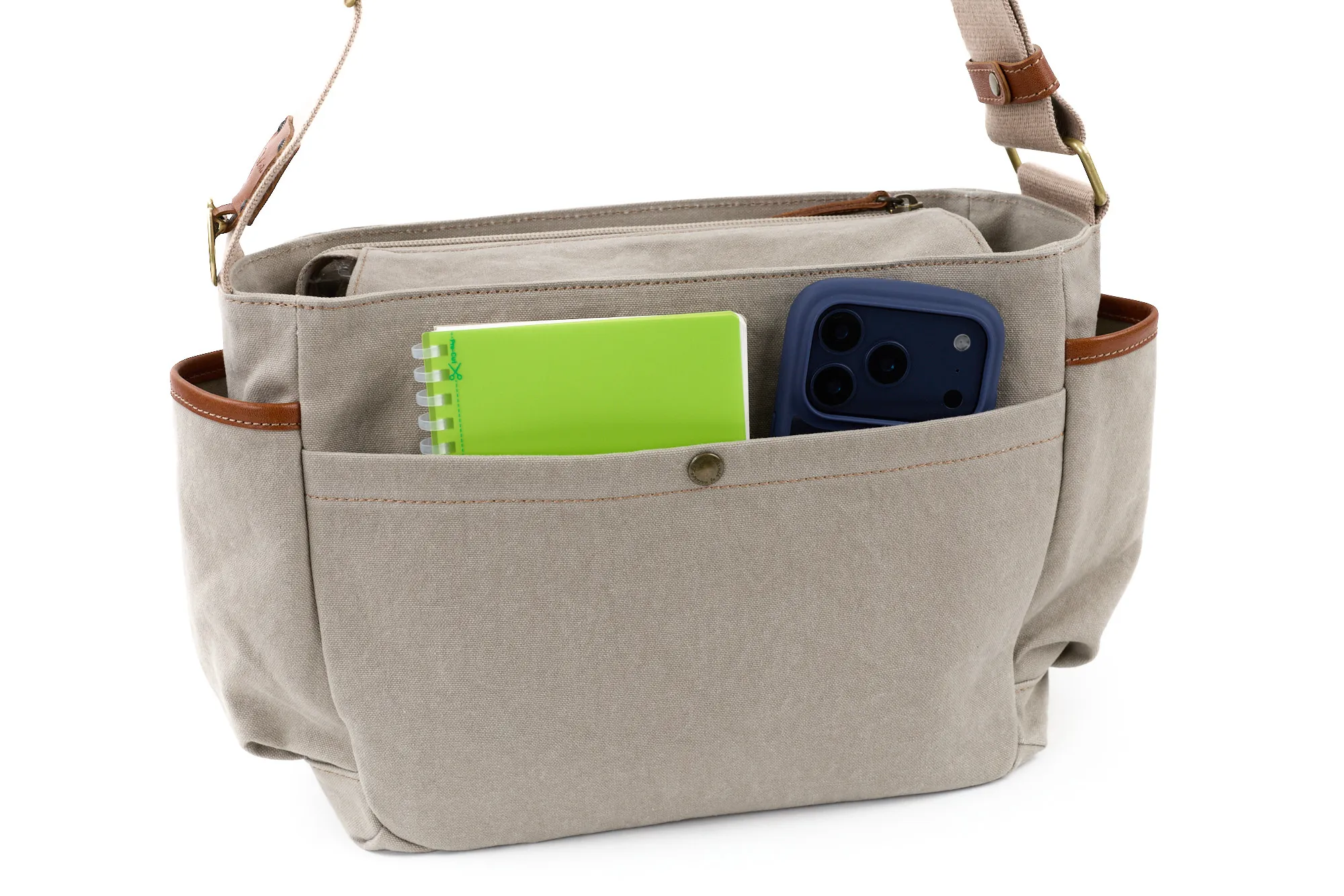 風合い豊かな布地と上質な牛革を組み合わせた、アンティーク調の雰囲気が魅力です。 落ち着きのある素材感が大人の装いに自然と馴染み、持つだけでシックな品格を添えてくれます。 横長のワイドシルエットは、B5サイズがすっきり収まる絶妙なバランス。 しっかりとマチ幅を確保しているため、マグボトルやポーチも余裕をもって収納でき、見た目以上の実用性を発揮します。
