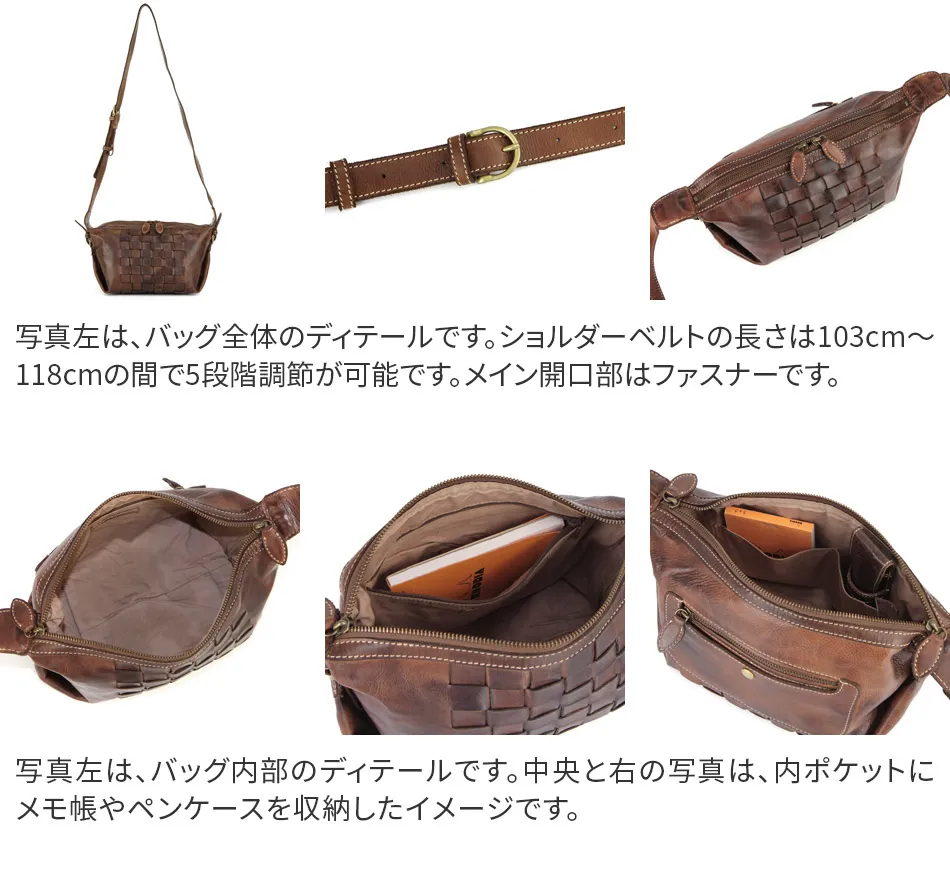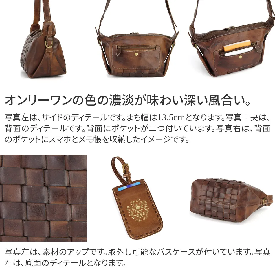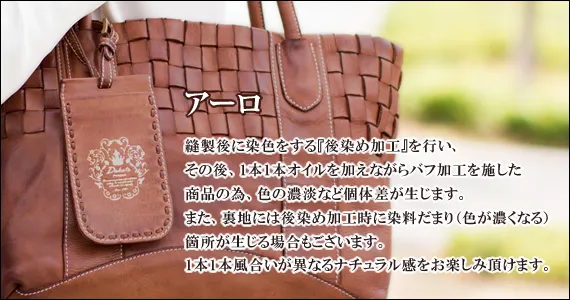 使い込んだかの様に、バフ加工を施したバッグ。 職人さんが1本1本手をかけていくので仕上がり感も1本ごとに異なります。 ~アーロシリーズ~ ≪素材の特性≫ 縫製後に染色をする『後染め加工』を行い、その後、1本1本オイルを加えながらバフ加工を施した商品の為、色の濃淡など個体差が生じます。 また、裏地には後染め加工時に染料だまり(色が濃くなる)箇所が生じる場合もございます。 1本1本風合いが異なるナチュラル感をお楽しみ頂けます。 バッグには取り外しが可能なパスケースが付属しています。 ナチュラル感が漂う逸品なので普段のコーデに馴染んでくれるのが嬉しいですね。