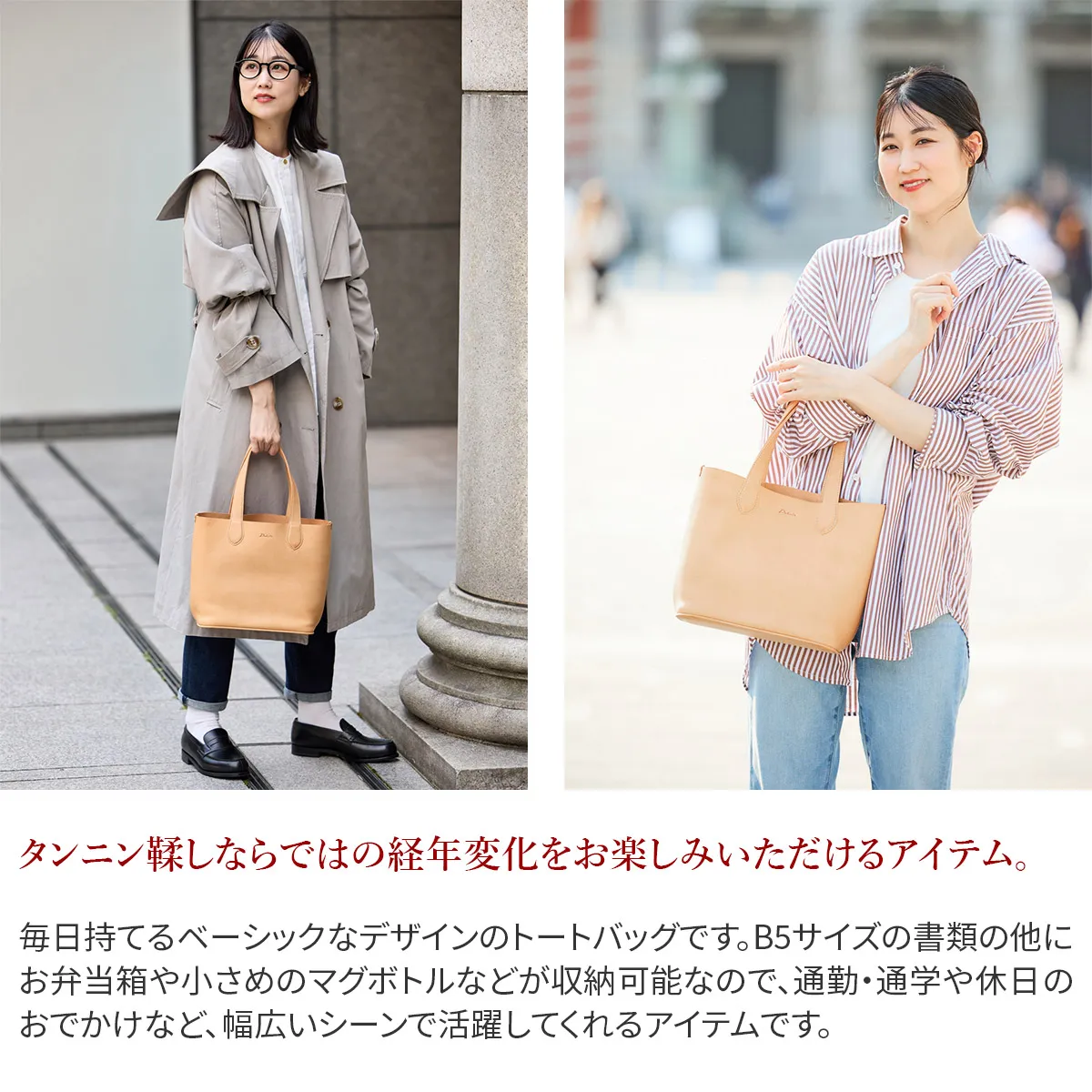 イタリア・トスカーナ州にある老舗タンナーでじっくりと丁寧に作られたフルベジタブルタンニン鞣しの牛革を使用しています。 イタリアンレザーの香りや手触り、日々使用する事で馴染んでいく経年変化をより楽しんで頂けるよう、一枚で仕立てられています。 時代に左右されないタイムレスなデザインで、デイリー使いにも最適なトートバッグです。 B5書類がスッキリ入るサイジングで、お仕事からプライベートまで幅広いシーンで活躍します。 マチが広く、見た目以上に高い収納力が嬉しいポイント。 使い込むほどに柔らかく、味わい深い表情をお楽しみいただけます。