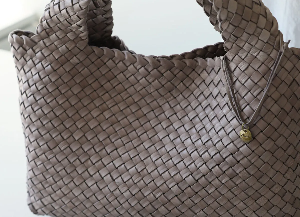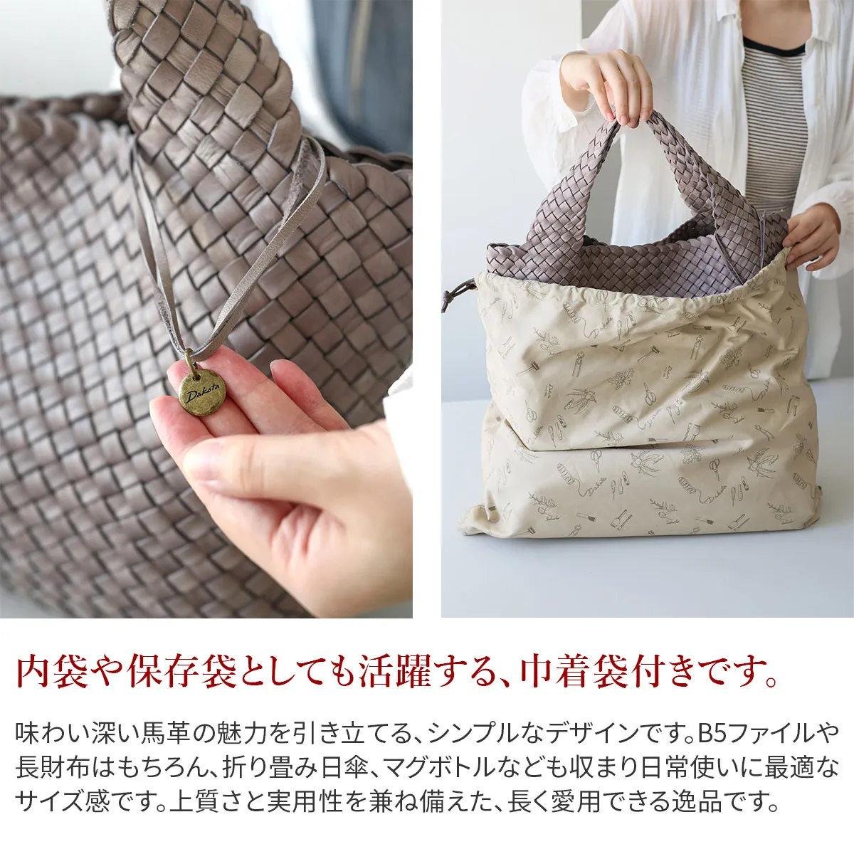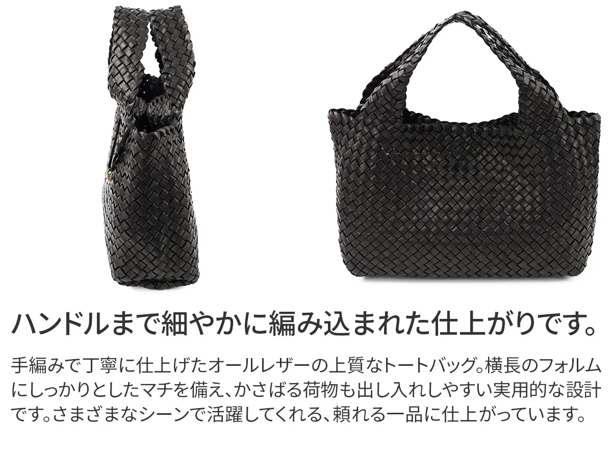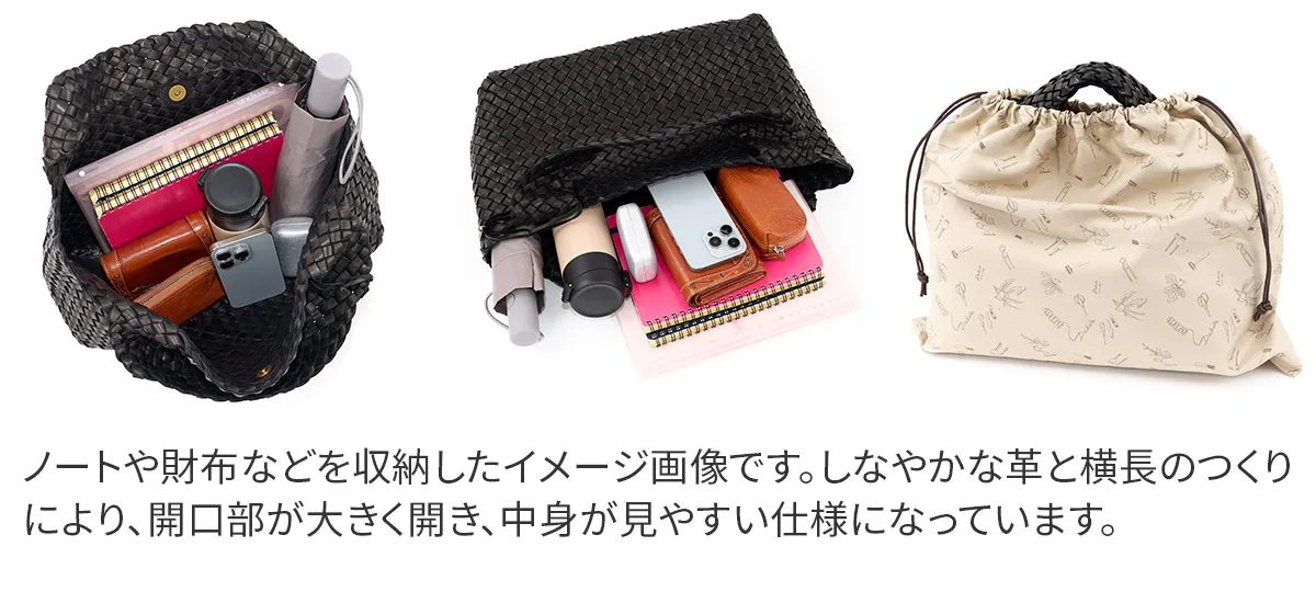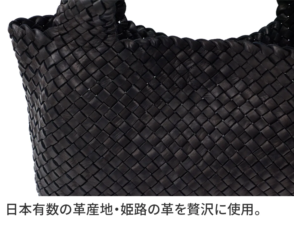 日本を代表する革の産地である姫路の馬革をたっぷりと使用しました。革本来の風合いが感じられる染料仕上げの革を持ち手まで編み上げることで馬革の滑らかな手触りを堪能できる贅沢なシリーズです。 味わい深い馬革の魅力を引き立てるシンプルなデザインに仕立てられています。B5ファイルや長財布、折り畳み日傘、マグボトルなどが余裕で収まり、日常使いに最適なサイズ感です。カジュアルからきれいめにも合わせやすく、オンオフ持てるアイテムとなっています。