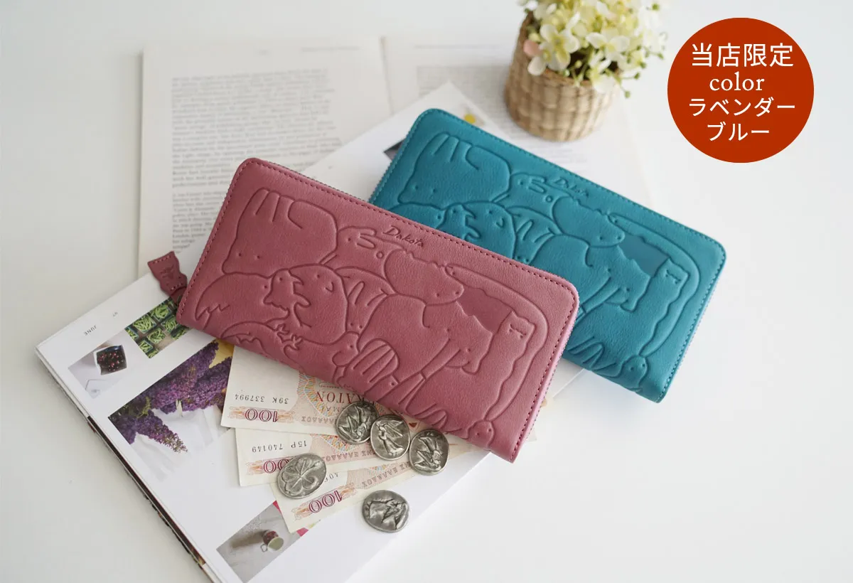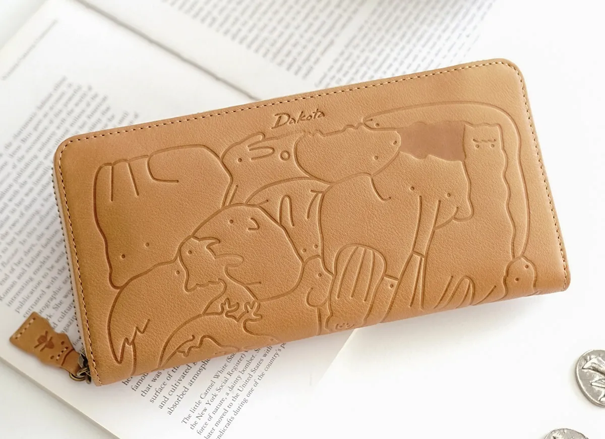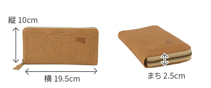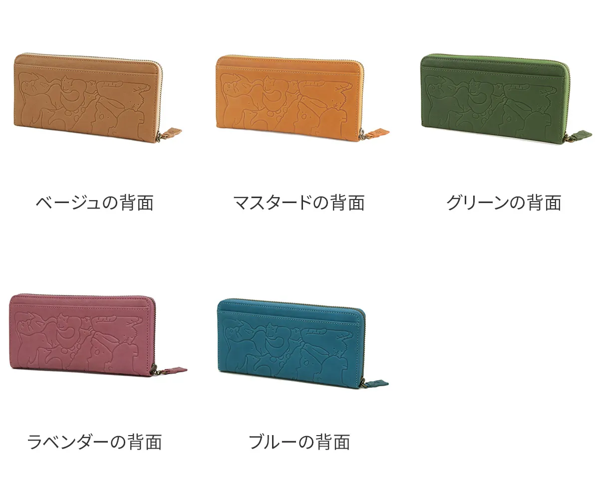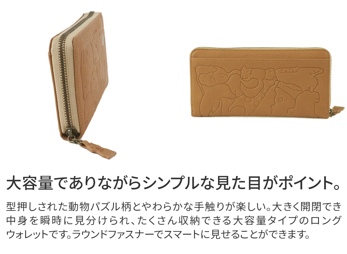 子供の頃を思い出す懐かしい動物パズルを素上げの革に型押ししました。 様々な動物がギュッと詰まった柄は見ているだけで楽しい気持ちにさせてくれます。 引手にはパズルのピースであるハムスターが使用されています。 どんな動物がいるのか探すのも楽しい遊び心いっぱいのシリーズです。 型押しされた動物パズル柄とやわらかな手触りが楽しい。大きく開閉でき中身を瞬時に見分けられ、 たくさん収納できる大容量タイプのロングウォレットです。ラウンドファスナーでスマートに見せることができます。