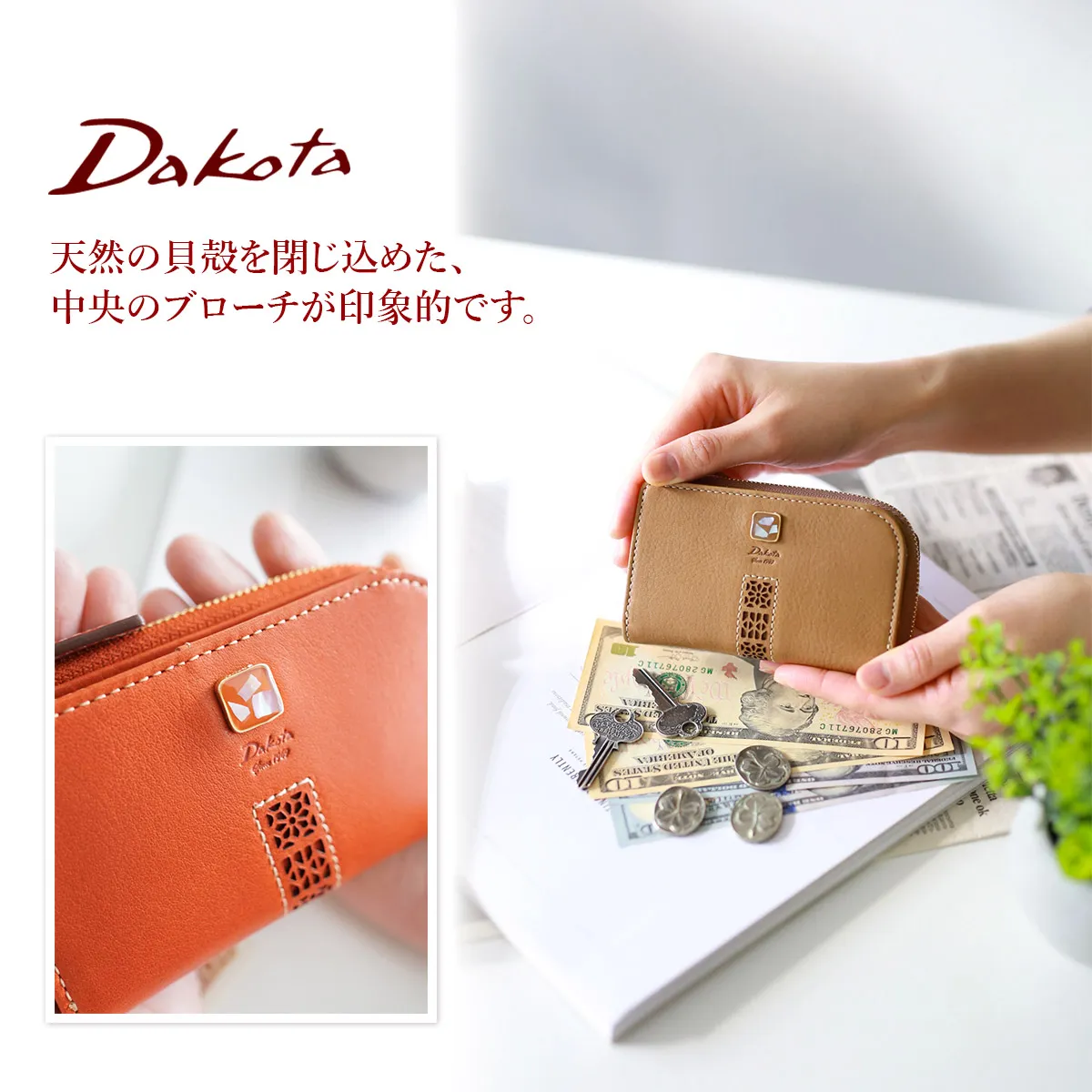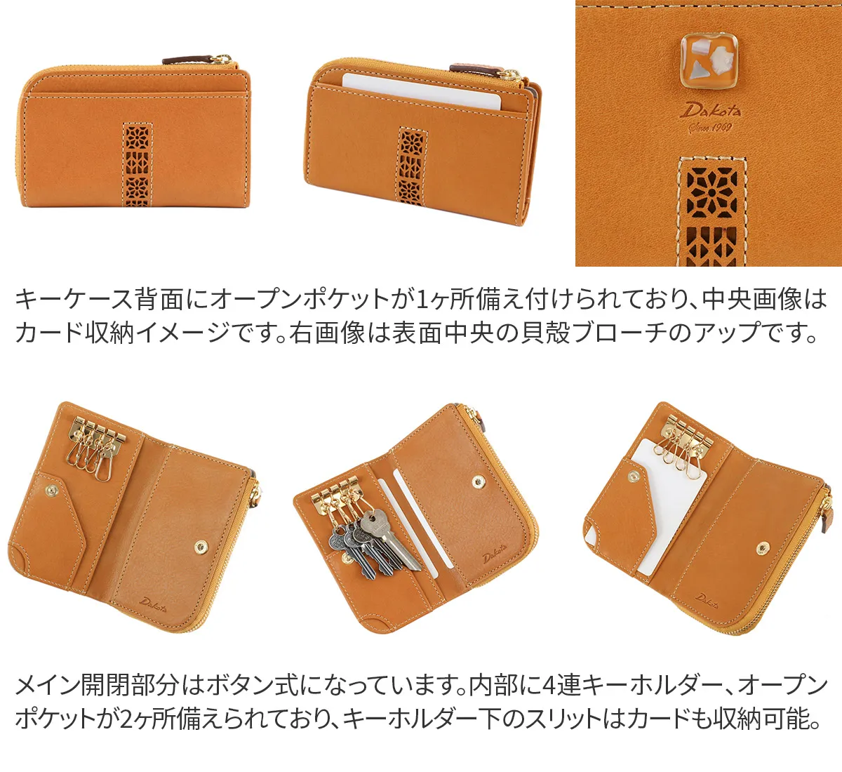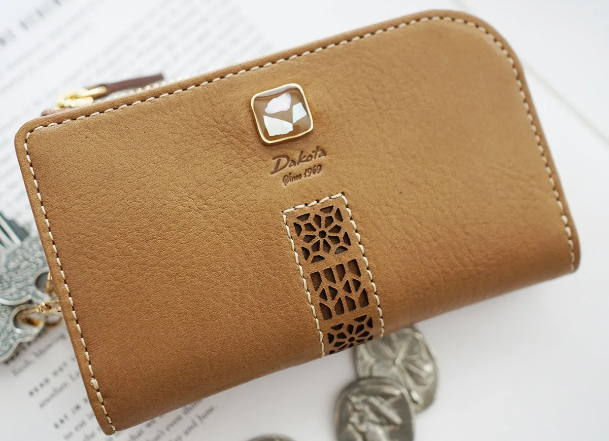 天然の貝殻が入ったブローチはサイドにスワロフスキーが埋め込まれ、可憐な女性らしさを感じさせます。レザーの透かしのカットワークも相まり繊細な印象のシリーズとなりました。 古代から豊穣のお守りとされてきた貝殻、風水では財運アップのアイテムとして知られています。 光を反射してキラキラと輝くブローチと、華やかなカラーリングが魅力です。キーケース内部に、4連のキーホルダー、オープンポケットが2ヶ所備えられており、外部のファスナーポケットに硬貨と紙幣を収納いただけ、マルチに活躍します。