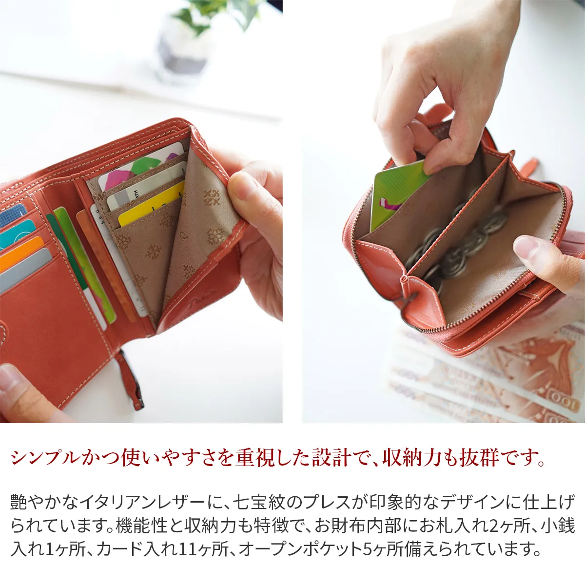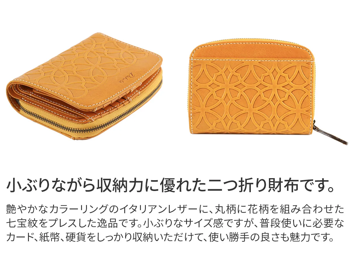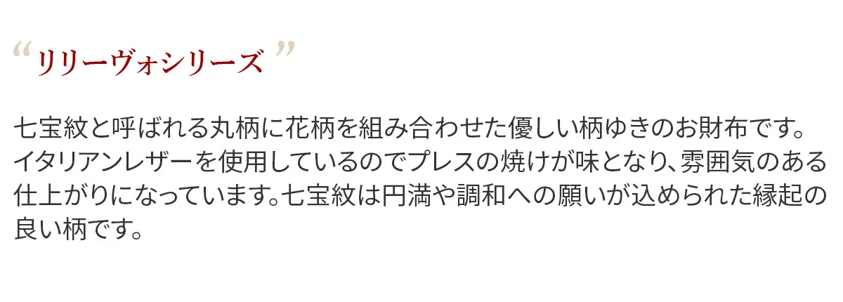 七宝紋と呼ばれる丸柄に花柄を組み合わせた優しい柄ゆきのお財布です。 イタリアンレザーを使用しているのでプレスの焼けが味となり、雰囲気のある仕上がりになっています。七宝紋は円満や調和への願いが込められた縁起の良い柄です。 艶やかなイタリアンレザーに、七宝紋のプレスが印象的なデザインに仕上げられています。機能性と収納力も特徴で、お財布内部にお札入れ2ヶ所、小銭入れ1ヶ所、カード入れ11ヶ所、オープンポケット5ヶ所備えられています。