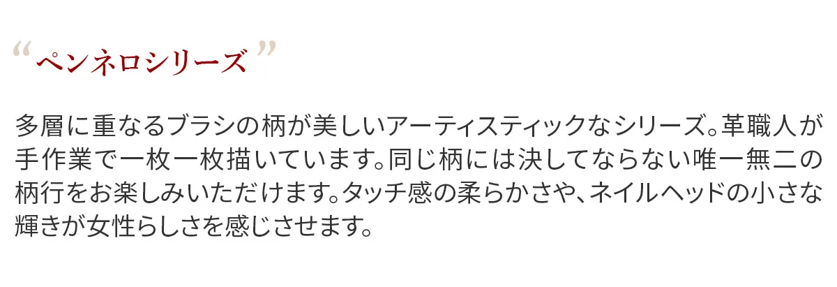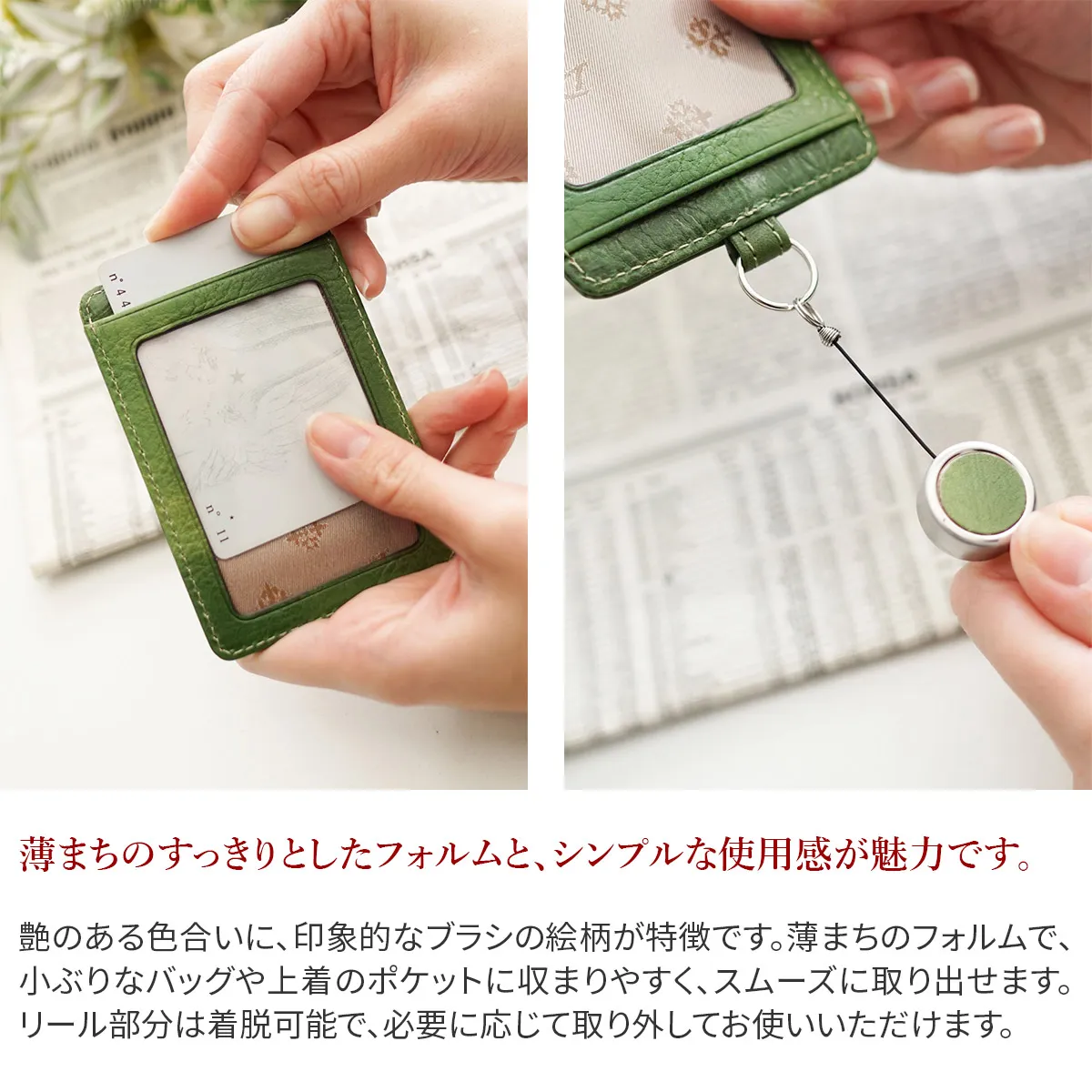 多層に重なるブラシの柄が美しいアティスティックなシリーズ。革職人が手作業で一枚一枚描いています。同じ柄には決してならない唯一無二の柄行をお楽しみいただけます。タッチ感の柔らかさや、ネイルヘッドの小さな輝きが女性らしさを感じさせます。 艶のある色合いに、印象的なブラシの絵柄が特徴です。薄まちのフォルムで、小ぶりなバッグや上着のポケットに収まりやすく、スムーズに取り出せます。リール部分は着脱可能で、必要に応じて取り外してお使いいただけます。