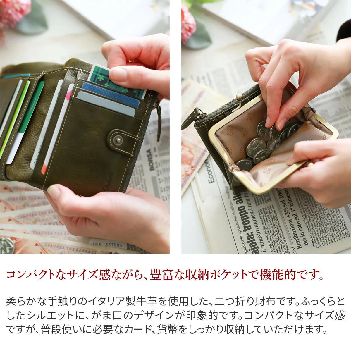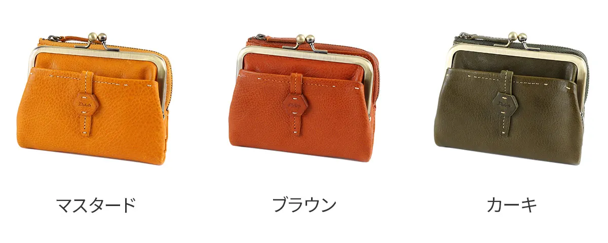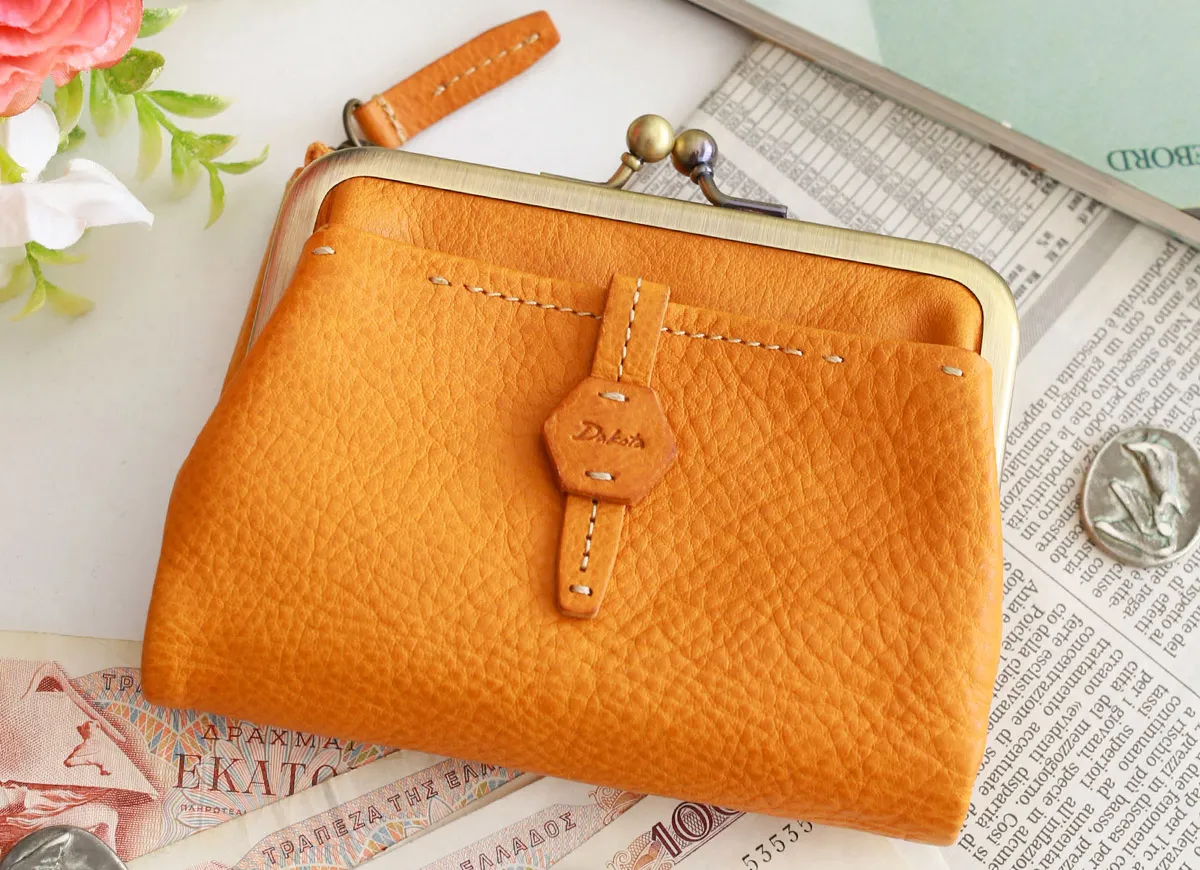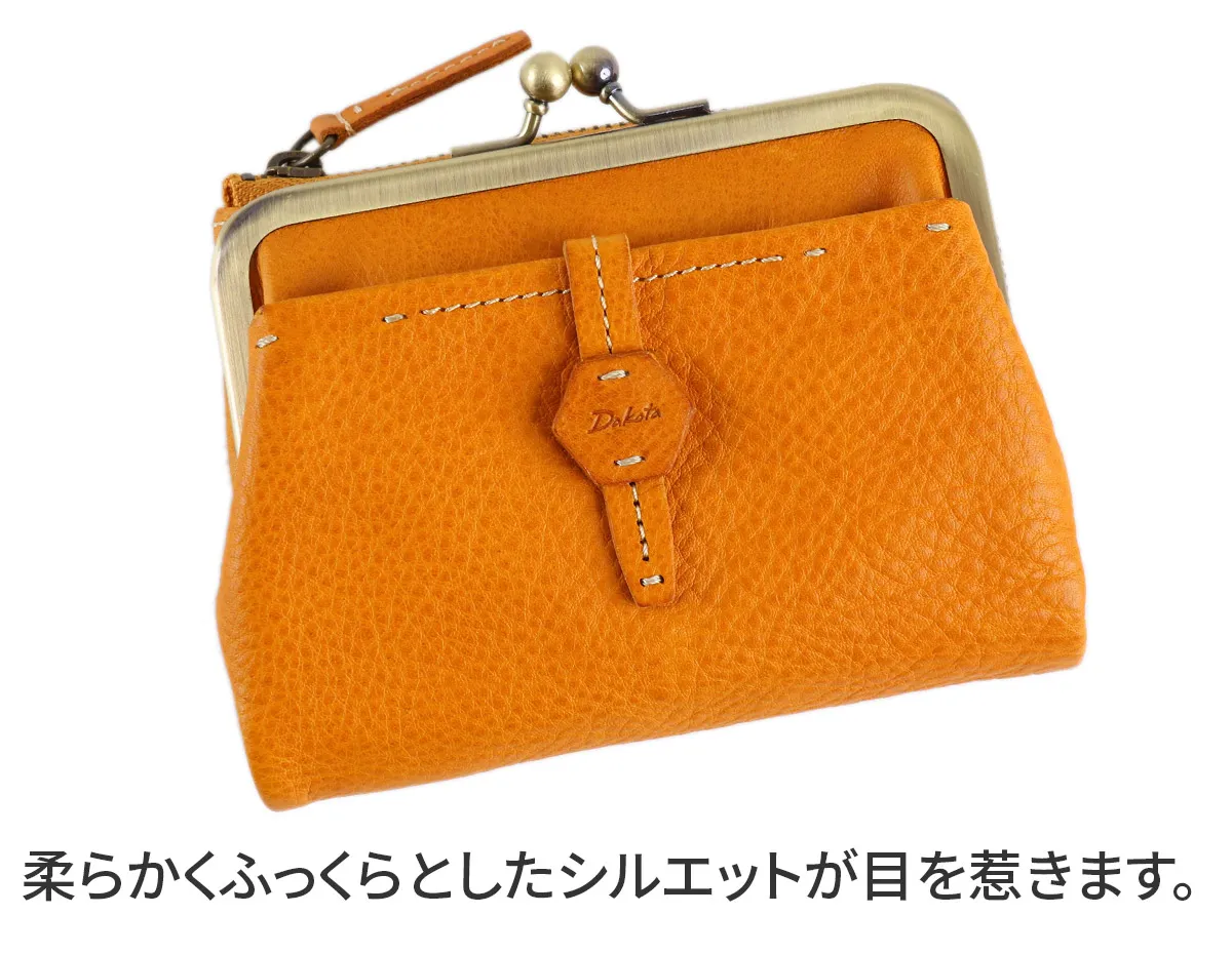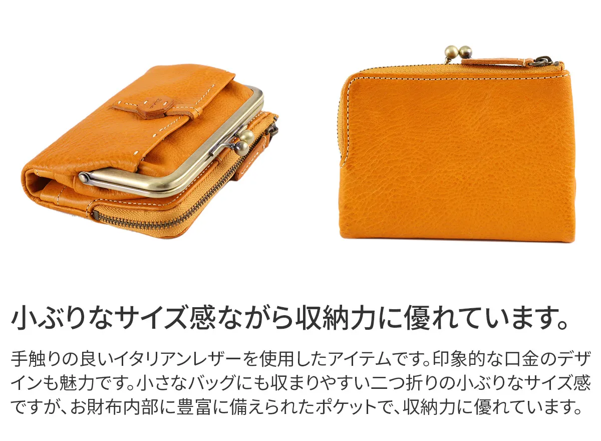 六角形の革のブローチが印象的なイタリアンレザーを使用したシリーズ。 植物タンニン鞣しのレザーを手作業で磨き、ナチュラルな風合いを出しています。 風水で「安定と調和」を意味する六角形をあしらったお守りの様な安心感のあるデザインです。 柔らかな手触りのイタリア製牛革を使用した、二つ折り財布です。ふっくらとしたシルエットに、がま口のデザインが印象的です。コンパクトなサイズ感ですが、普段使いに必要なカード、貨幣をしっかり収納していただけます。