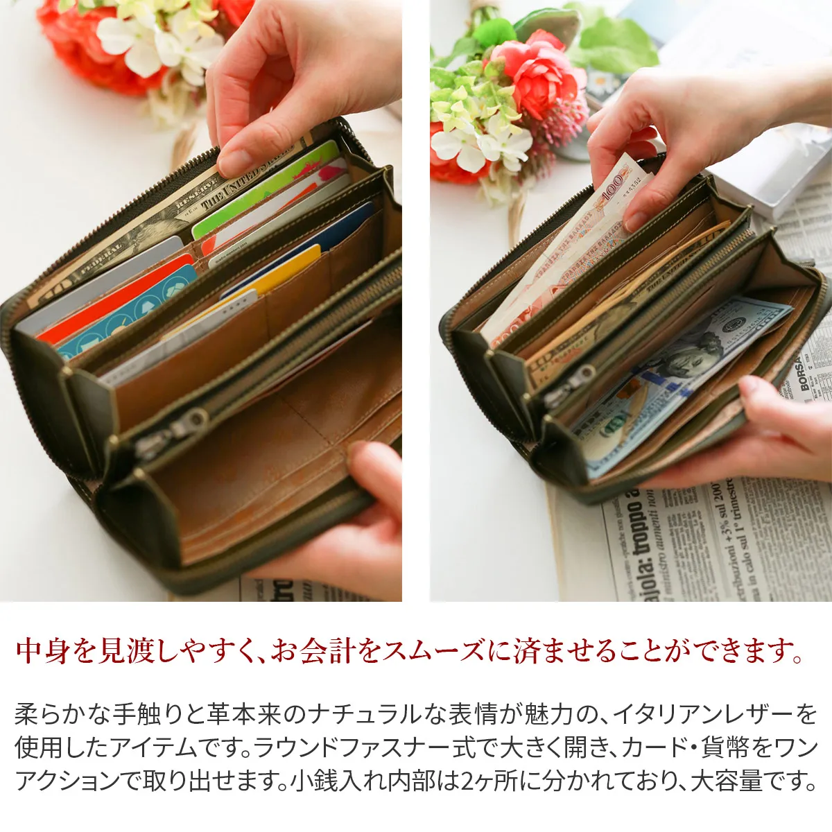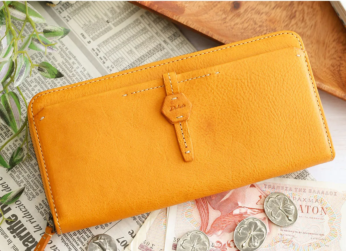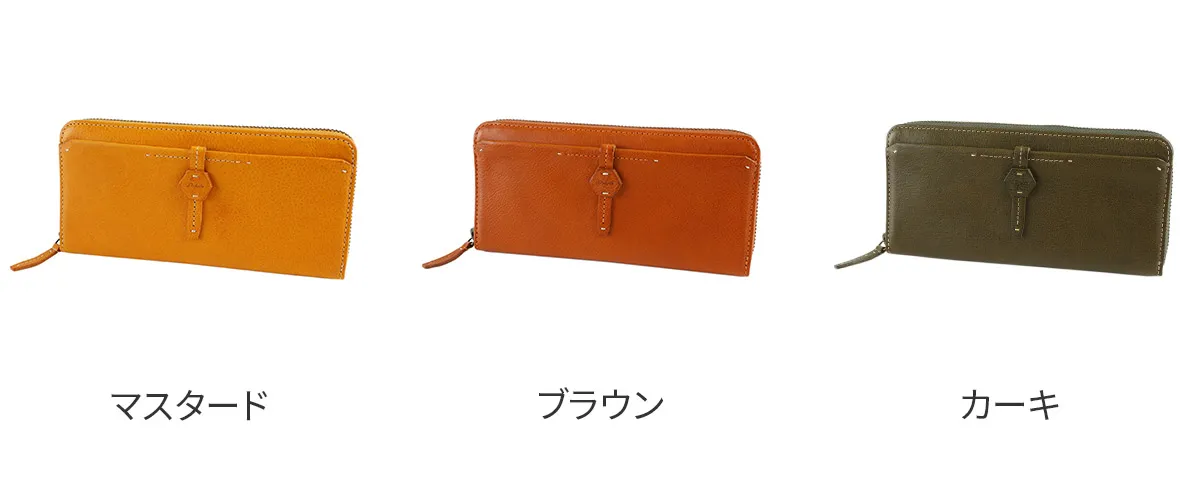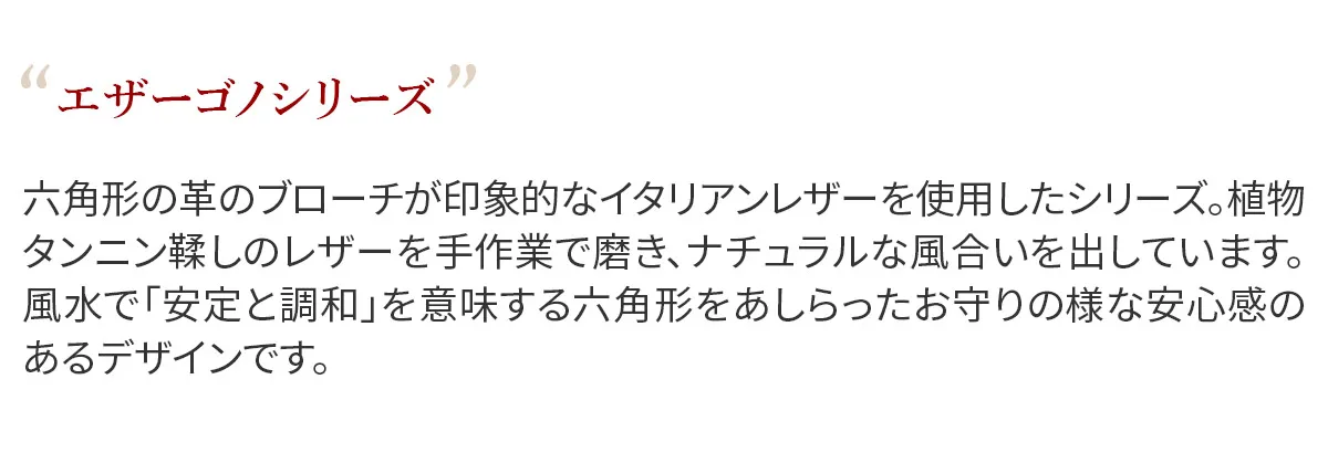 六角形の革のブローチが印象的なイタリアンレザーを使用したシリーズ。 植物タンニン鞣しのレザーを手作業で磨き、ナチュラルな風合いを出しています。 風水で「安定と調和」を意味する六角形をあしらったお守りの様な安心感のあるデザインです。 柔らかな手触りと革本来のナチュラルな表情が魅力の、イタリアンレザーを使用したアイテムです。ラウンドファスナー式で大きく開き、カード・貨幣をワンアクションで取り出せます。小銭入れ内部は2ヶ所に分かれており、大容量です。