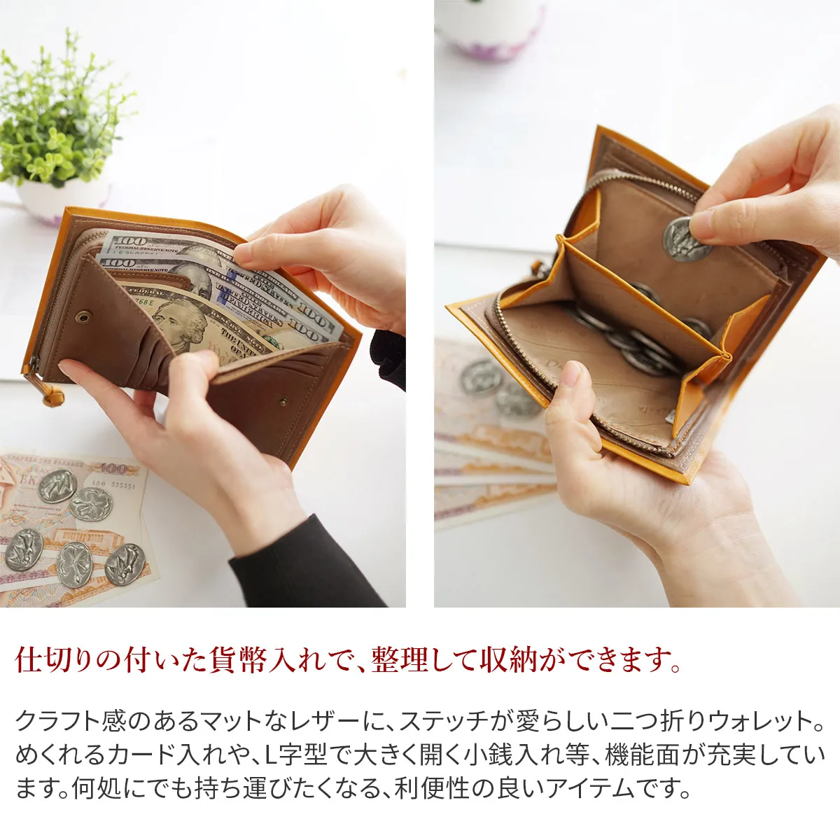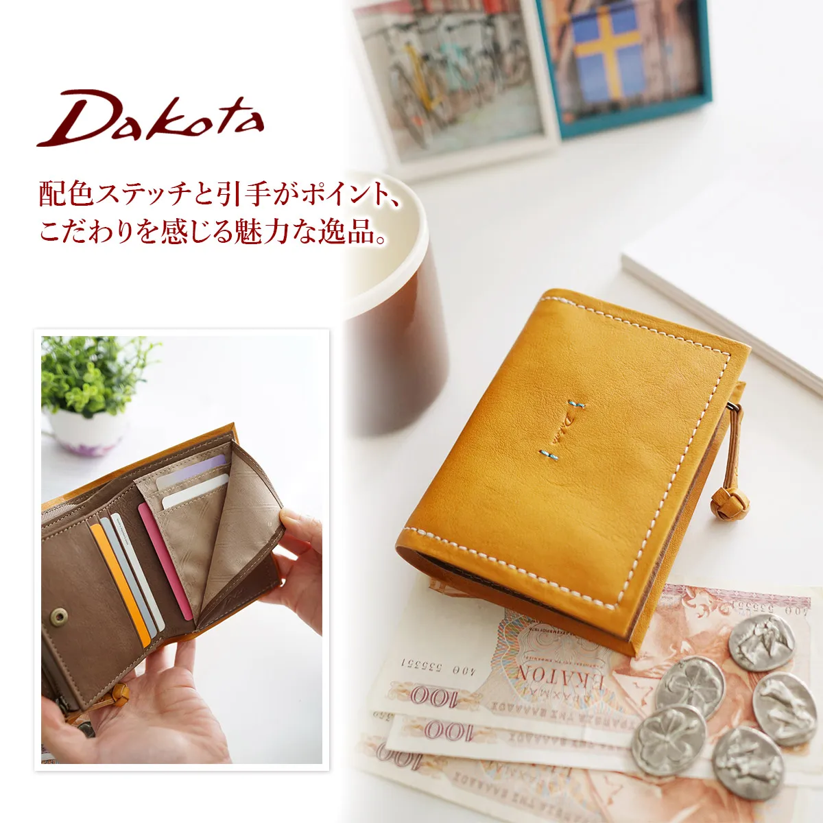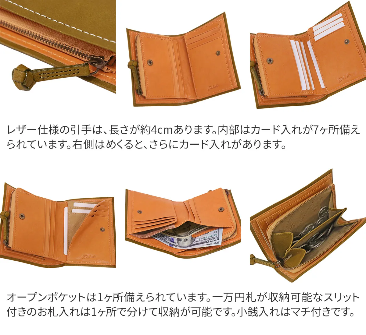 シンプルだけど違いを感じる、そんな見え方にこだわったスッキリした四角いフォルムが印象的なシリーズです。財布の端を大きく折り返し中作りと共に太いステッチで纏める新しい仕立て方をしています。引手は「釈迦結び」という結び玉を時間をかけて編み込み、クラフト感と引きやすさを兼ね備えたアクセントになっています。 ステッチの配色が映える、シンプルなデザインで飽きが来ない魅力的なウォレット。2層式のカード入れ、レシートや領収書等の収納に便利なポケットが備えられており、整理整頓をして収納する事ができます。また、仕切りの付いた貨幣入れは、種類で仕分けができるのでお支払いの時に便利です。