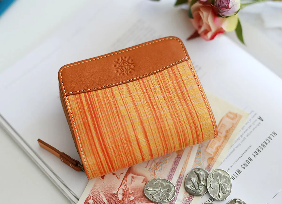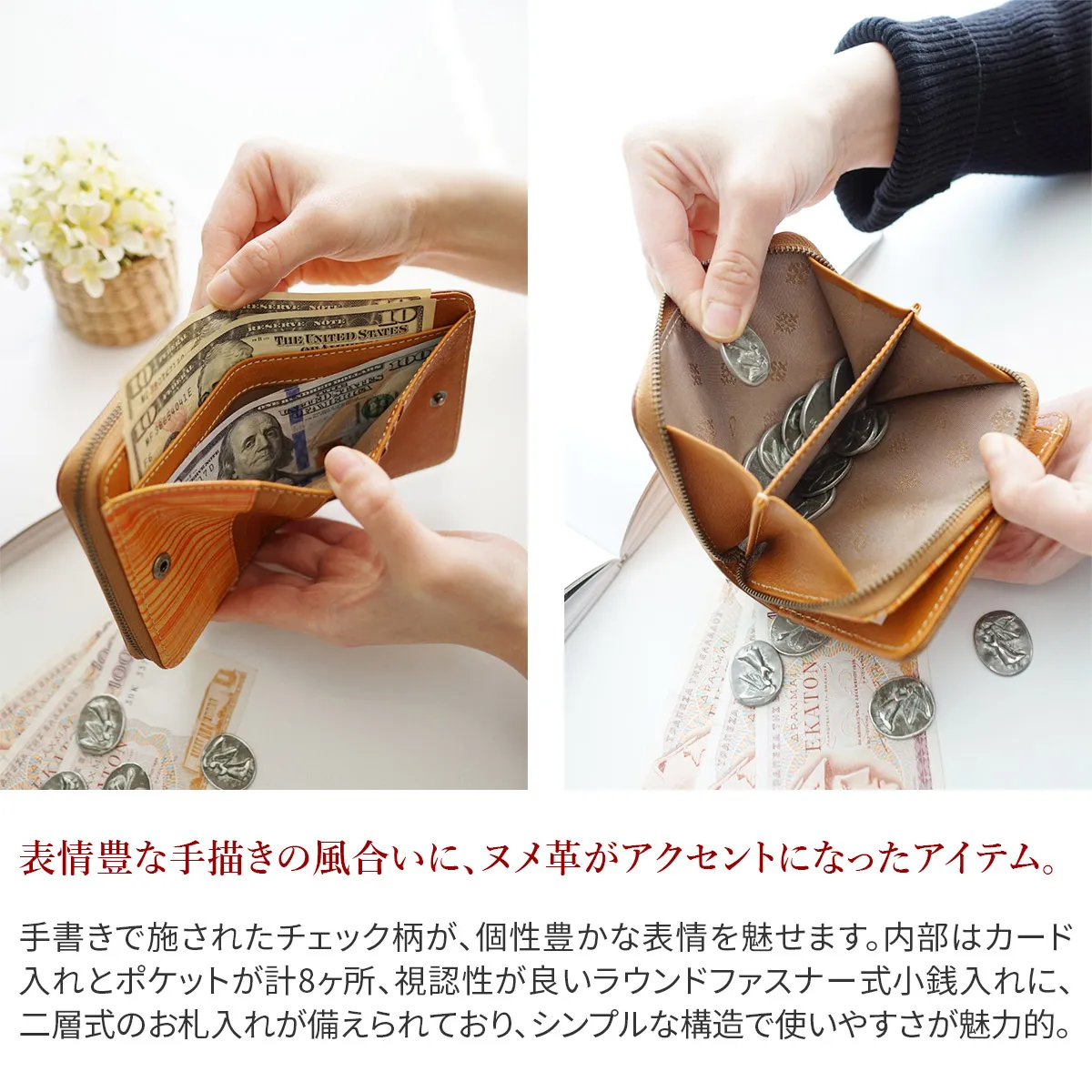 ブラウンのヌメ革とチェック柄の革を組み合わせたアトリエシリーズ。チェック柄は、兵庫県たつの市の革職人が1点1点手描きで施したものです。経年変化が楽しめる植物タンニン鞣し革に唯一無二の柄ゆきが合わさって使うほどに愛着が増すお財布シリーズです。 クラフト感のある、温かみあふれる大人カジュアルな印象が目を惹く二つ折りウォレット。充実したカード入れに、二層式の貨幣入れで整理して収納が可能。どこにでも持ち運びたくなる、シンプルで使いやすいアイテムです。