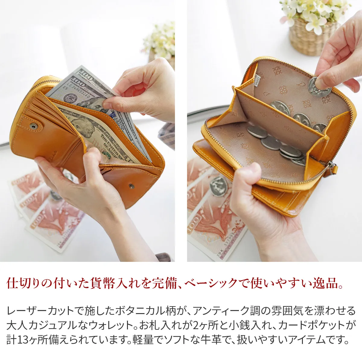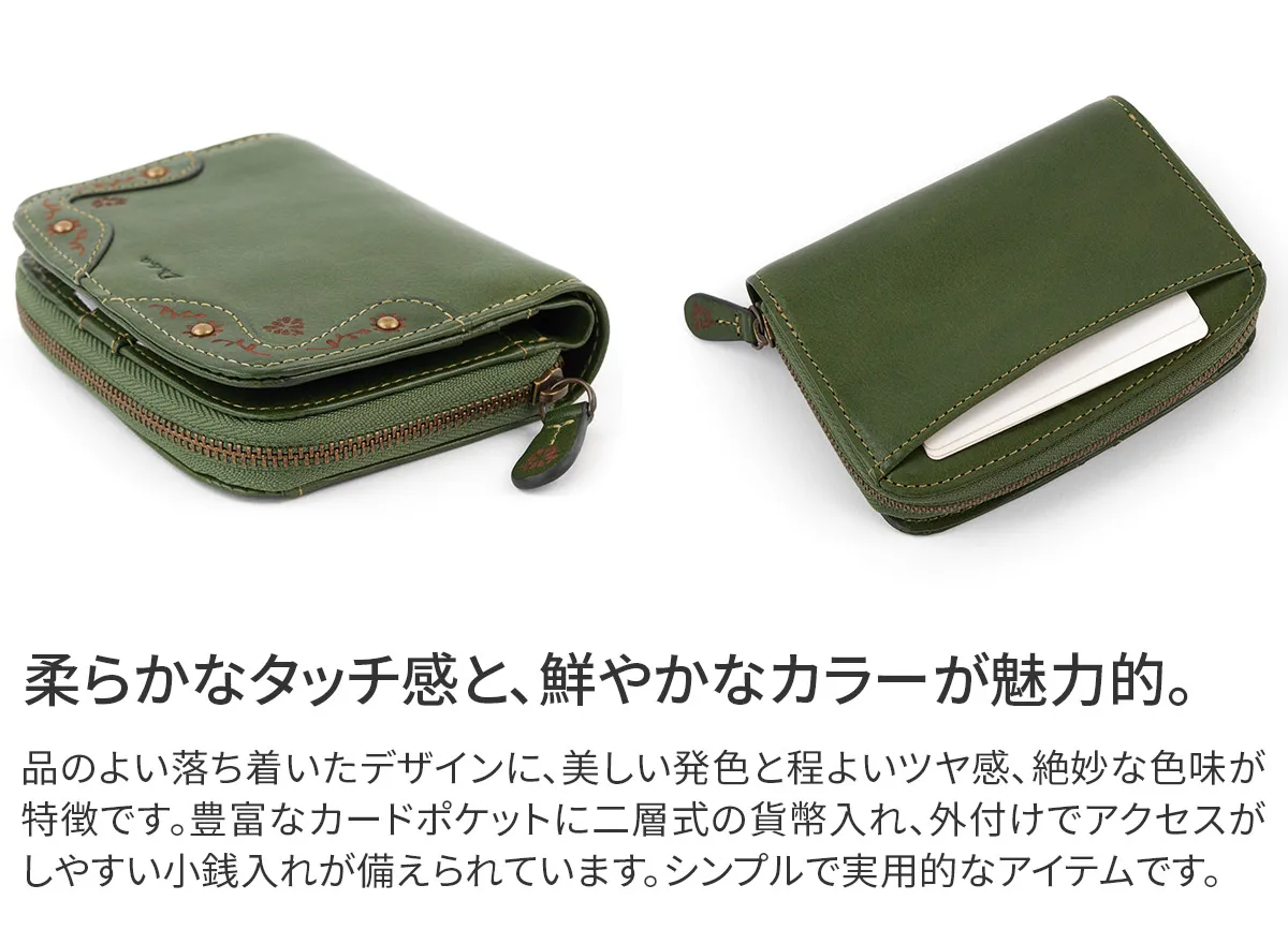 大切なお金をしまうお財布。風水の観点では「財布はお金の家」と考えられ、お金の居心地が良い空間を作ることで金運UPに繋がると言われています。そんな大切な家を守る「門」をイメージして、マーガレットで装飾されたお花の門のデザインを施しました。使うほどに艶や色の深みが増すイタリアンレザーとアンティーク感のある金具がマッチした、クラシカルな雰囲気のお財布シリーズです。 手にフィットするサイズ感の良い二つ折りウォレットです。しなやかな質感のイタリアンレザーを使用しています。内部はベーシックな仕様で十分な収納力を完備しています。二層式の貨幣入れは種類を分けて収納できるので、スムーズにお支払いをしていただけます。