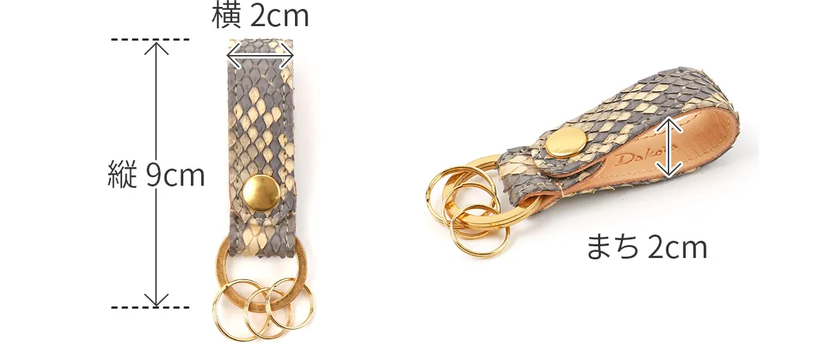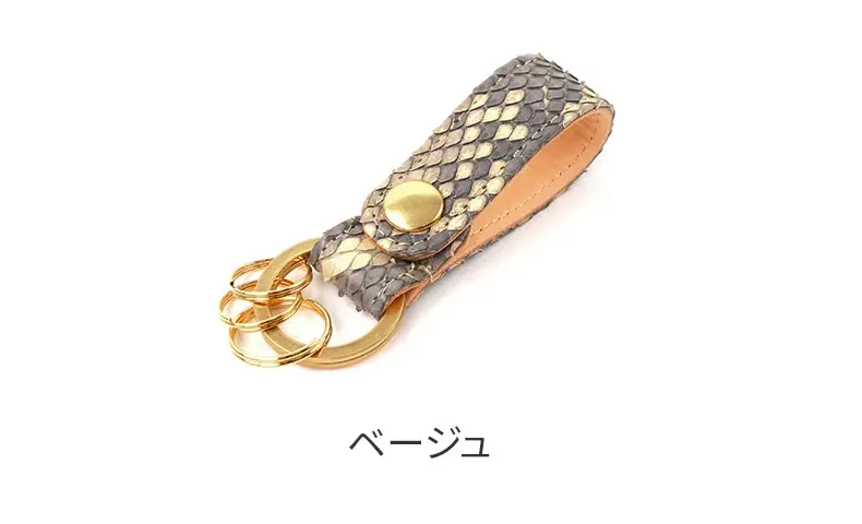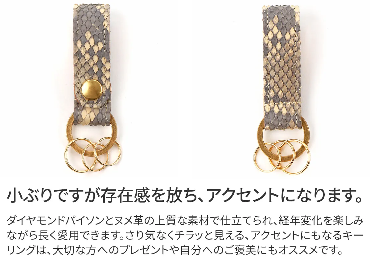 ダイヤモンドパイソンと国産のヌメ革を贅沢に使用した国内生産のシリーズです。表面は、全面にダイアモンド柄の模様がある事から「ダイヤモンドパイソン」と呼ばれるヘビ革を使用しています。ダイヤモンドパイソン特有の柄が美しく、素上げの仕上げとなっており、触り心地良く仕上がっています。表のヘビ革も内装のヌメ革も使う程に艶が増し、美しい光沢を纏ってゆきます。経年変化をしっかりと楽しめます。数量限定で製作された大変貴重なアイテムです。 綺麗に並ぶ細かなダイヤ柄の斑紋が美しいキーホルダーは、スナップボタン開閉でベルトやバッグに簡単に取り付け可能。裏地のヌメ革には、ブランドロゴと「MADE IN JAPAN」の素押しがさり気なく施されています。蛇革初心者の方でもファッション感覚で気軽に取り入れやすいアイテムとなっています。