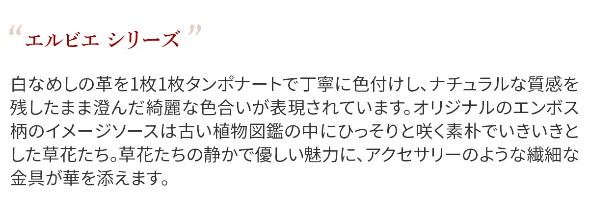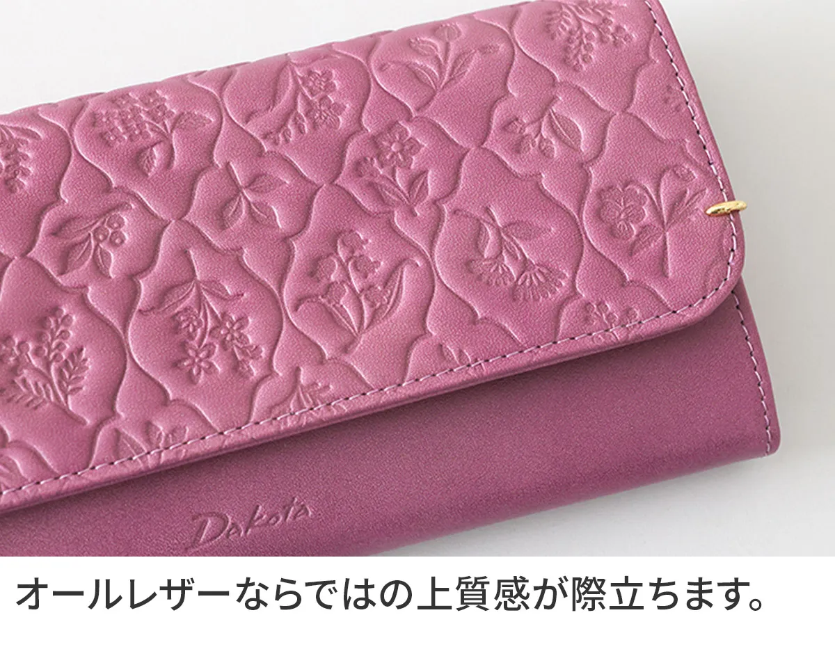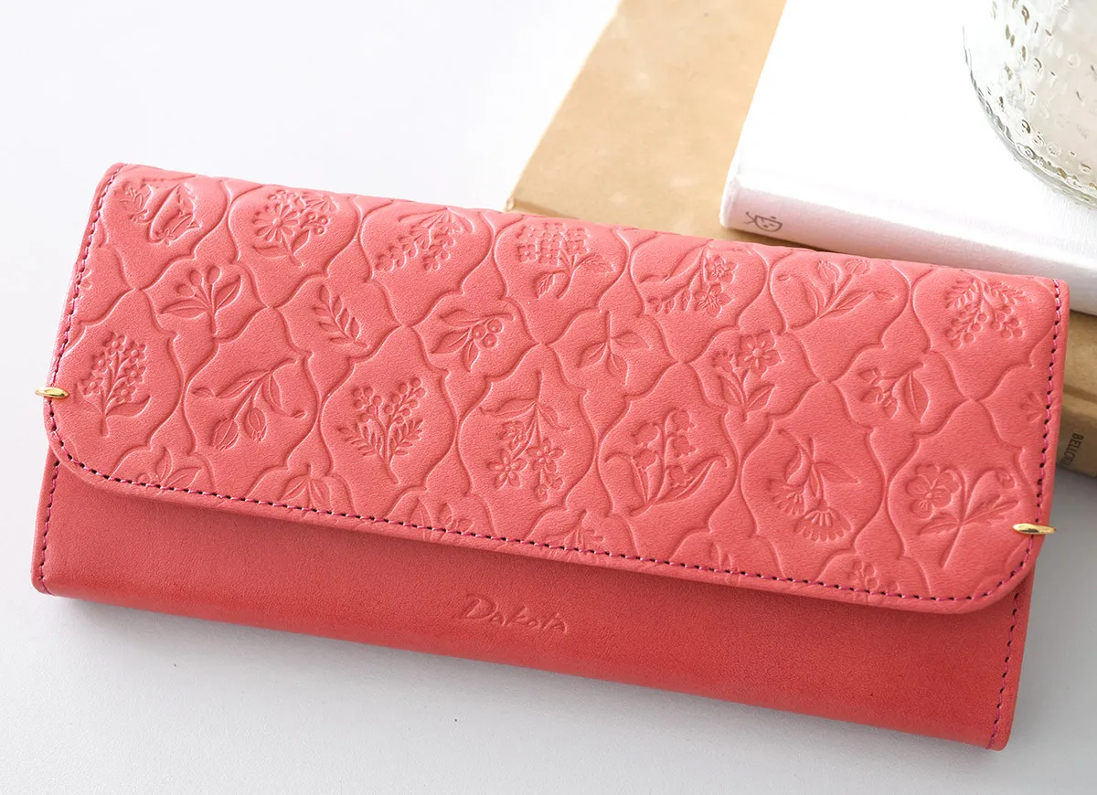 白なめしの革を1枚1枚タンポナートで丁寧に色付けし、ナチュラルな質感を残したまま 澄んだ綺麗な色合いが表現されています。 オリジナルのエンボス柄のイメージソースは古い植物図鑑の中にひっそりと咲く素朴でいきいきとした草花たち。 草花たちの静かで優しい魅力にアクセサリーのような繊細な金具が華を添えます。 優しい色合いに花柄のエンボス加工が上品に調和した長財布。ゴールド金具がさりげなく輝き、洗練されたアクセントを添えます。豊富な仕切りにより中身を美しく整理でき、大容量の収納力も魅力です。大きくトレーのように広がる小銭入れが、視認性と取り出しやすさを高め、日常の所作をよりエレガントに演出します。