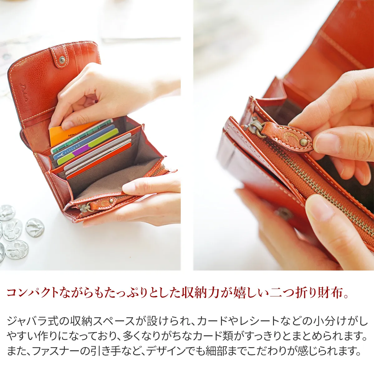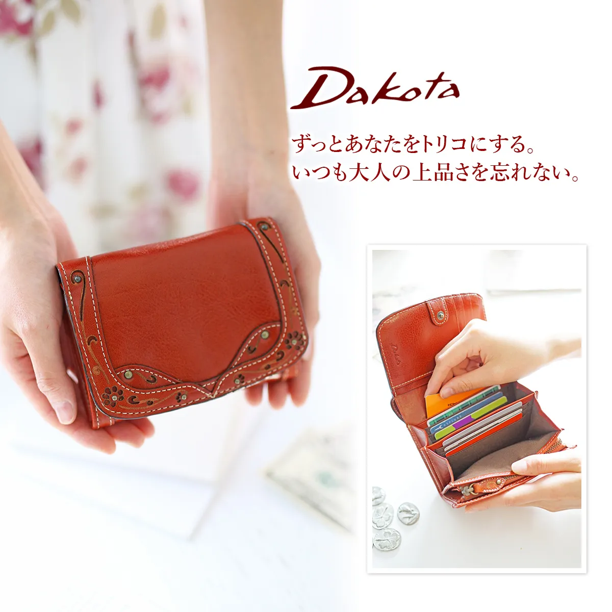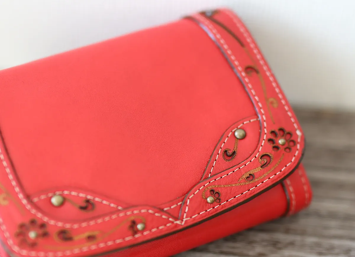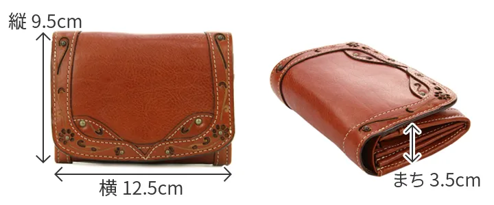 クラシックな額どりに、小花柄をあしらったポエティックなシリーズです。ヌメ革とレザーカットのクラフト感がナチュラル&フェミニンな女性らしさを引き立てます。 小銭入れはジャバラ式で見やすく、カード入れも充実していて、とても使い勝手の良い財布です。