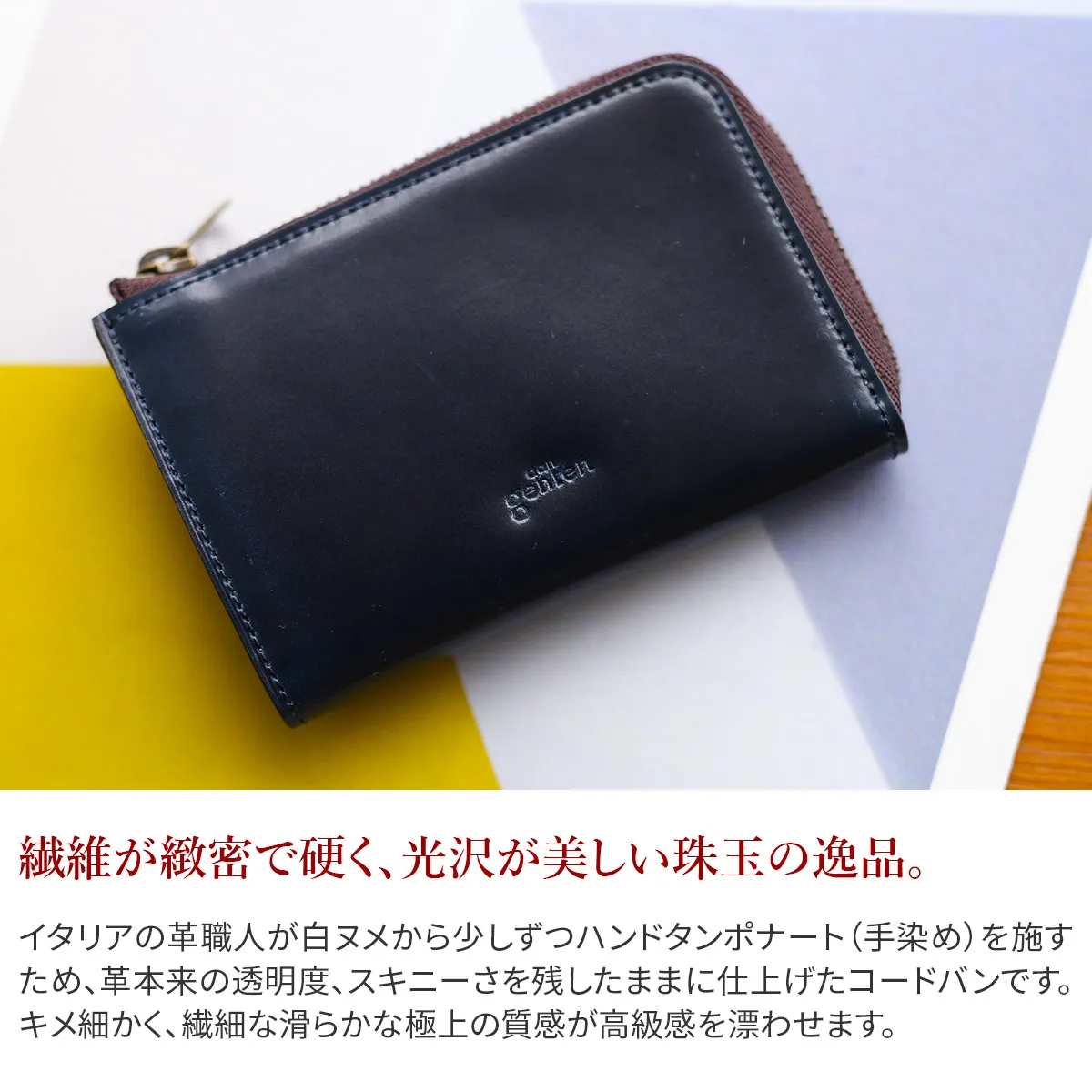 イタリアン製コードバンを贅沢に使用したミニウォレットとスモールグッズのシリーズ。 味わい深い奥行きのあるコードバンならではの銀先と、その革の魅力を最大限に活かすべく、質実剛健に仕上げられています。 その指先で触れるたびに伝わってくる、まるで陶器のようなコードバンならではの極めて繊細な滑らかさが、ひときわ用具としての愛着を深める所以です。