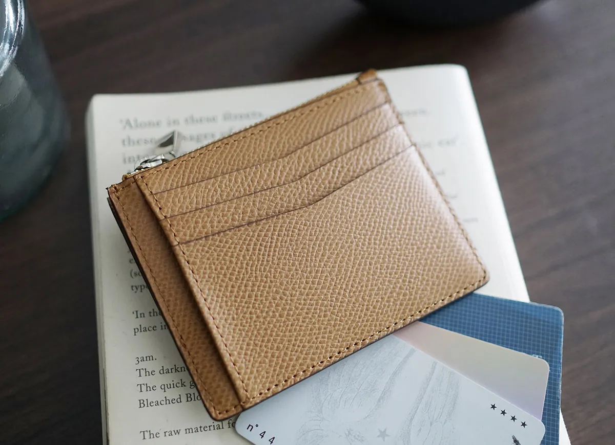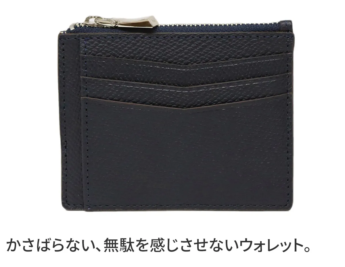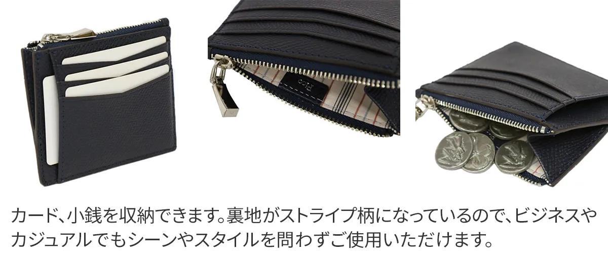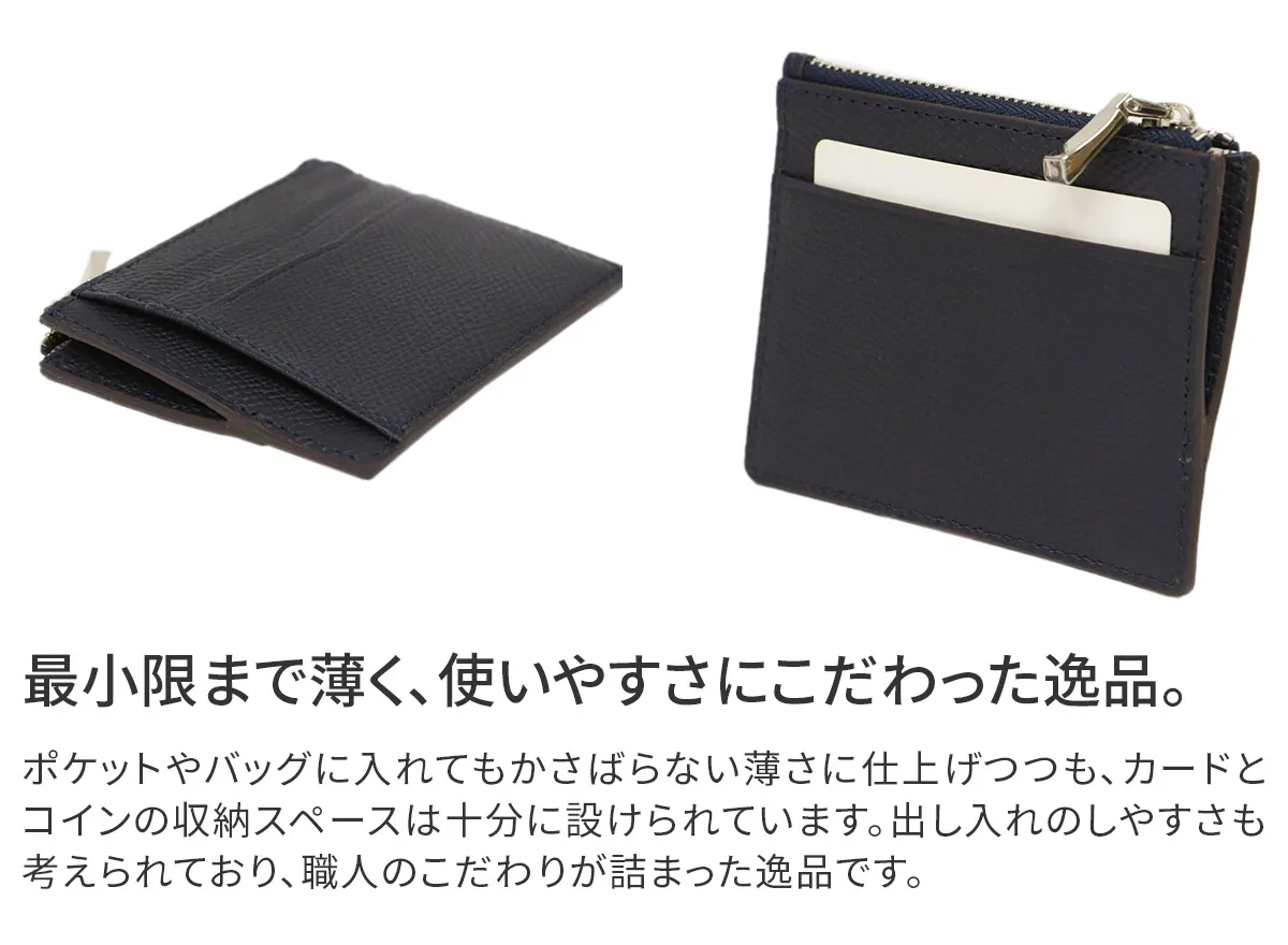 オーセンティックな佇まいにリラックス感とカジュアル感をプラスしたシリーズ。 “手のひらサイズ”をキーワードに、コンパクトなレザーグッズを展開。 ドイツ車のカーシートにも使用されている牛革原皮を使用。 職人がパテで下地の表面を均一にならしていく。顔料で色付け後、型を押す。 型の頭をプリンティングマシーンを用いて染料で頭貼りを行う。また頭貼りをしない黒、ネイビー等の濃色は染料をスプレー吹きし透明感を出しています。 手に馴染むしなやかさと ラフに使っても気にならない堅牢さを持ち合わせています。 使いやすさにこだわったカード&コインケース。出し入れしやすいようコインケース部分を底上げするなど、使いやすいデザインになっています。 ポケットに入れてもかさばらない大人スマートなアイテムです。