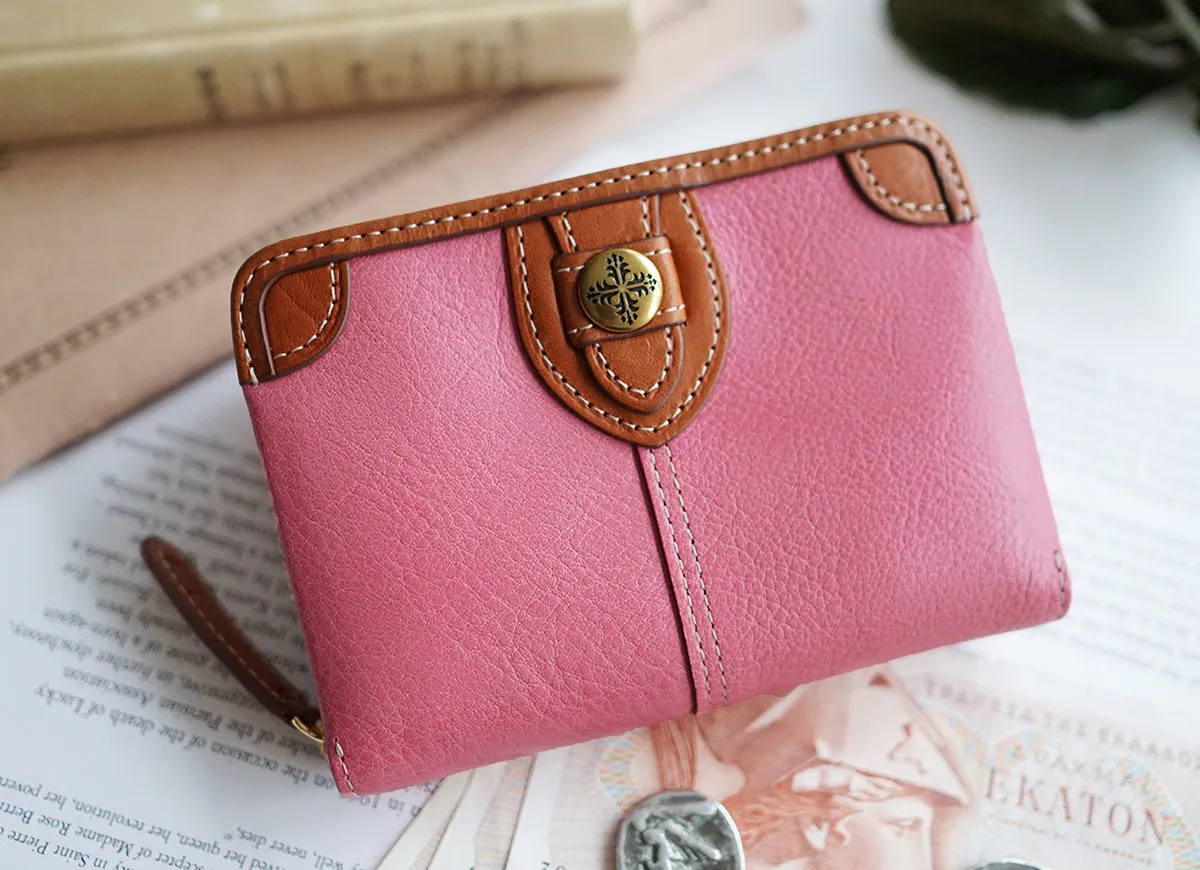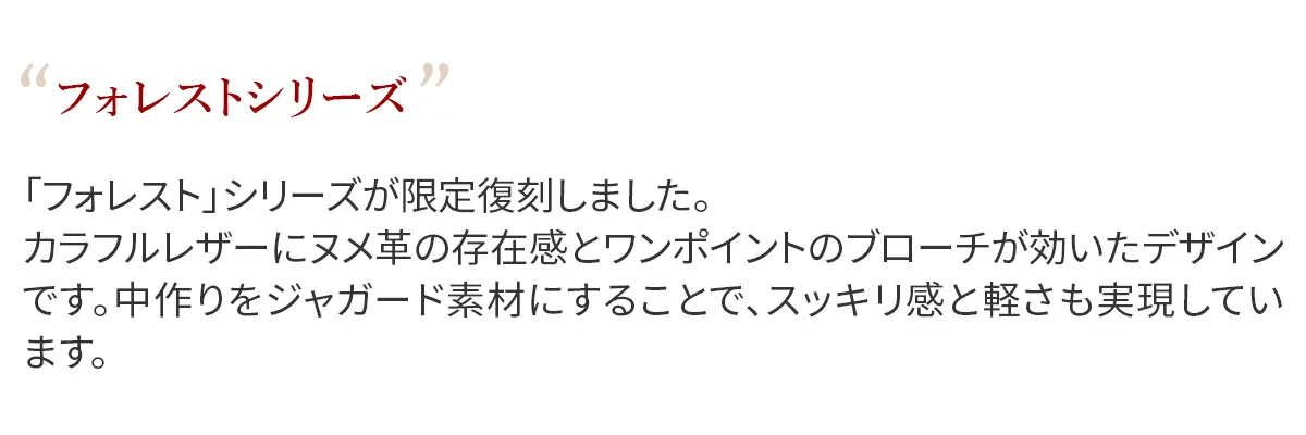 「フォレスト」シリーズが限定復刻しました。カラフルレザーにヌメ革の存在感とワンポイントのブローチが効いたデザインです。中作りをジャガード素材にすることで、スッキリ感と軽さも実現したシリーズです。 発色の良いカラーバリエーションにレザーの縁取りがアクセントになったウォレット。しなやかで触り心地の良いレザーは扱いやすくお財布の開閉が楽にできます。カードとポケットは計12ヶ所、仕切りが備えられた貨幣入れは整理整頓ができ、中身を把握しやすいです。
