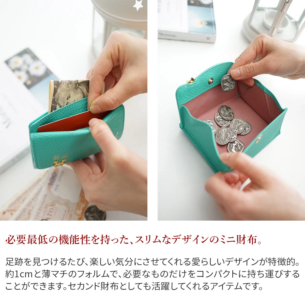 ブルーの目をしたいたずらっ子な子猫が愛らしいキトン(=子猫)シリーズ。 引っかき傷や足跡を表現した箔押しや内装の花柄生地など見つけると楽しいポイントが随所に散りばめられています。 必要最低限の貨幣やカードを、コンパクトにまとめて持ち運べるパスケース付きミニ財布。BOX式の小銭入れは取り出しやすくスムーズにお支払いができます。オープンポケットは2ヶ所備えられており、折りたたんだ紙幣を収納できます。キャッシュレス派の方や、セカンド財布としてもオススメなアイテムです。