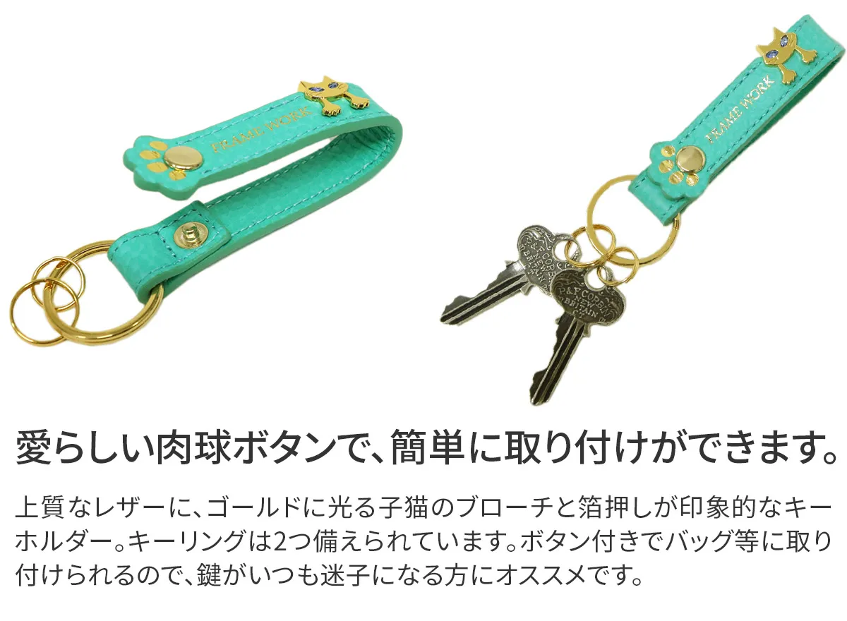 ブルーの目をしたいたずらっ子な子猫が愛らしいキトン(=子猫)シリーズ。 引っかき傷や足跡を表現した箔押しや内装の花柄生地など見つけると楽しいポイントが随所に散りばめられています。 子猫のキラキラと光るブルーの目が印象的で愛らしいアイテムです。キーリングは2つ備えられています。レザーストラップはボタン式でバッグに簡単に取り付けることができます。